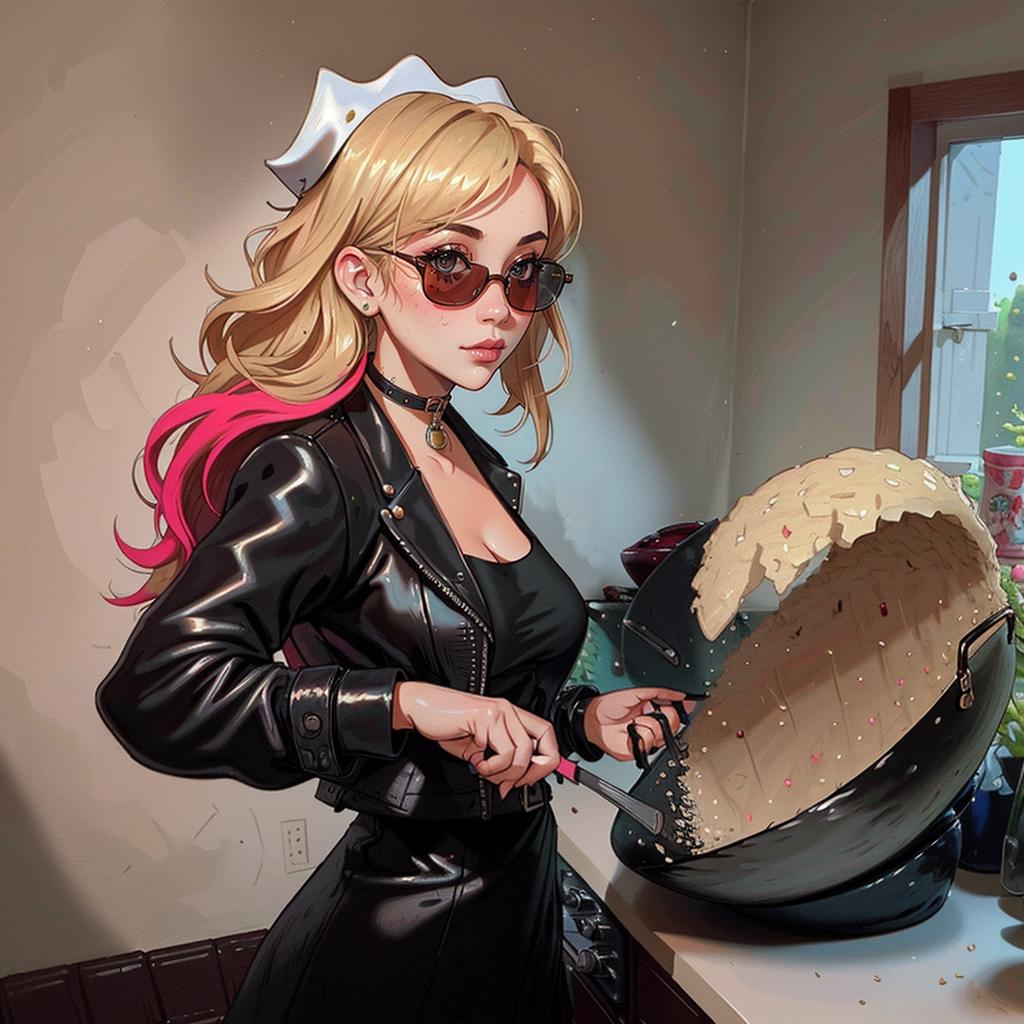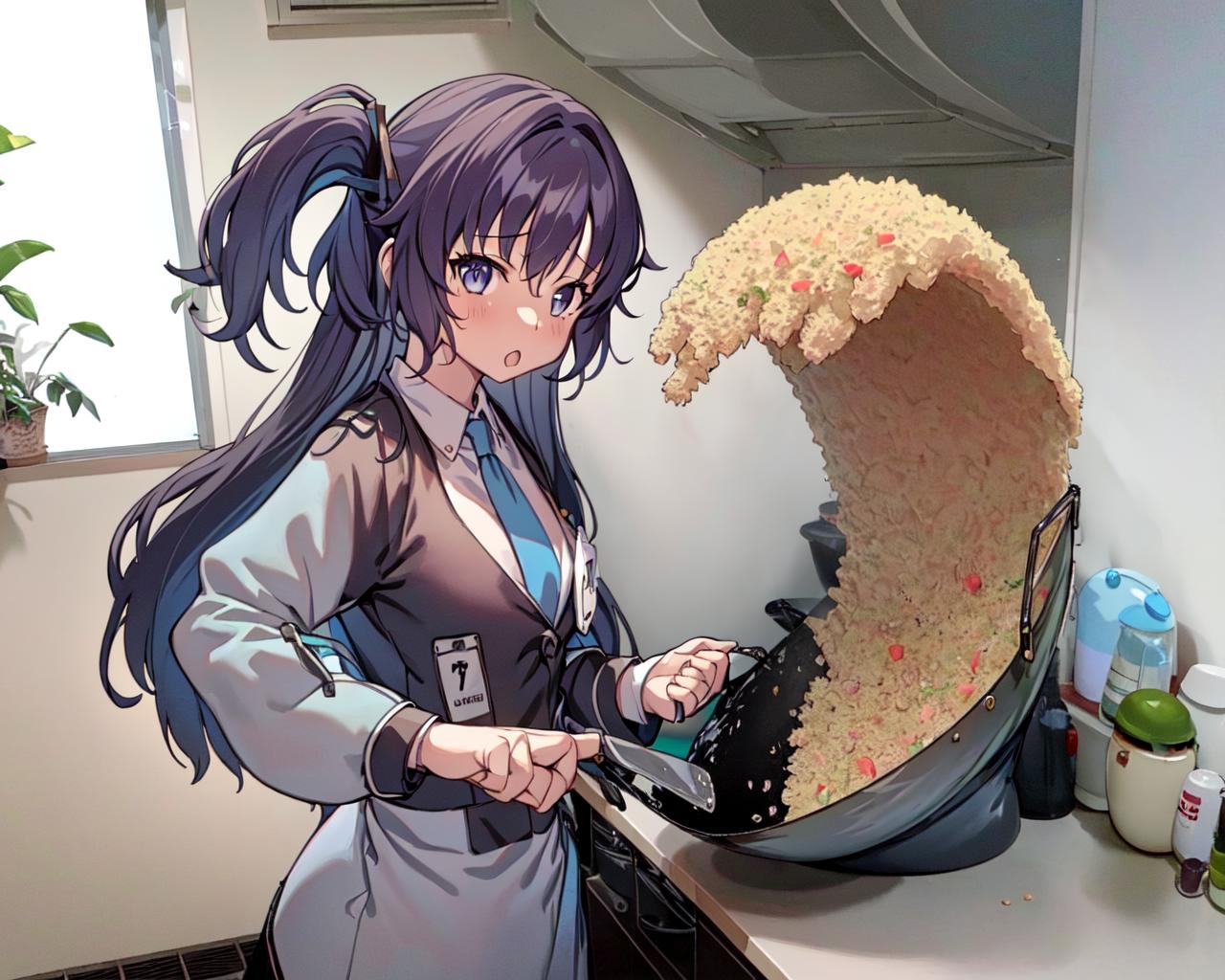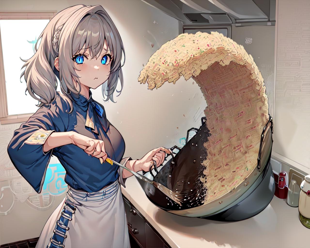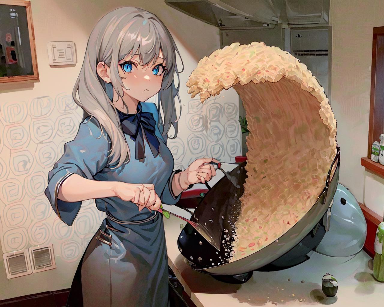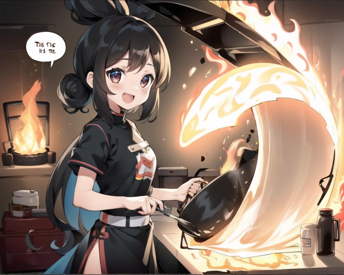 prompt: i used (1girl, solo,cooking, standing , looking at viewer, closed mouth, upper body), (kitchen, holding wok, Spatula)
