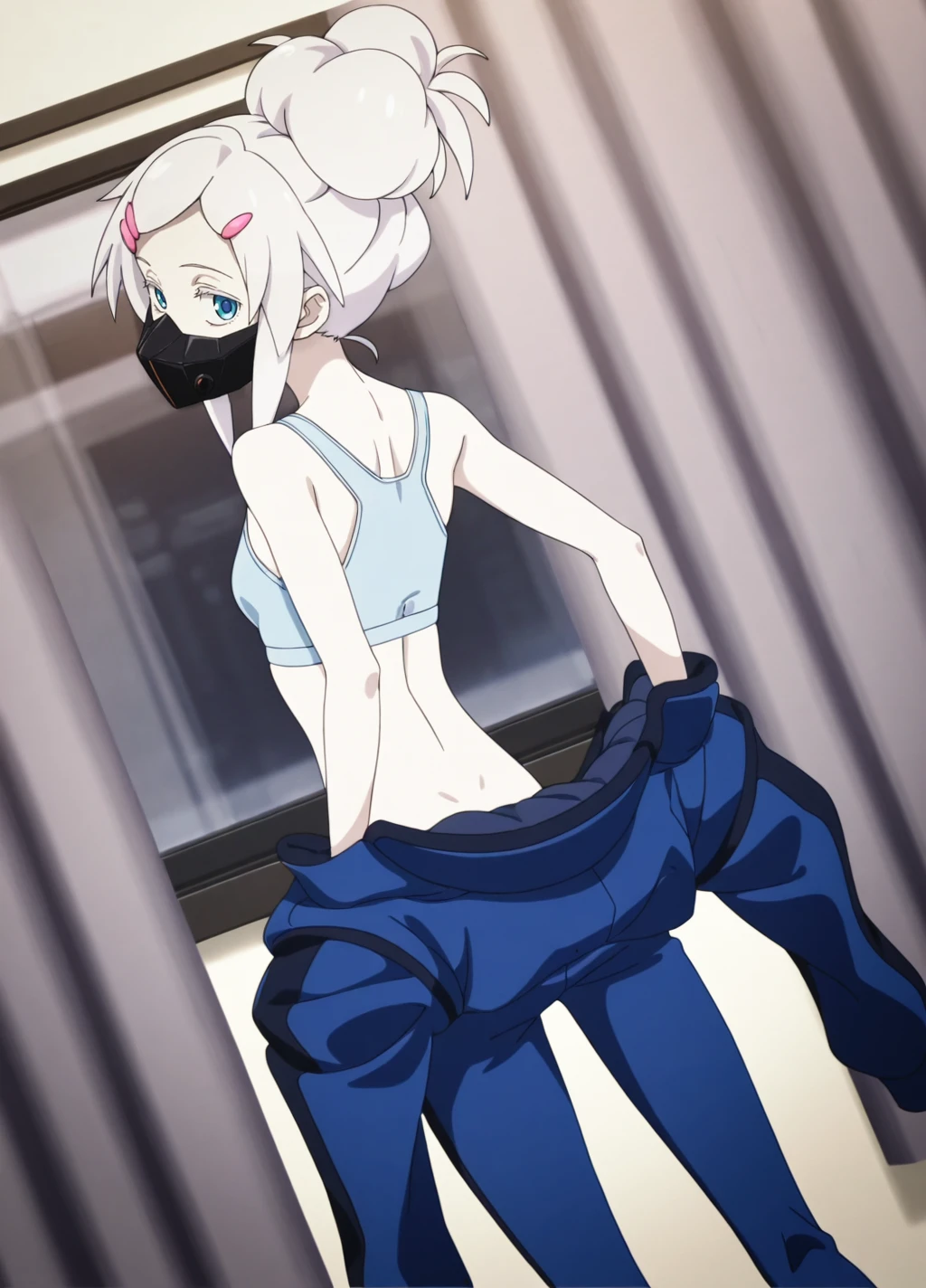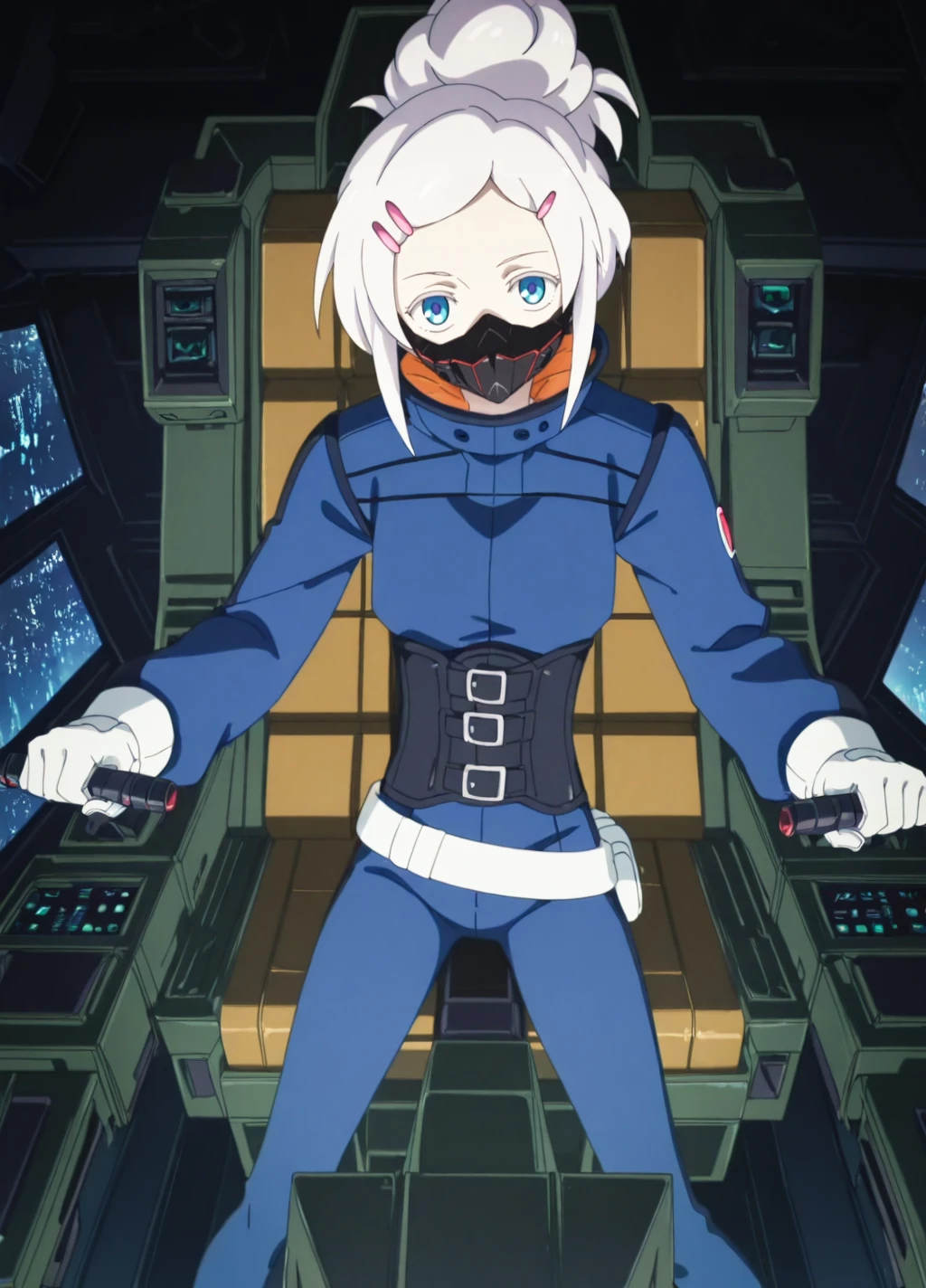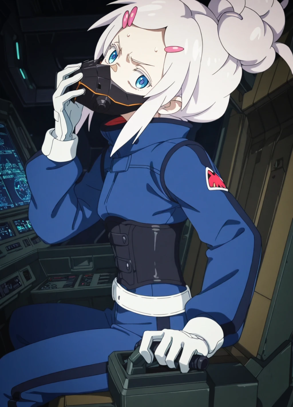 deux1, 1girl, mask, solo, hair ornament, white hair, single hair bun, hairclip, hair bun, holding, white gloves, gloves, blue eyes,
