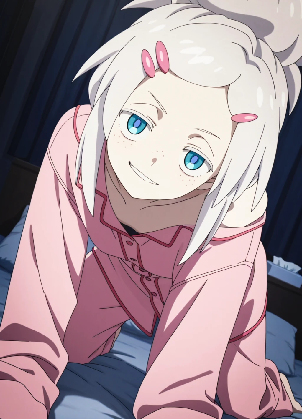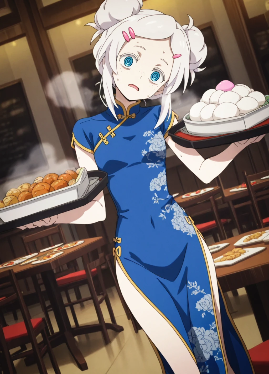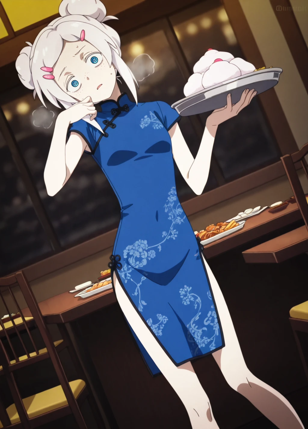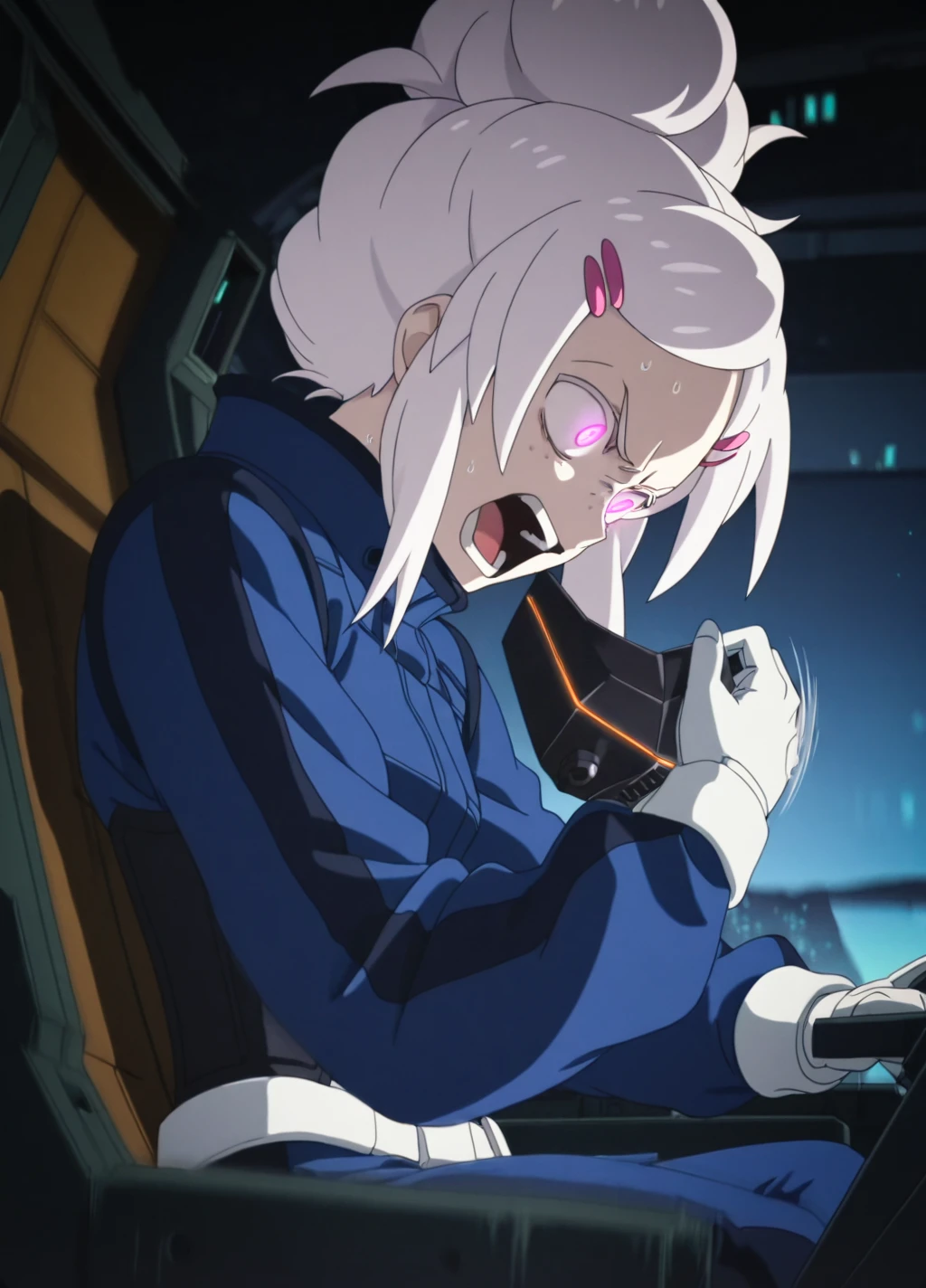 1girl,bandaid on nose, deux2, solo, blue eyes, freckles, blue jacket, hair ornament, jacket, gloves,white gloves, white hair, hair bun,sneakers,