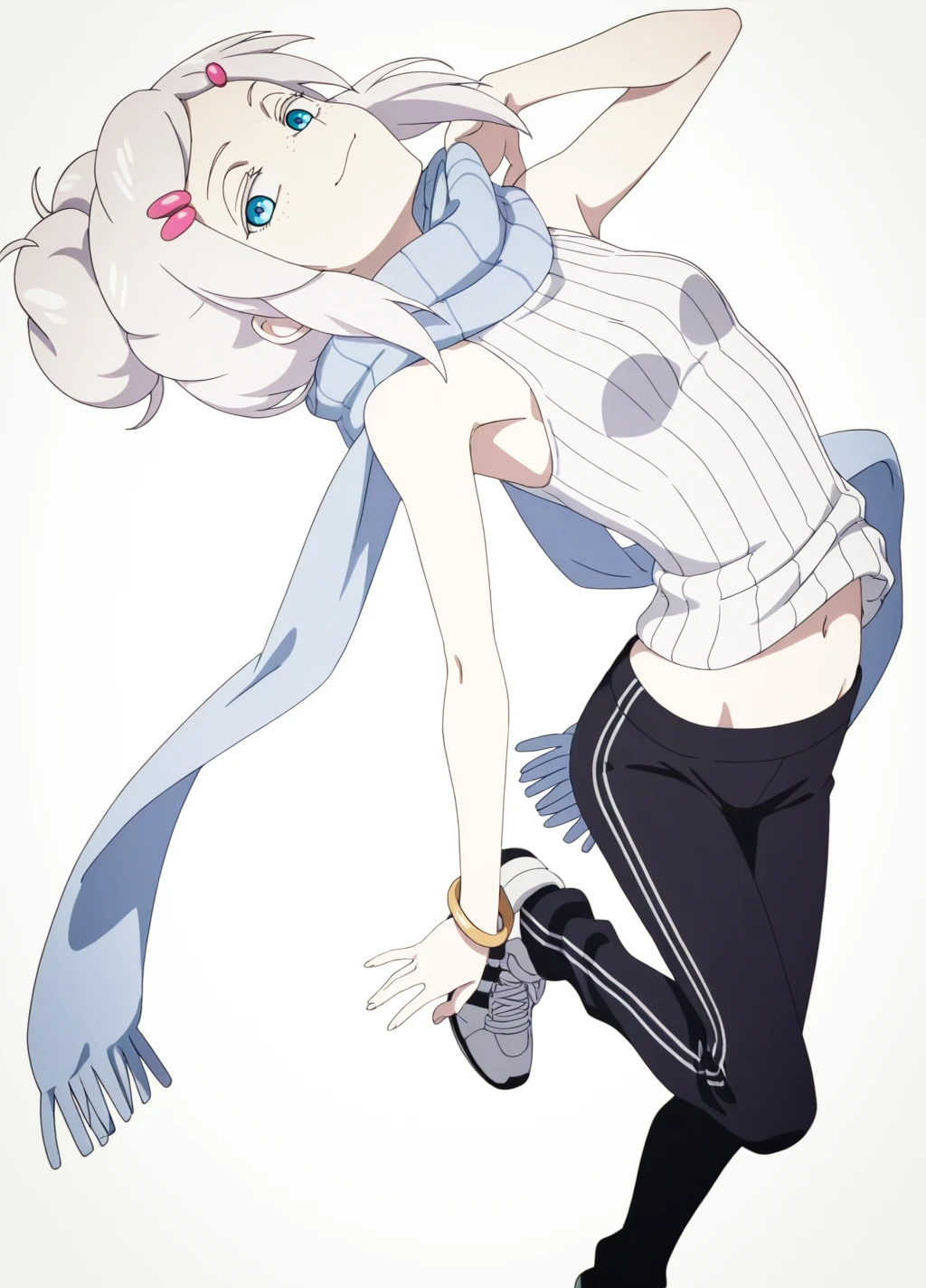 1girl, deux3, solo, blue eyes, freckles, hair ornament, white hair, hair bun, sidelocks,pale skin,bare shoulders, small breasts, sleeveless,scarf,light blue scarf, sweater, turtleneck, jewelry, bracelet, ribbed sweater,black pants,navel, sneakers,