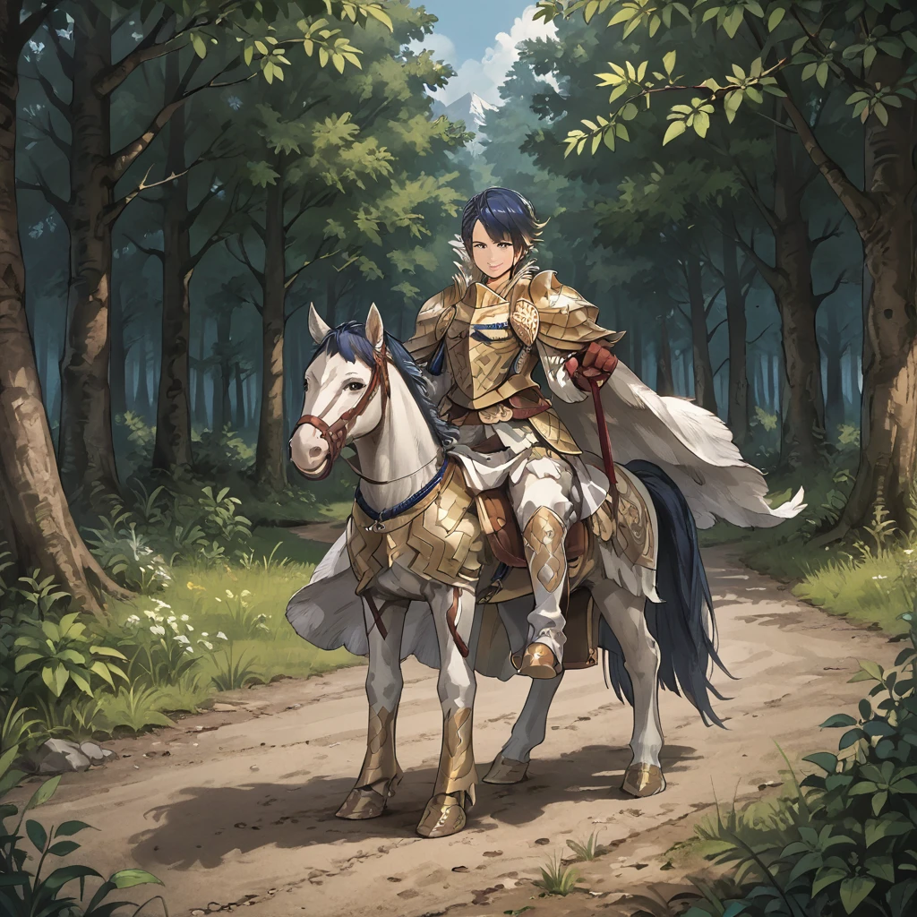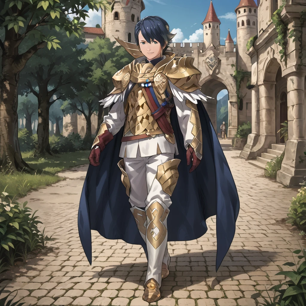 【Default Outfit Prompt】: Def_Alfonse, blue hair, short hair, blue eyes, armor, cape, gloves, boots, pauldron,