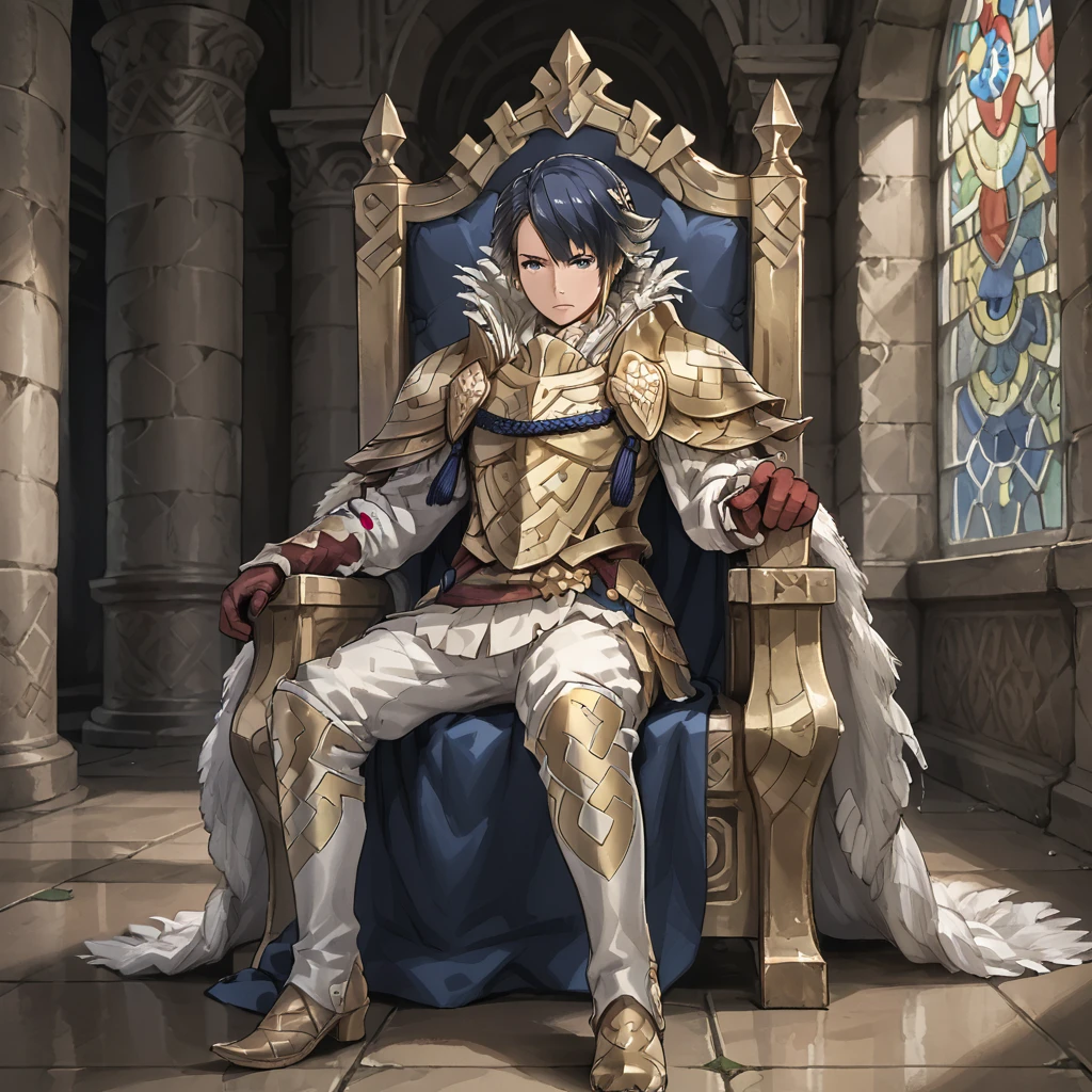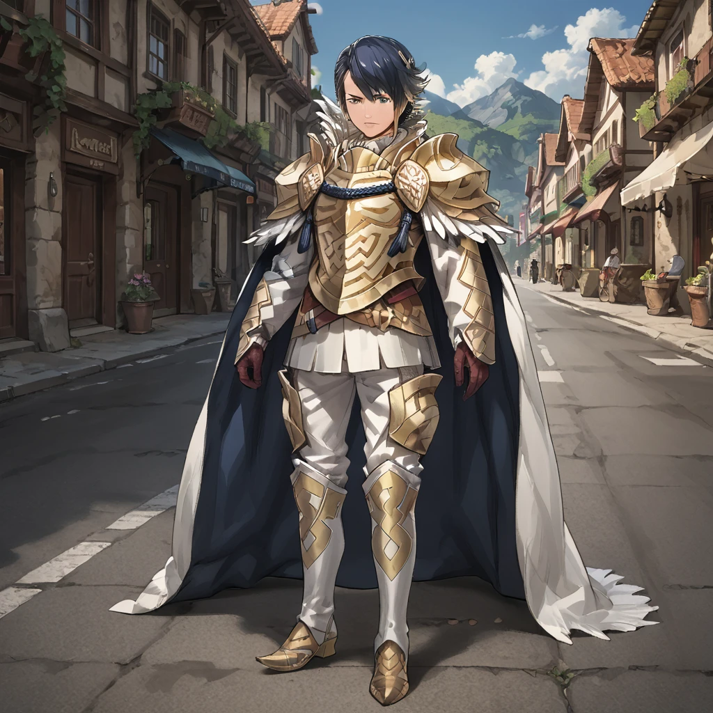 【Awakening Outfit Prompt】: Awk_Alfonse, blue hair, short hair, blue eyes, armor, cape, gloves, boots, pauldrons,