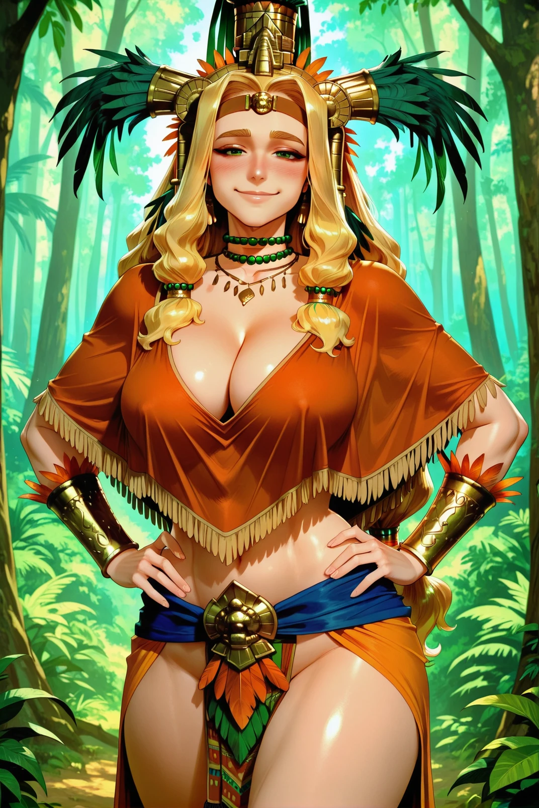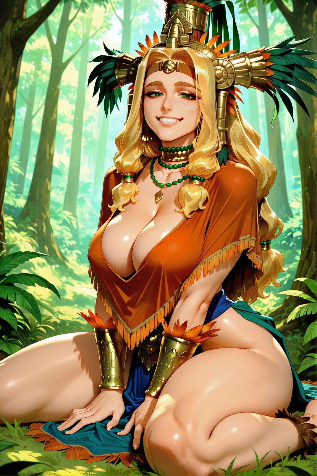 ilquetzalcoatl, 1girl, breasts, long hair, blonde hair, green eyes, ???????, 1boy, armpits, ????, hetero, blush, parted bangs, open mouth, arms up, circlet, arms behind head, necklace, dark-skinned male, low-tied long hair, dark skin, jewelry, smile, outdoors, sweat, very long hair, tree, tongue, navel, tongue out, huge breasts, large breasts <lora:illustrious quetzalcoatl 768x1152:0.9>