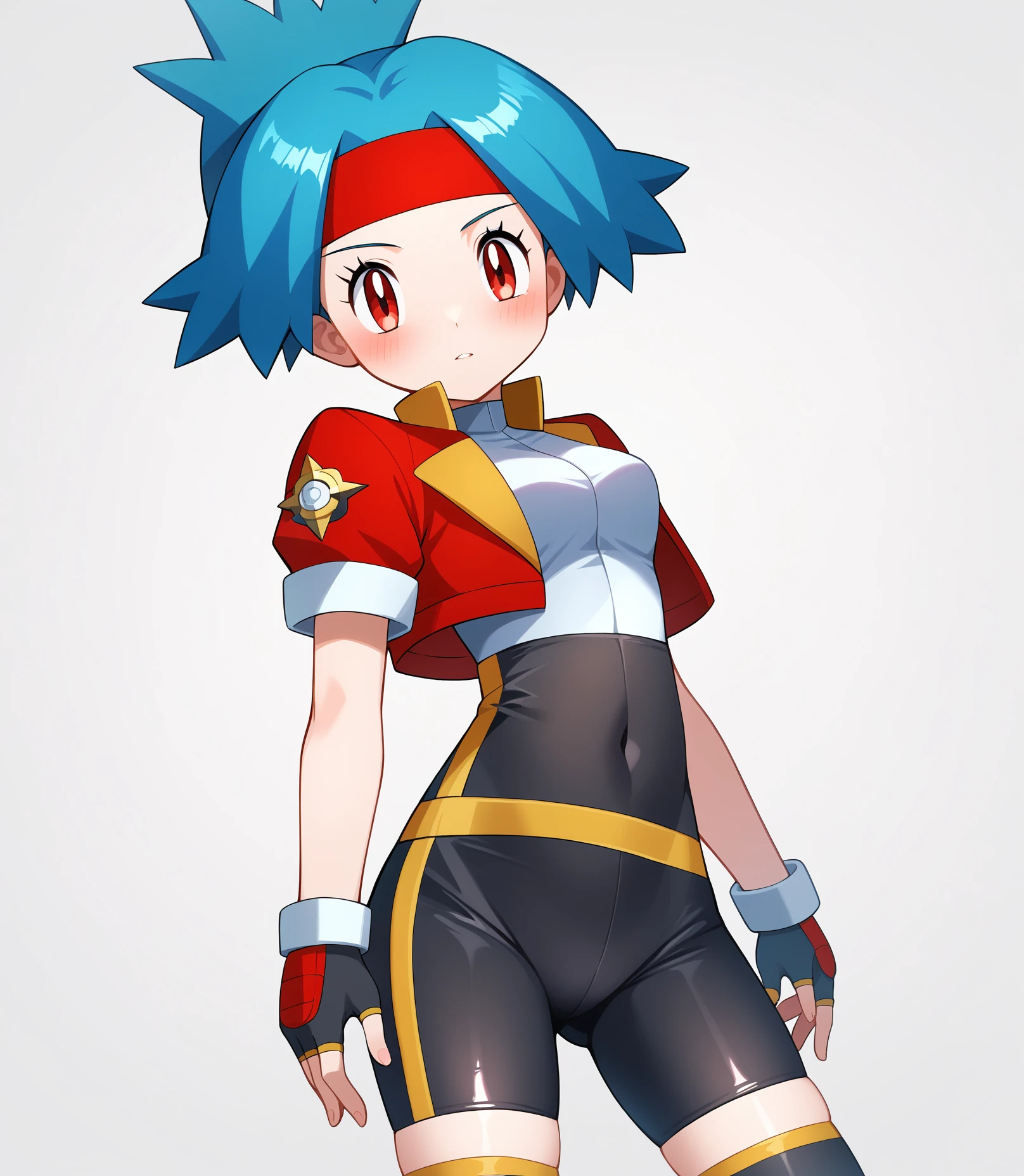 blue hair, headband, short hair, red eyes, short hair, sidelocks, red headband, short ponytail, ponytail,