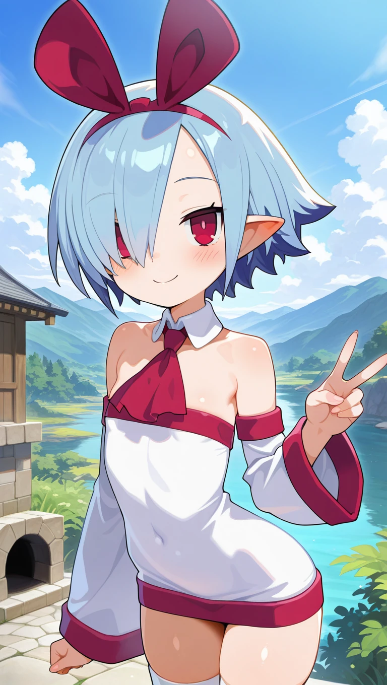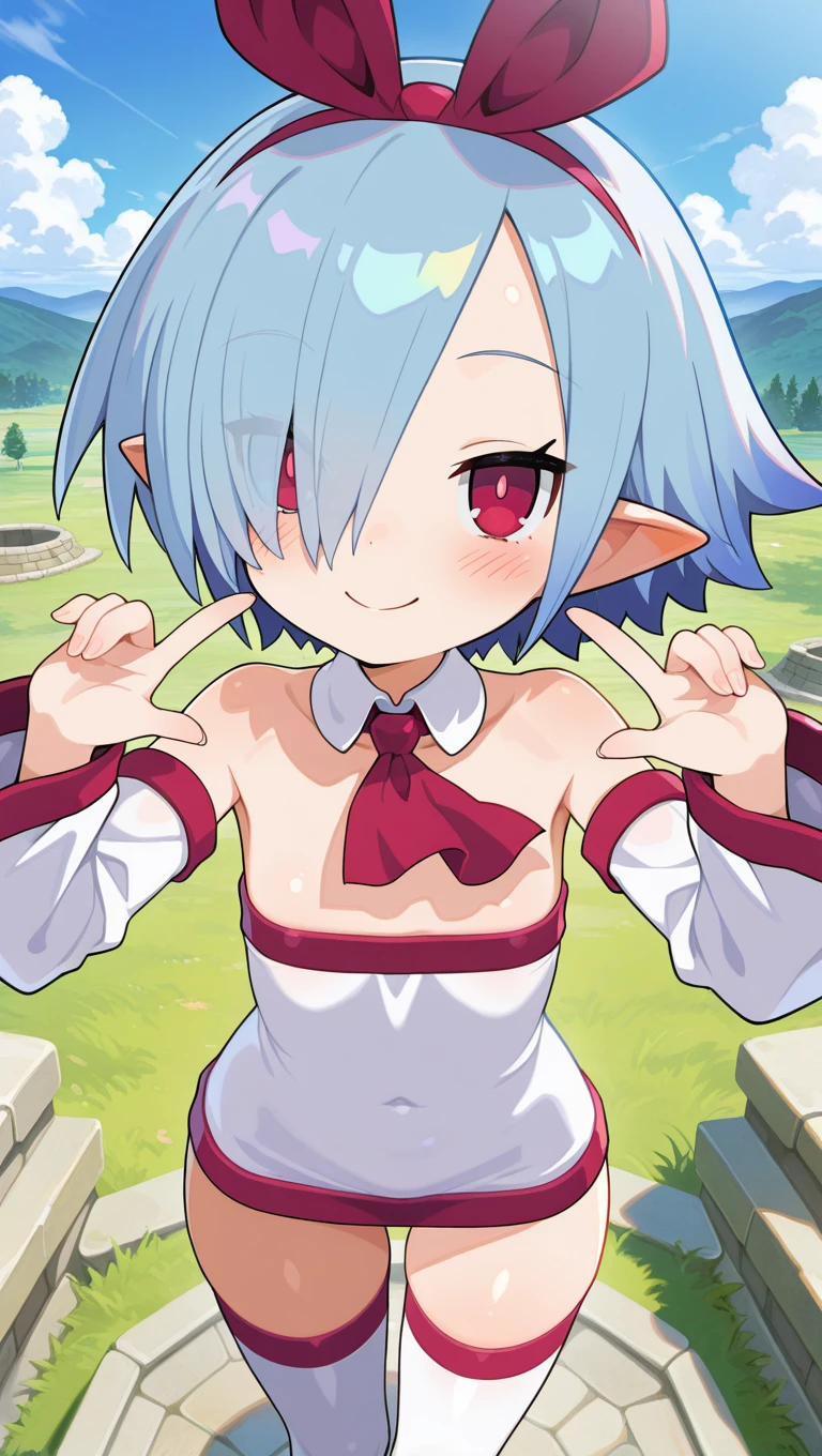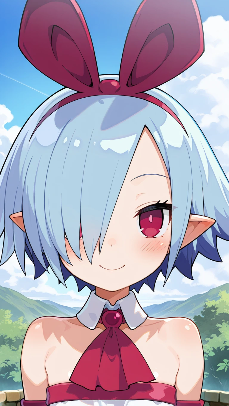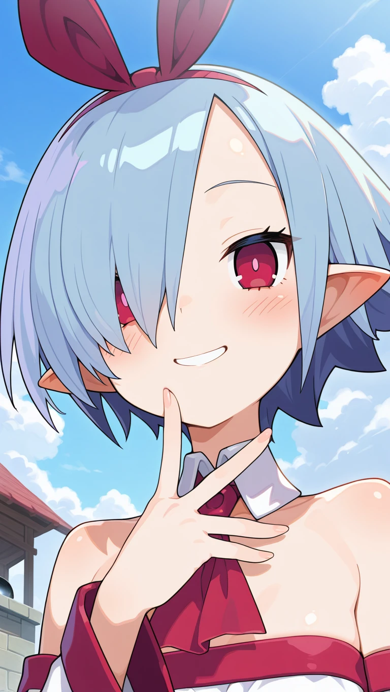very short hair,blue hair,pointy ears,hair ribbon,hair over one eye,red eyes