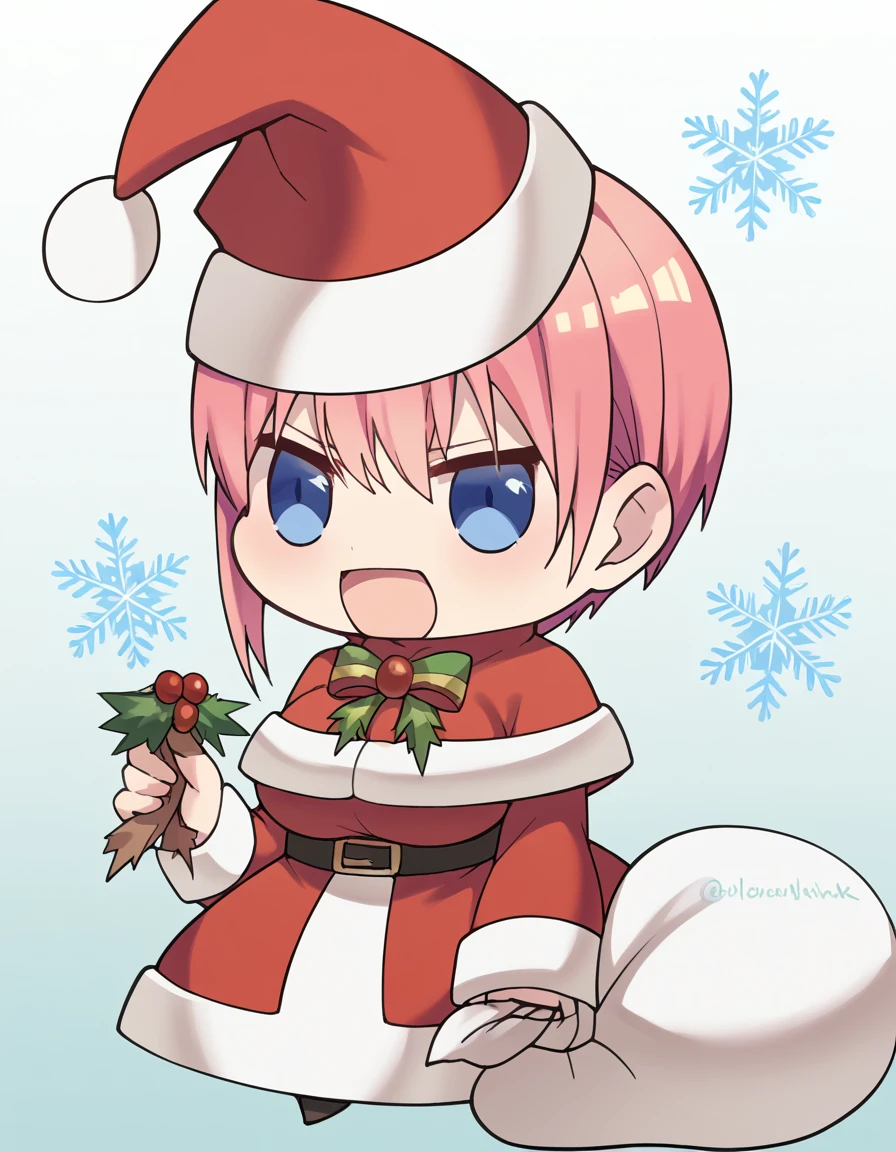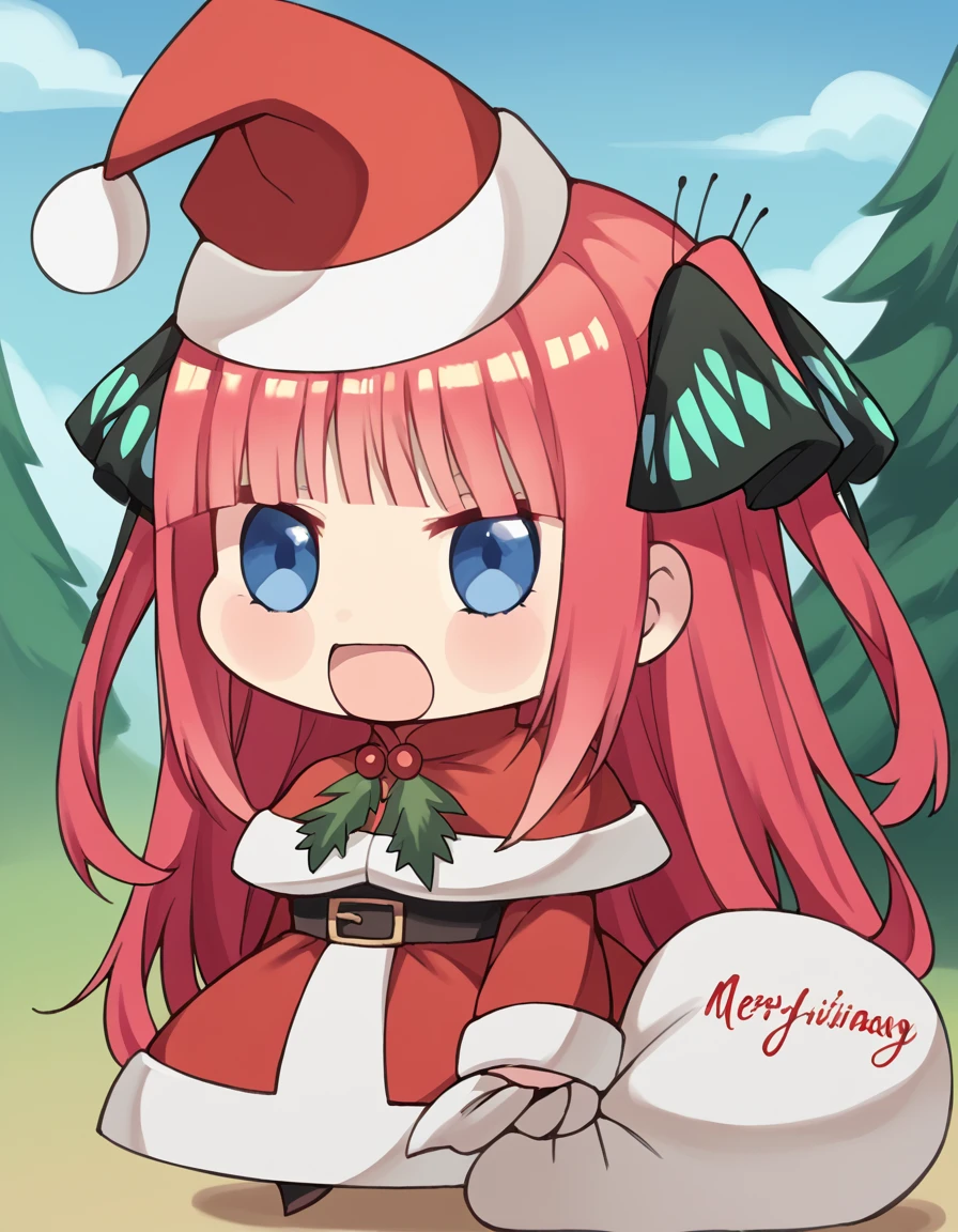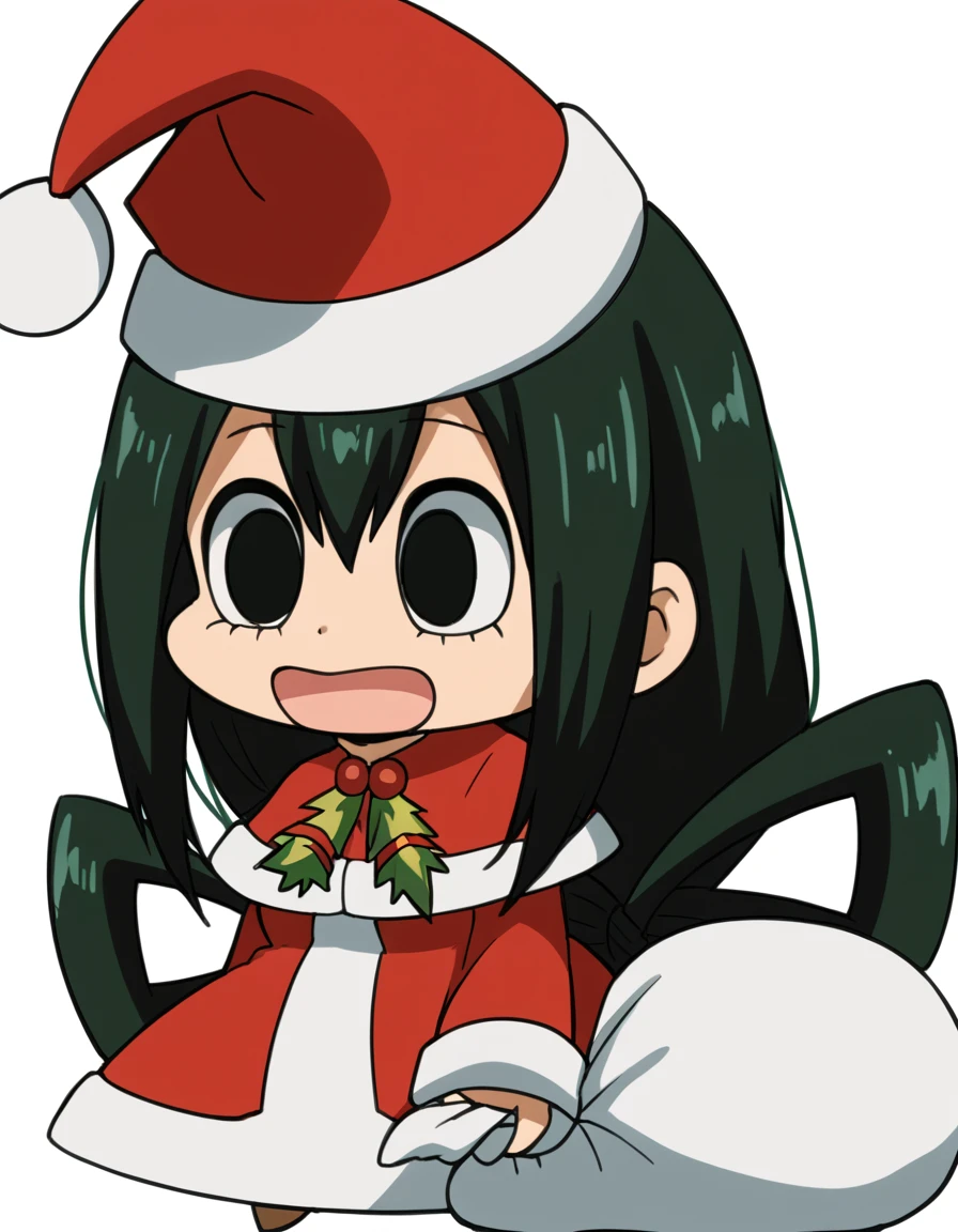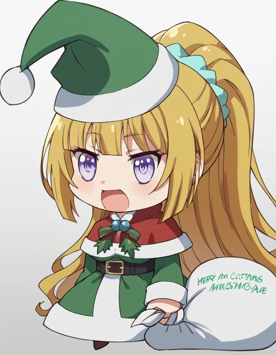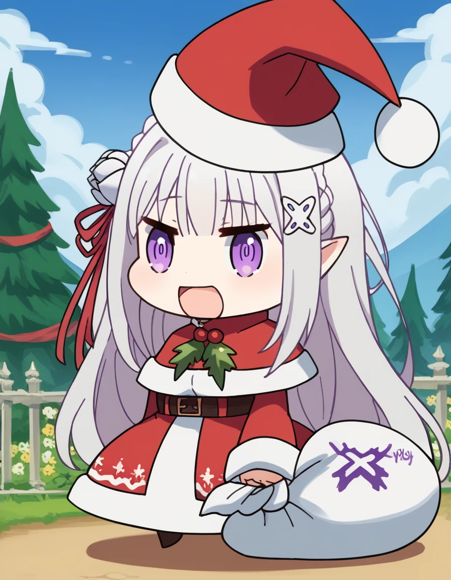 <lora:padoru-ponyxl-lora-nochekaiser:1>, padoru, padoru (meme), holding sack, sack, santa hat, meme, christmas, open mouth, chibi, red capelet, santa dress, capelet, fur-trimmed headwear,