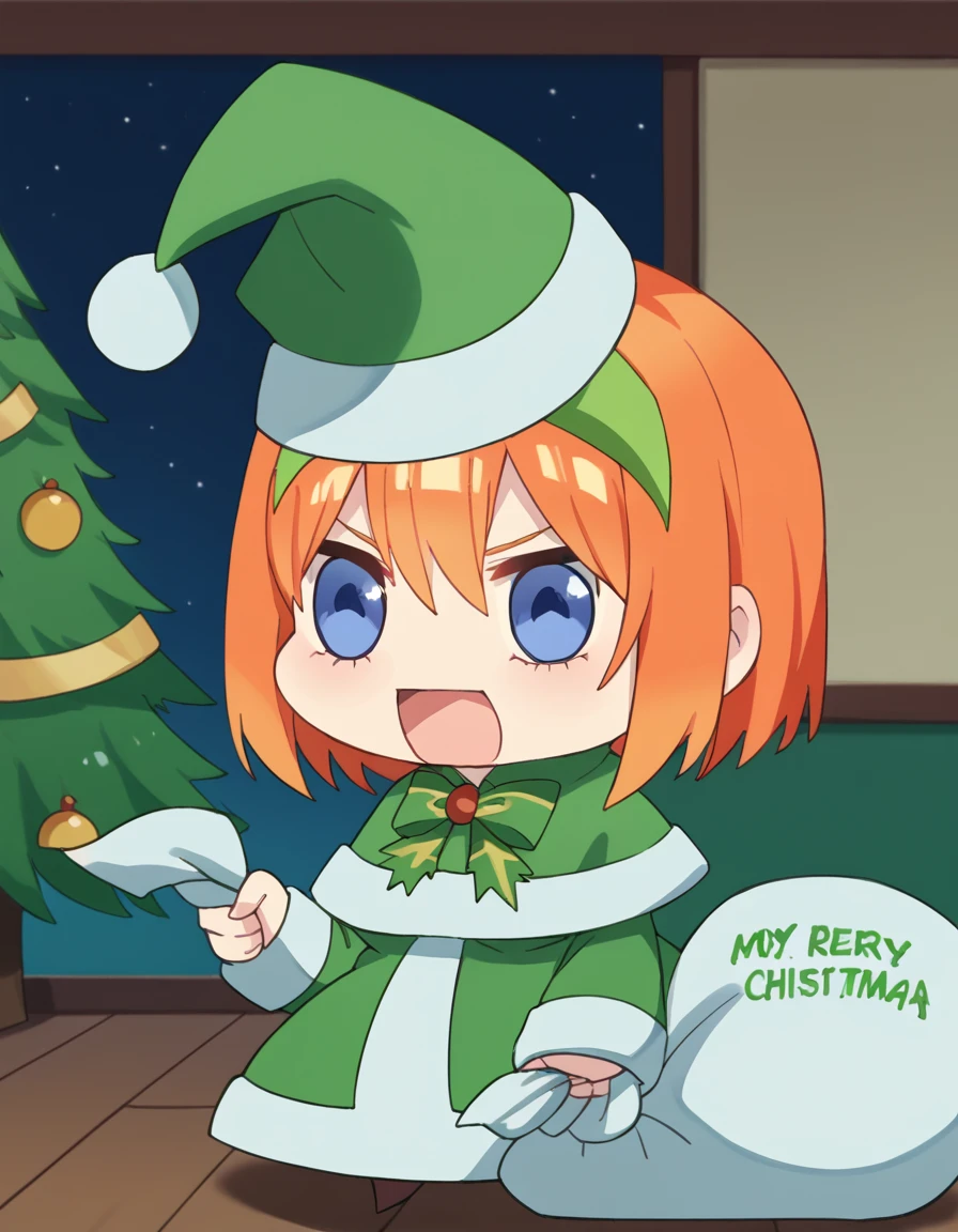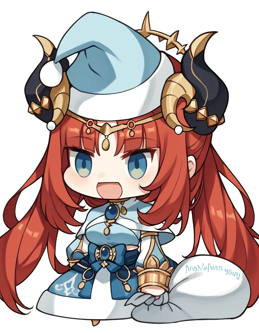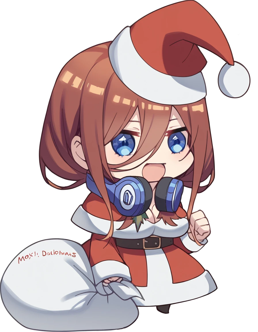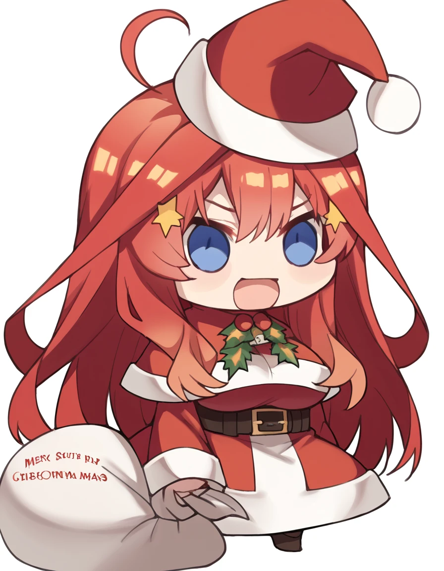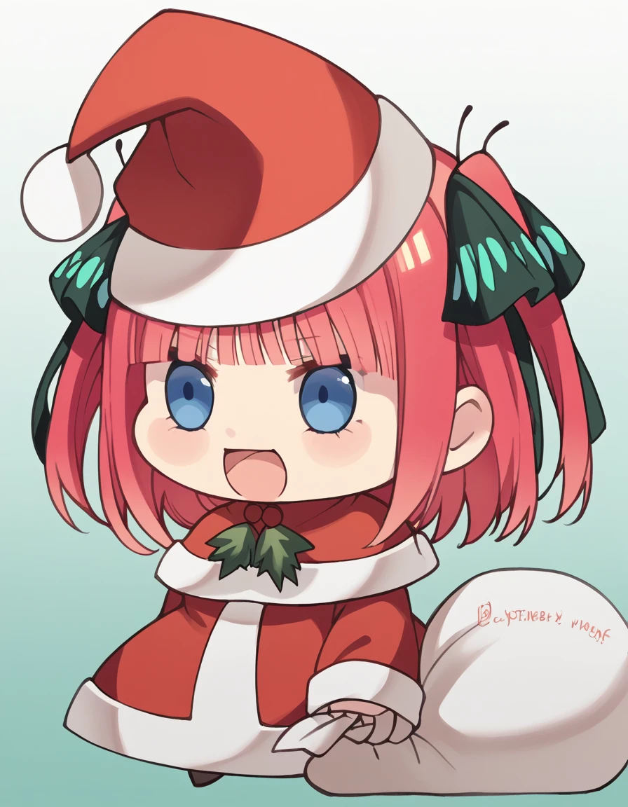 <lora:padoru-ponyxl-lora-nochekaiser:1>, padoru, padoru (meme), holding sack, sack, santa hat, meme, christmas, open mouth, chibi, red capelet, santa dress, capelet, fur-trimmed headwear,