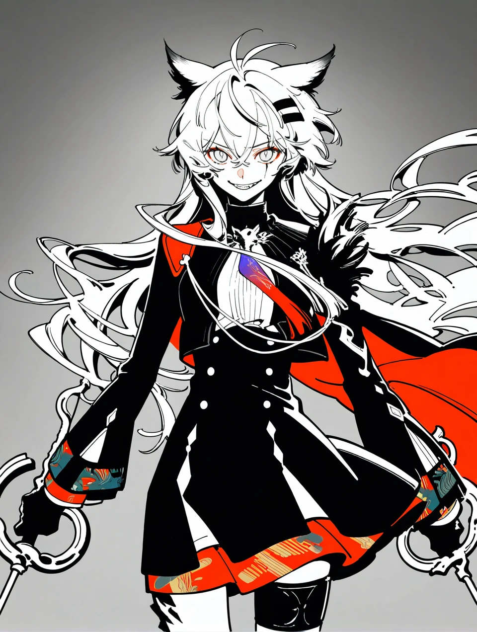 lappland the decadenza \(arknights\),long hair,very long hair,hair between eyes,antenna hair,messy hair,scar across eye,animal ears,wolf ears,hairclip,wolf girl,brooch,necktie,white shirt,jacket,black jacket,open jacket,long sleeves,fur trim,cape,two-sided fabric,two-sided cape,short dress,black dress,gloves,oripathy lesion \(arknights\),thigh strap,socks,grey socks,knee boots,black footwear,Description