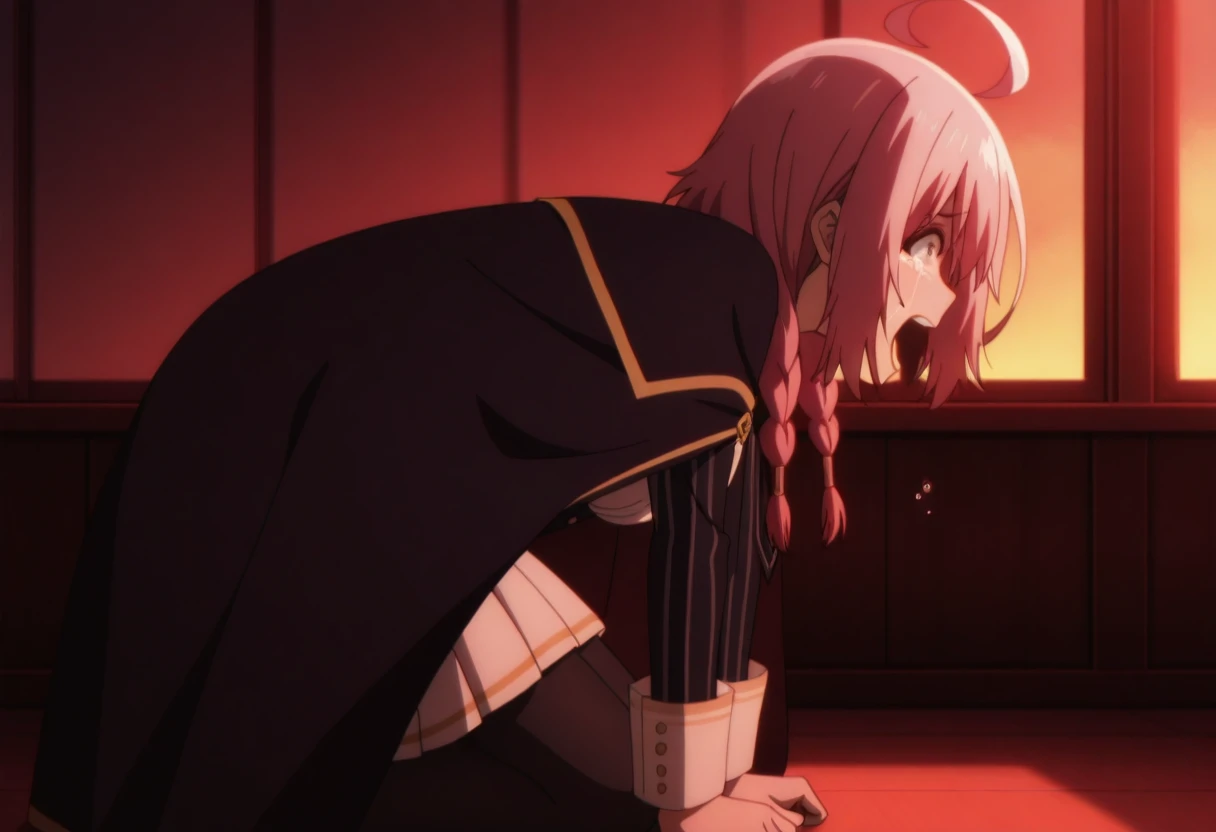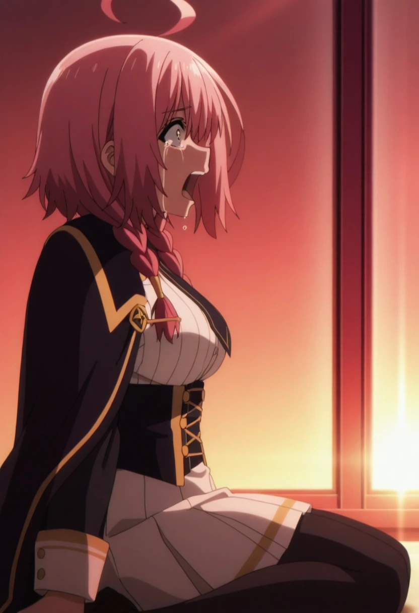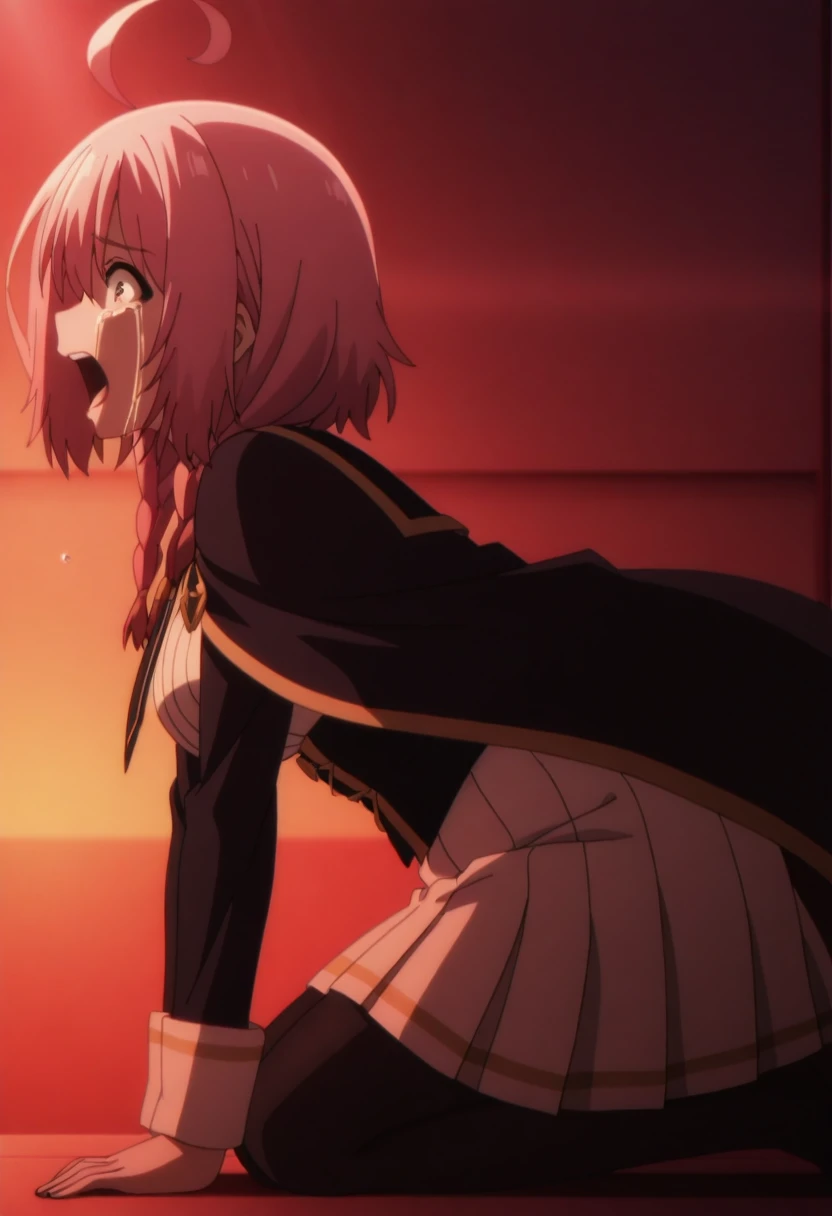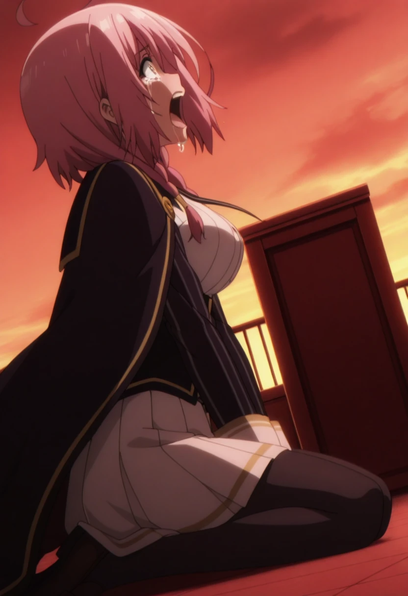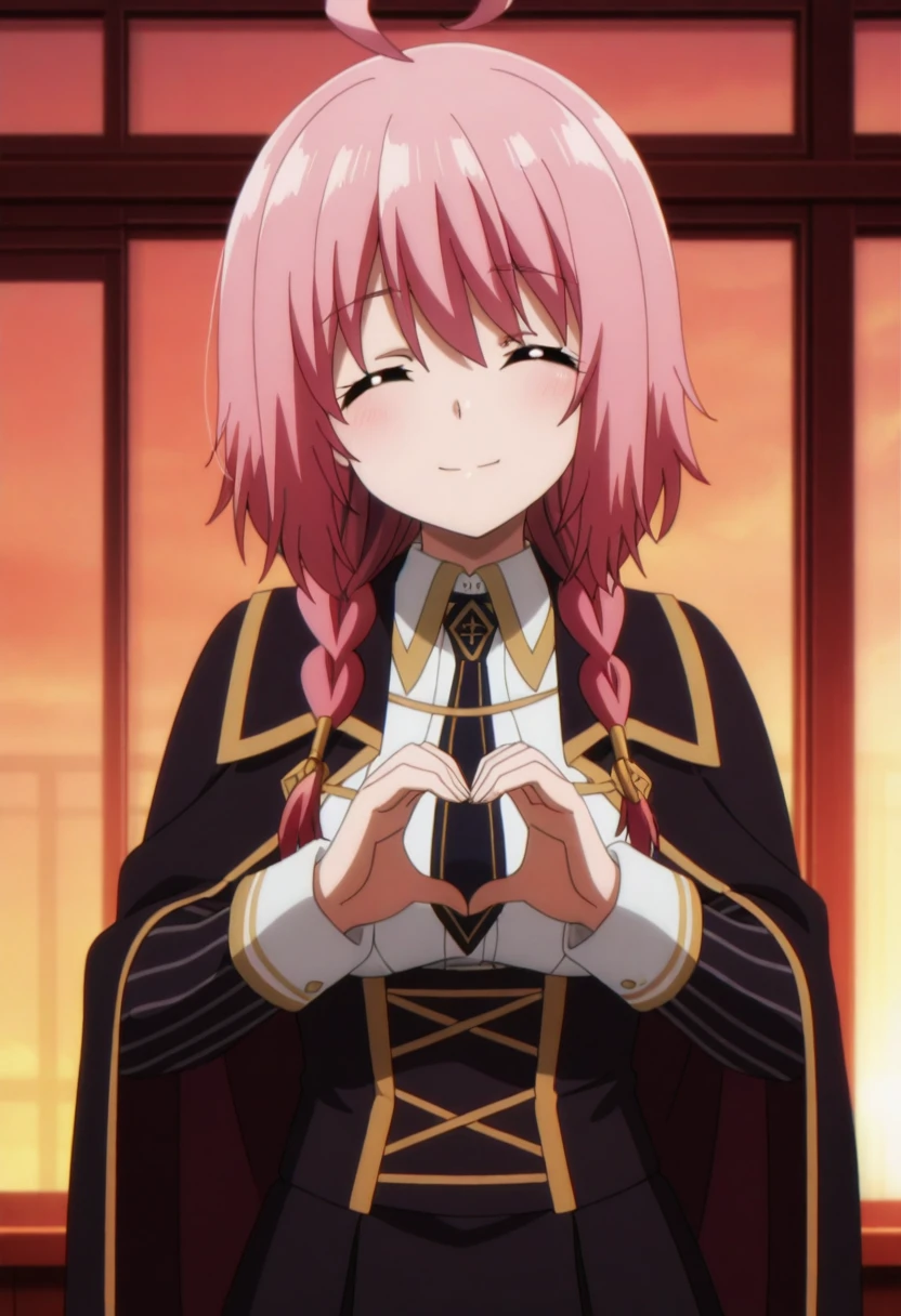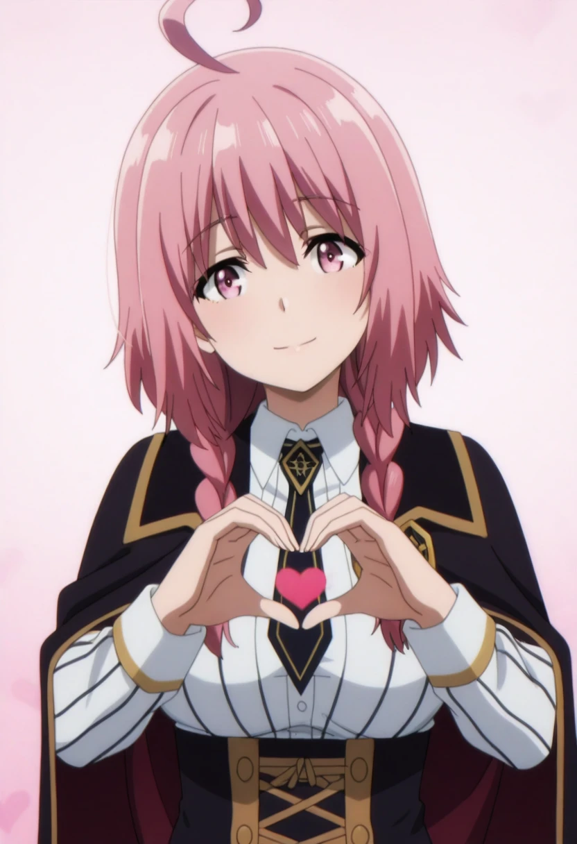1girl, sherry barnett, pink hair, ahoge, twin braids,school uniform, midgar academy school uniform, cape, necktie,