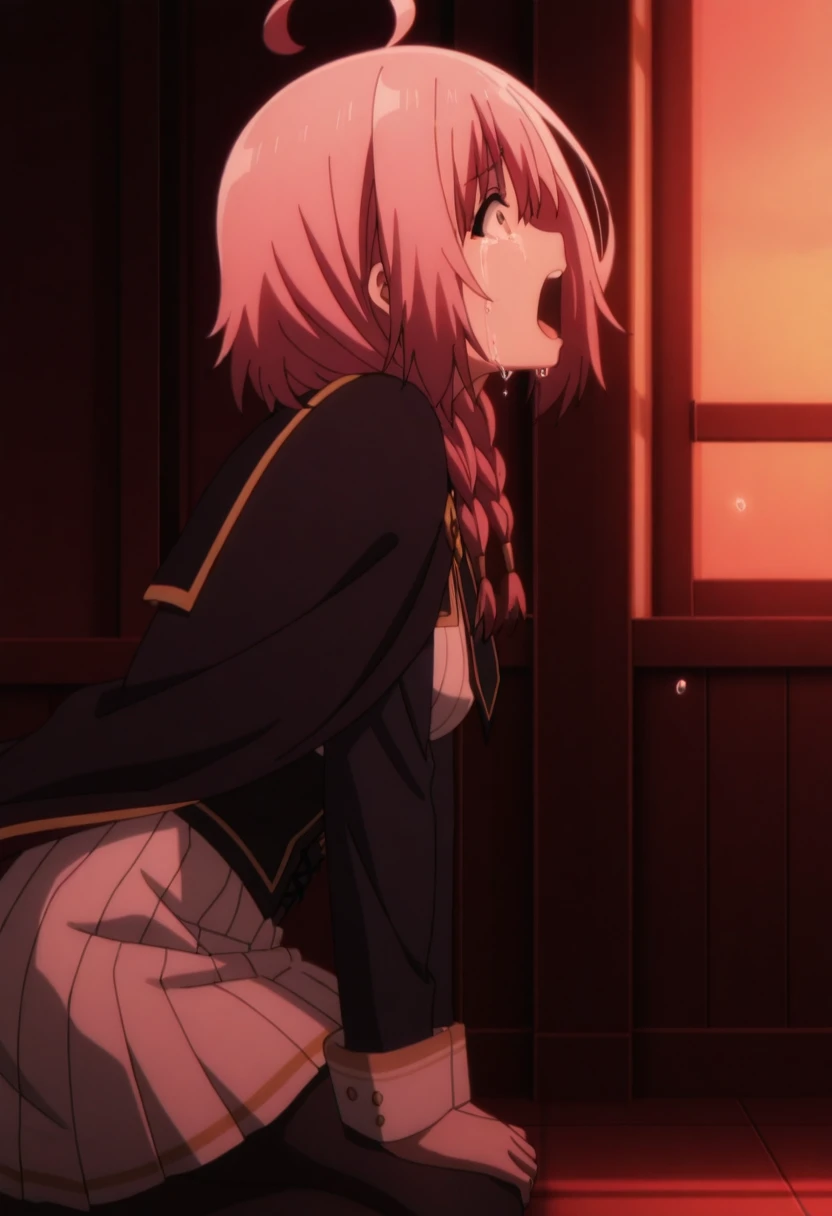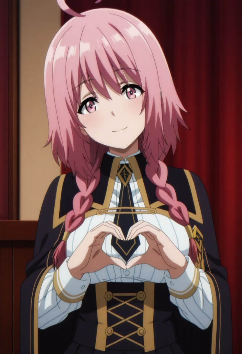1girl, sherry barnett, pink hair, ahoge, twin braids,