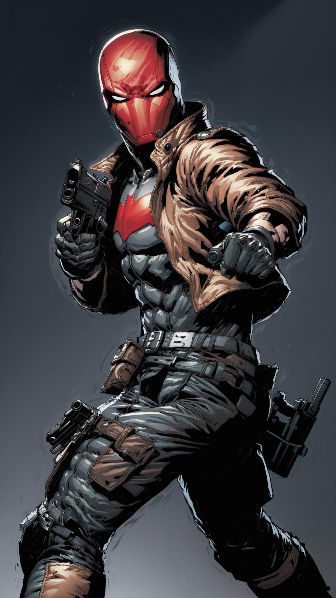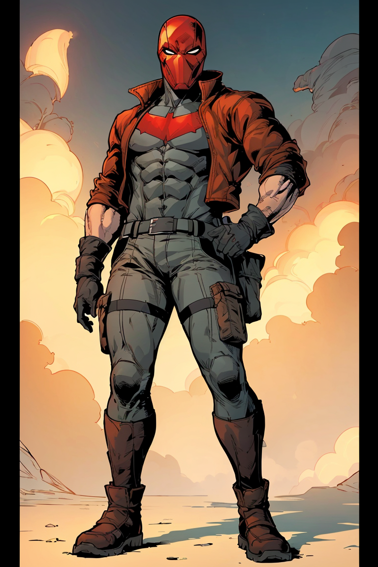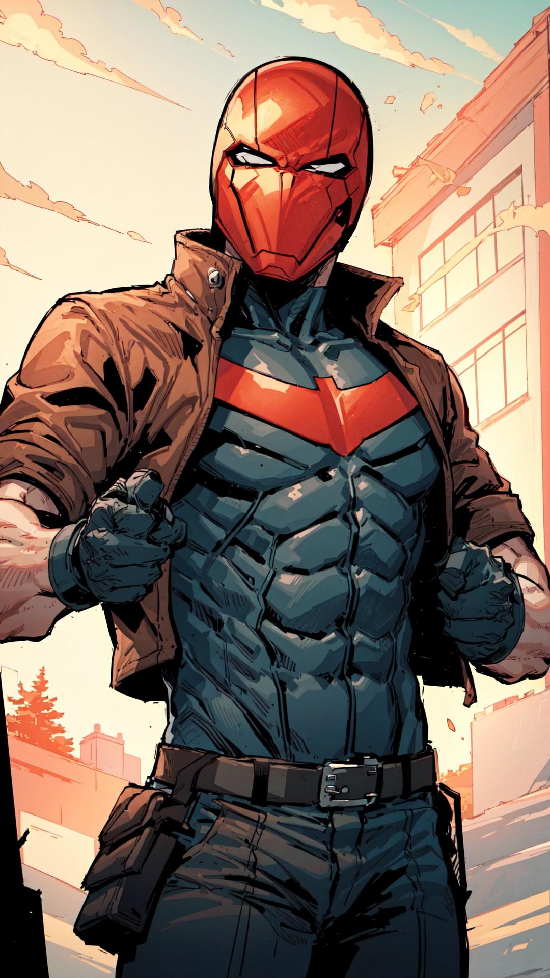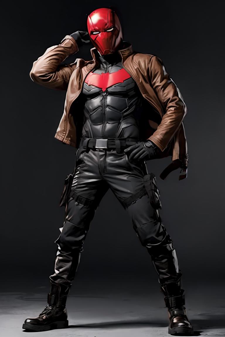 a man, red helmet, brown leather jacket, gray skintight suit, gloves, belt, boots,