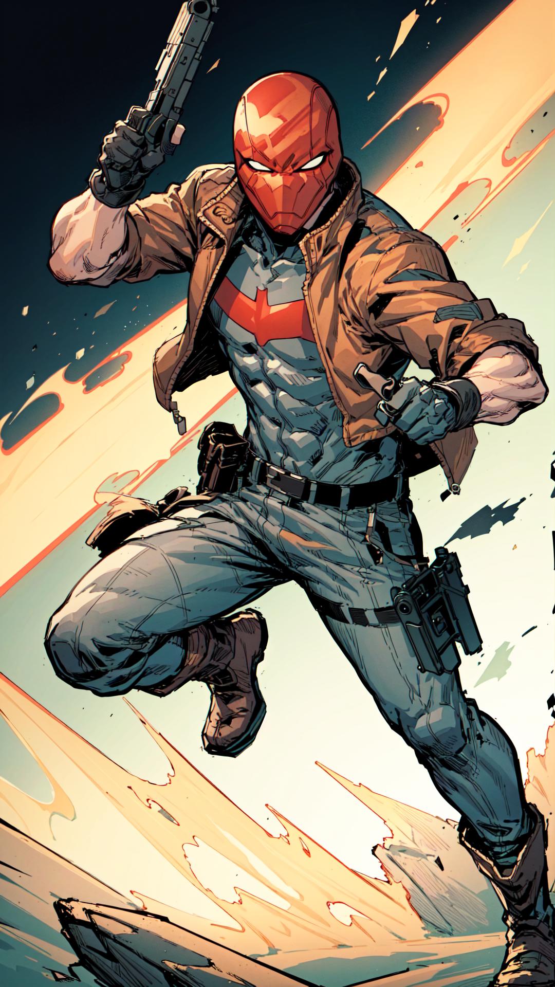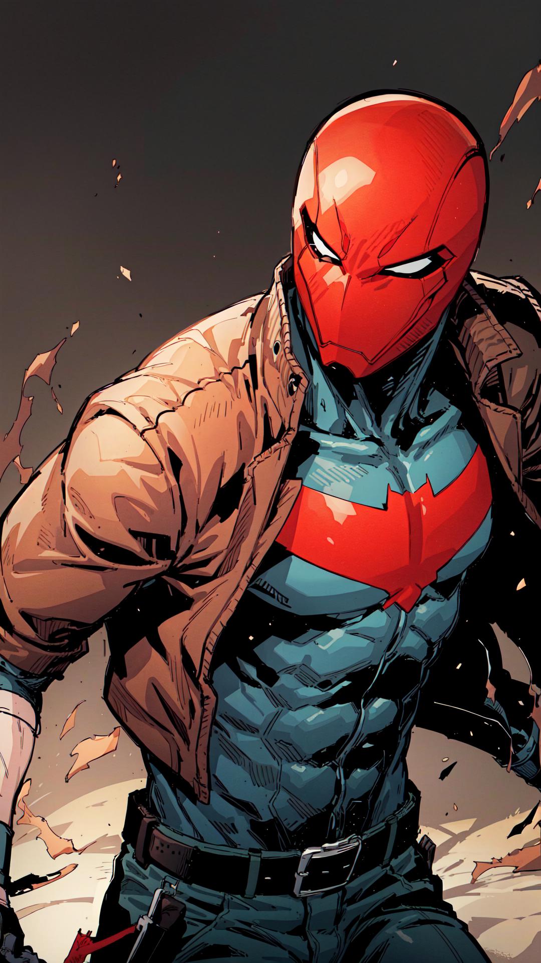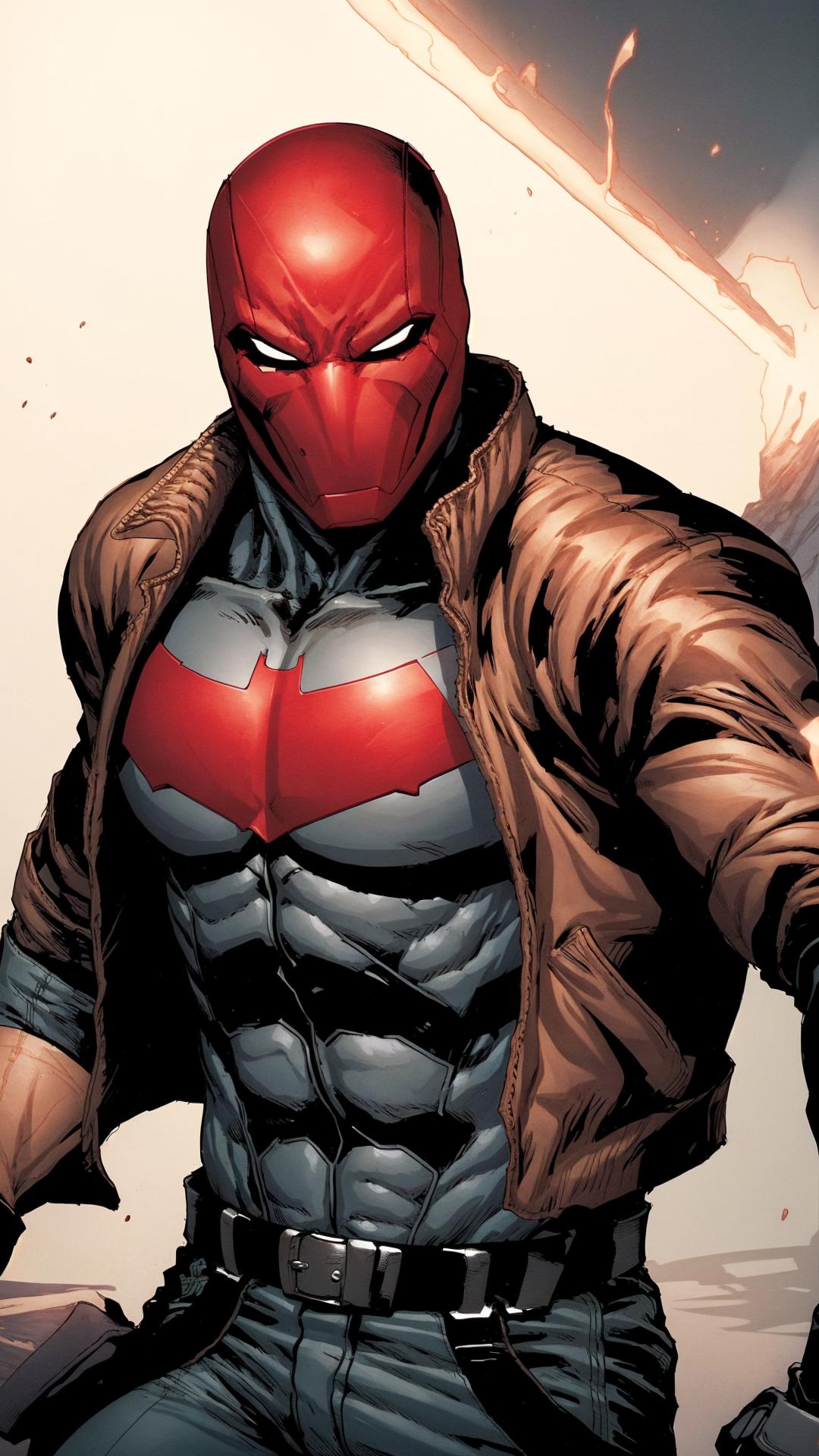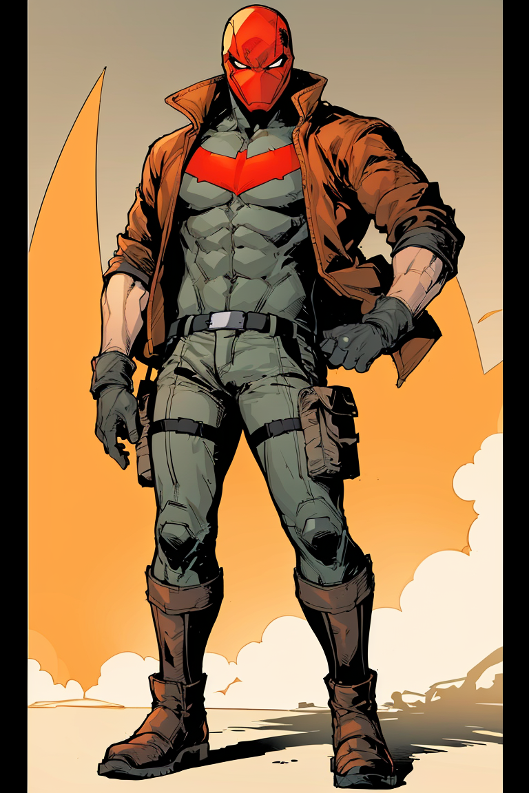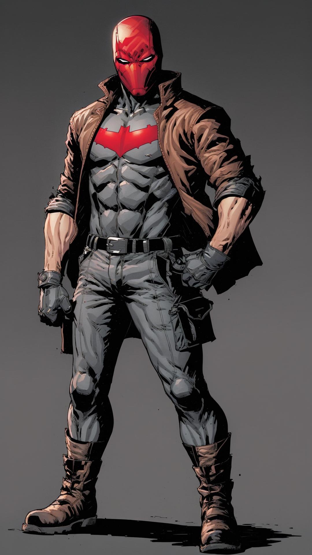 a man, red helmet, brown leather jacket, gray skintight suit, gloves, belt, boots,