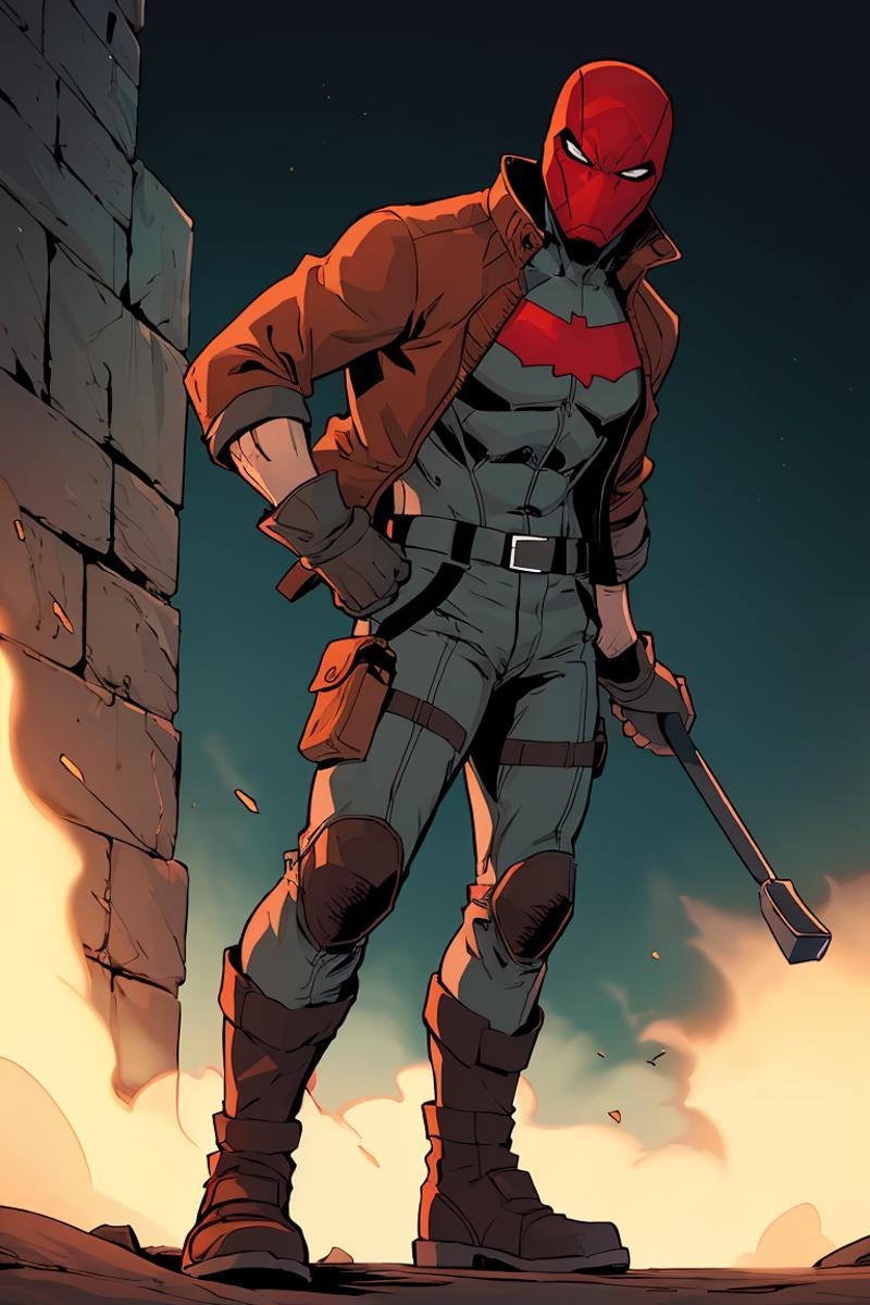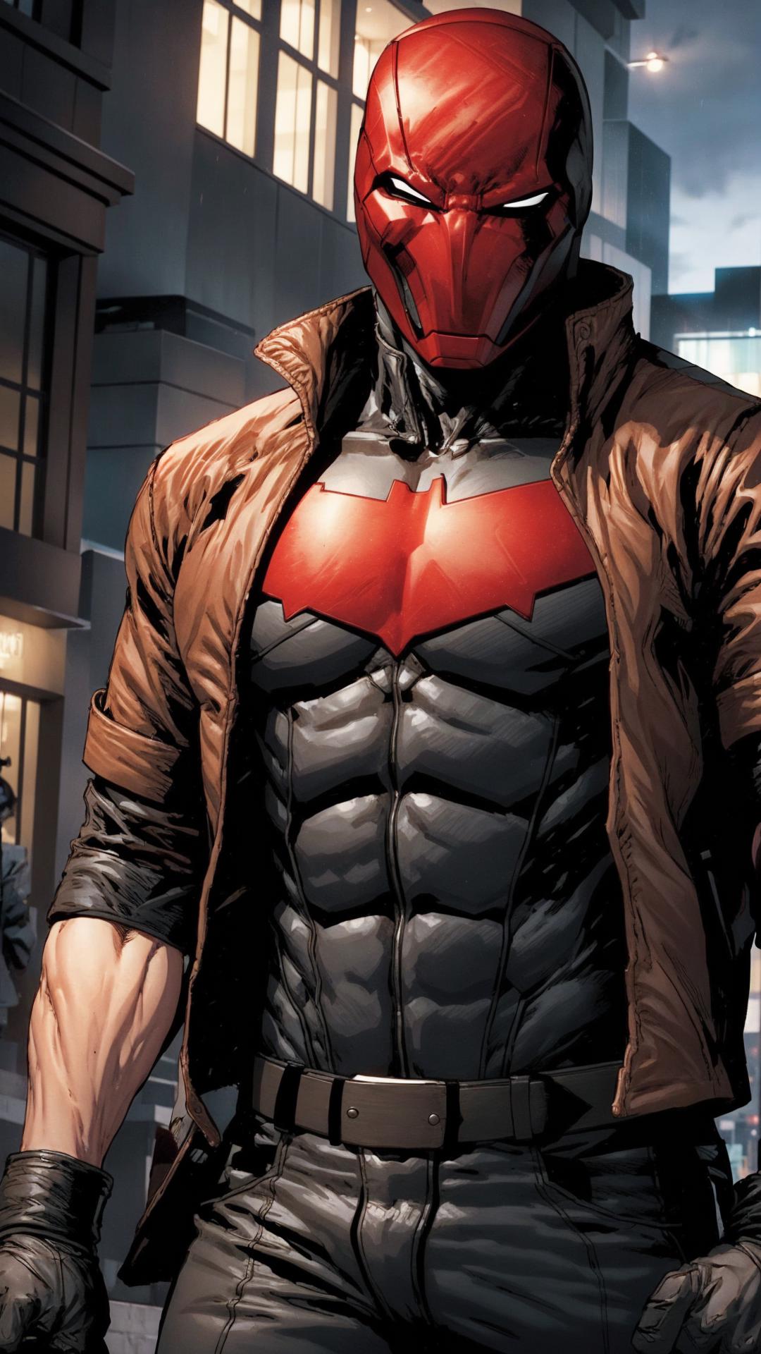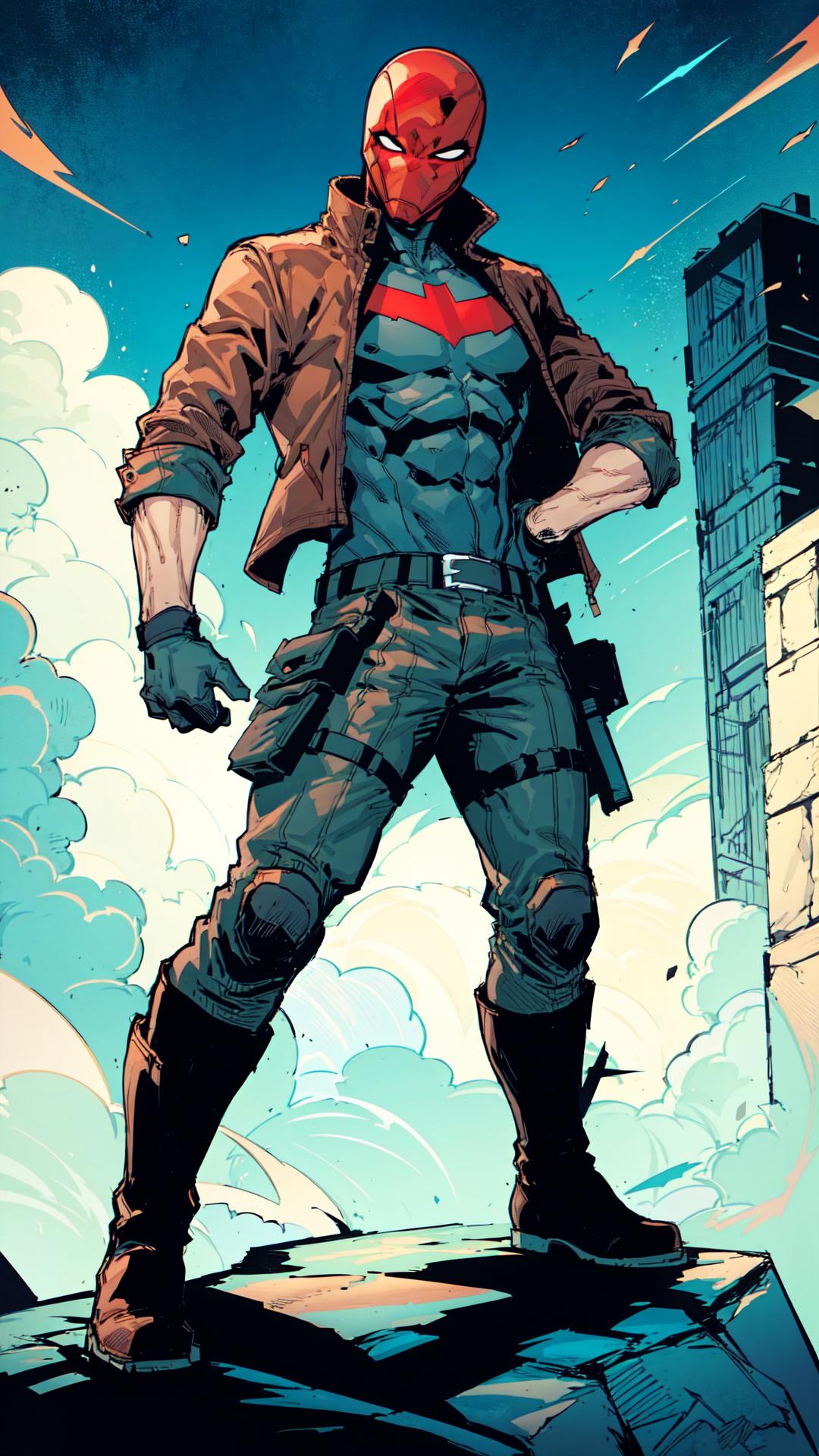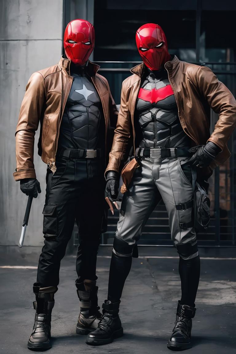 a man, red helmet, brown leather jacket, gray skintight suit, gloves, belt, boots,