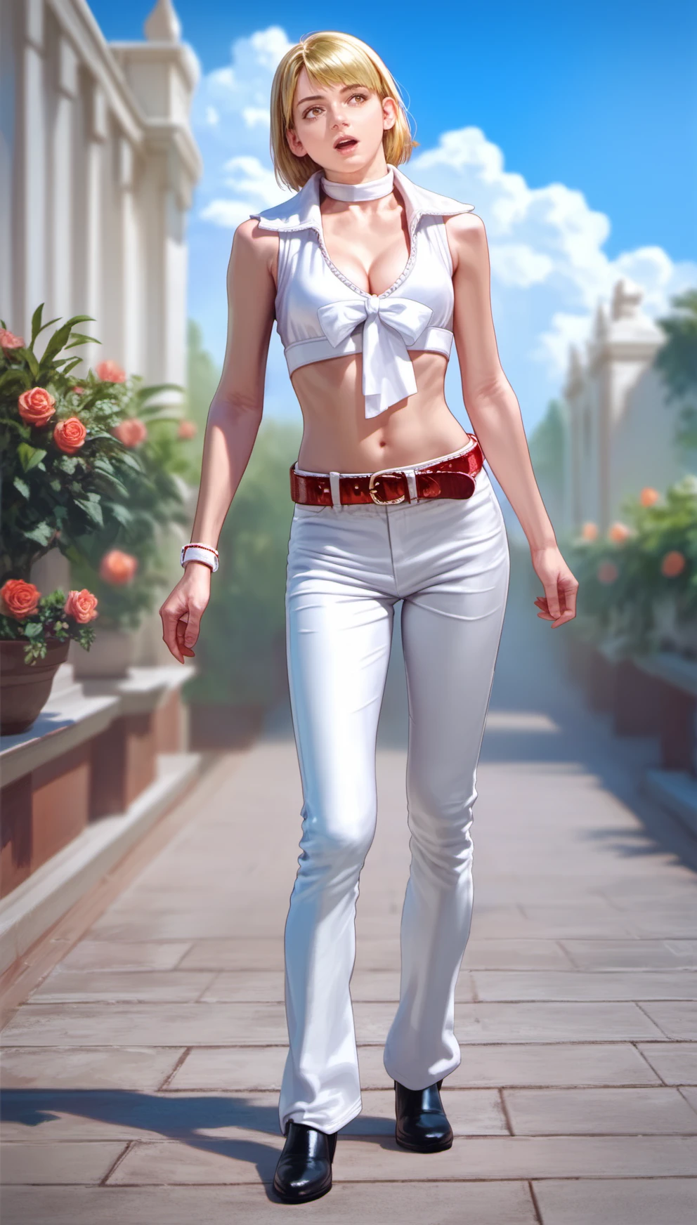 Her body proportions also have a slight issue in the full-body shot. And the tag 'brown sweater over shoulder, sleeveless' has overfitted, making it very hard to remove.