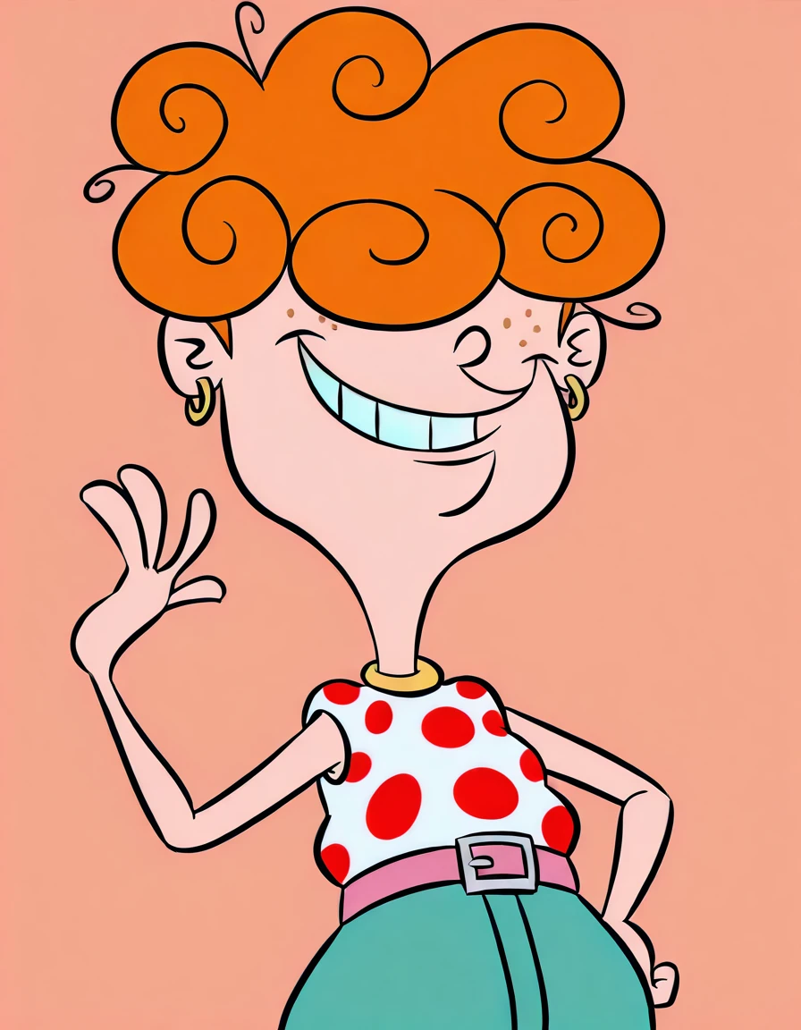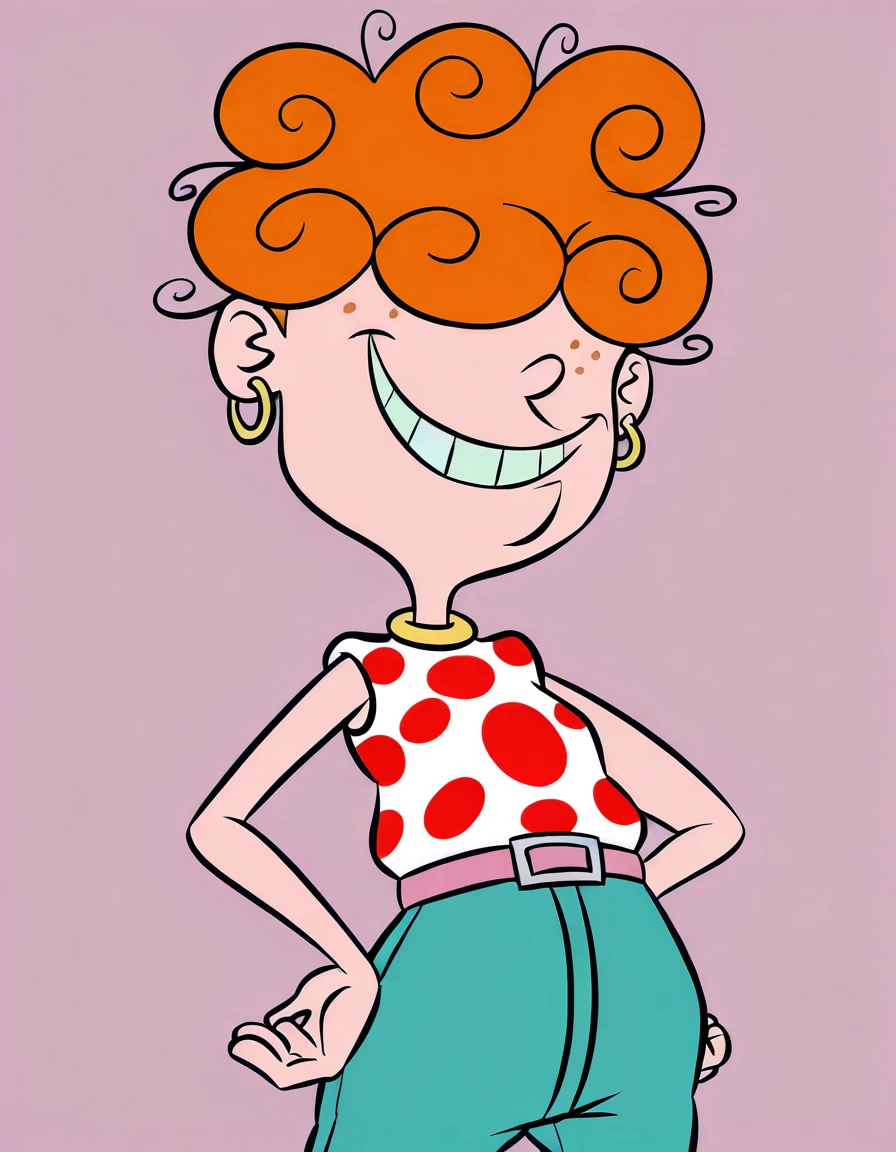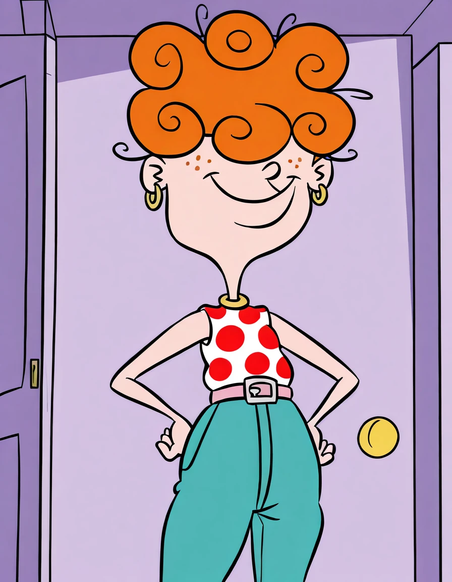 leekanker, hair over eyes, orange hair, 1girl, hoop earrings, polka dot clothing, solo, freckles, curly hair, smile, belt, pants, jeans