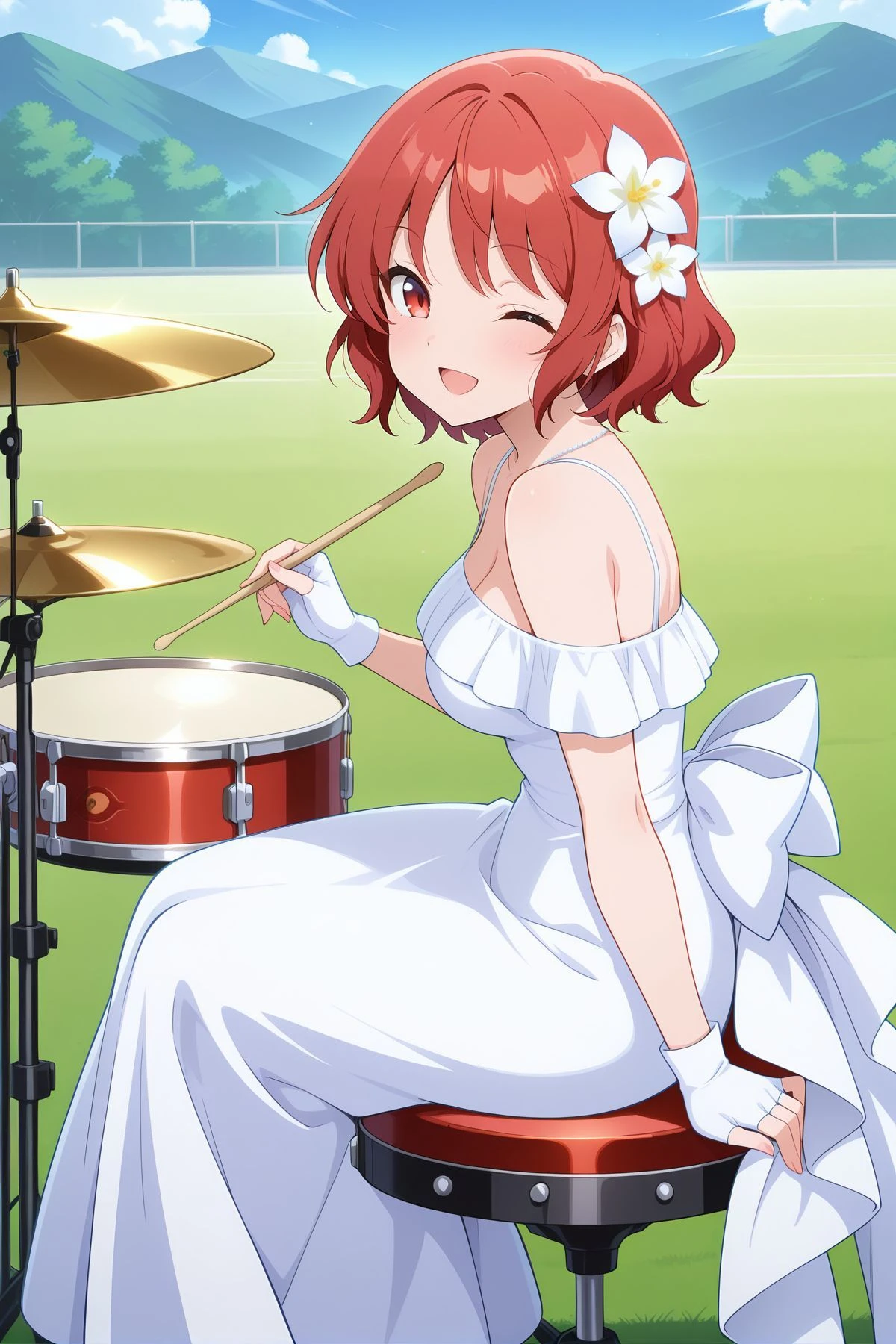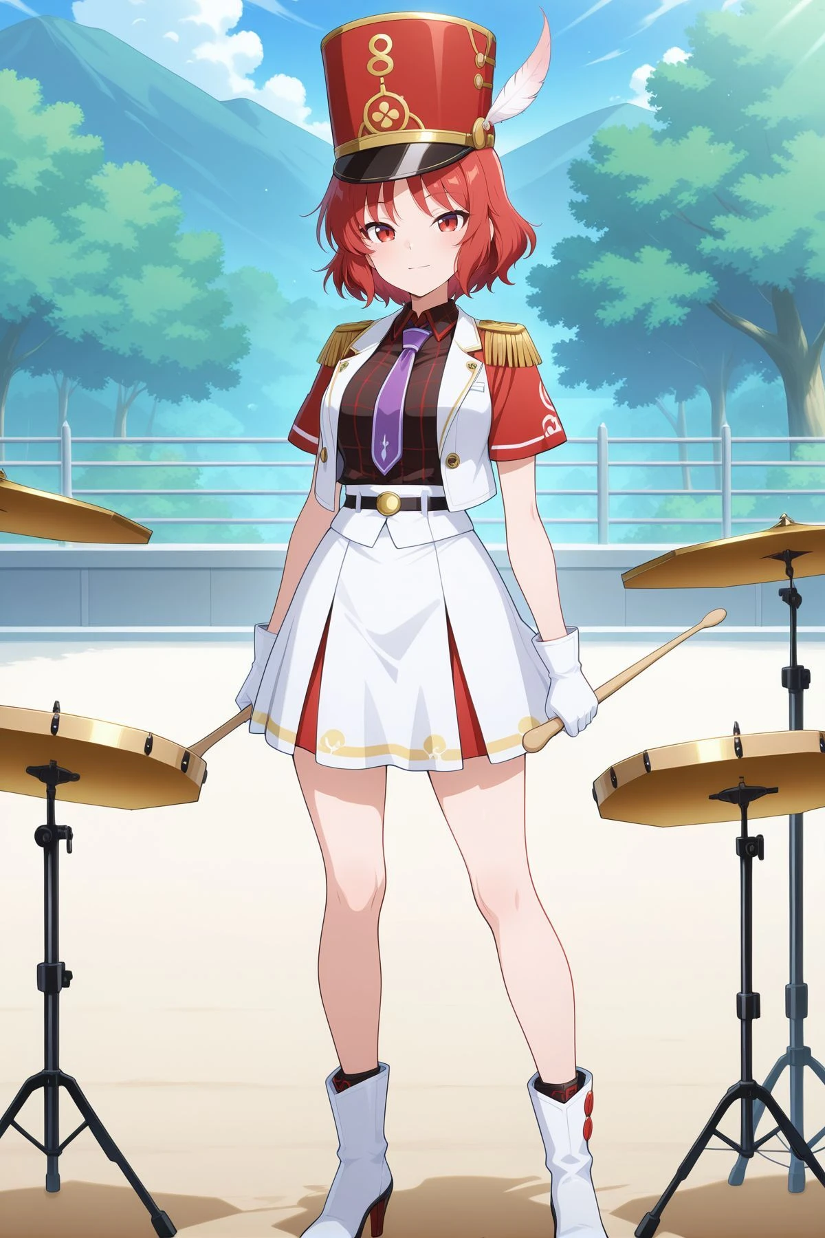 horikawa raiko, 1girl, solo, red eyes, red hair, short hair, horikawa raiko \(prism march snare\), alternate costume, alternate headwear, red hat, shako cap, tomoe (symbol), hat feather, epaulettes, fringe trim, chain, white vest, red shirt, short sleeves, white gloves, pleated skirt, multicolored skirt, white skirt, high heels, white boots, taiko drum, drum set, holding drumsticks, horikawa raiko, 1girl, solo, red eyes, red hair, short hair, alternate costume, alternate hairstyle, single hair bun, bun cover, blue dress, short sleeves, back bow, maid, maid apron, white apron, white bow, chain, black belt, earbuds, earphones, red boots, blowing bubbles, chewing gum, horikawa raiko, 1girl, solo, red eyes, red hair, short hair, horikawa raiko \(white hybrid drums\), alternate costume, hair flower, hair ornament, white flower, wedding dress, white dress, long ??????????-shoulder dress, back bow, white bow, white gloves, fingerless gloves,Optional :