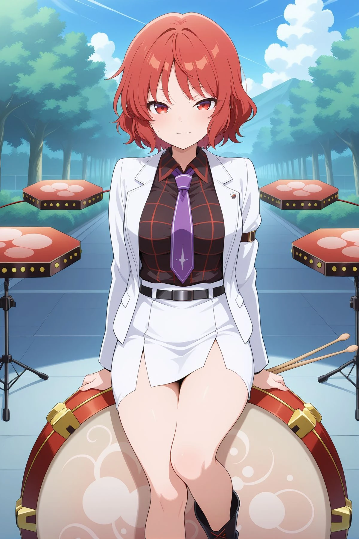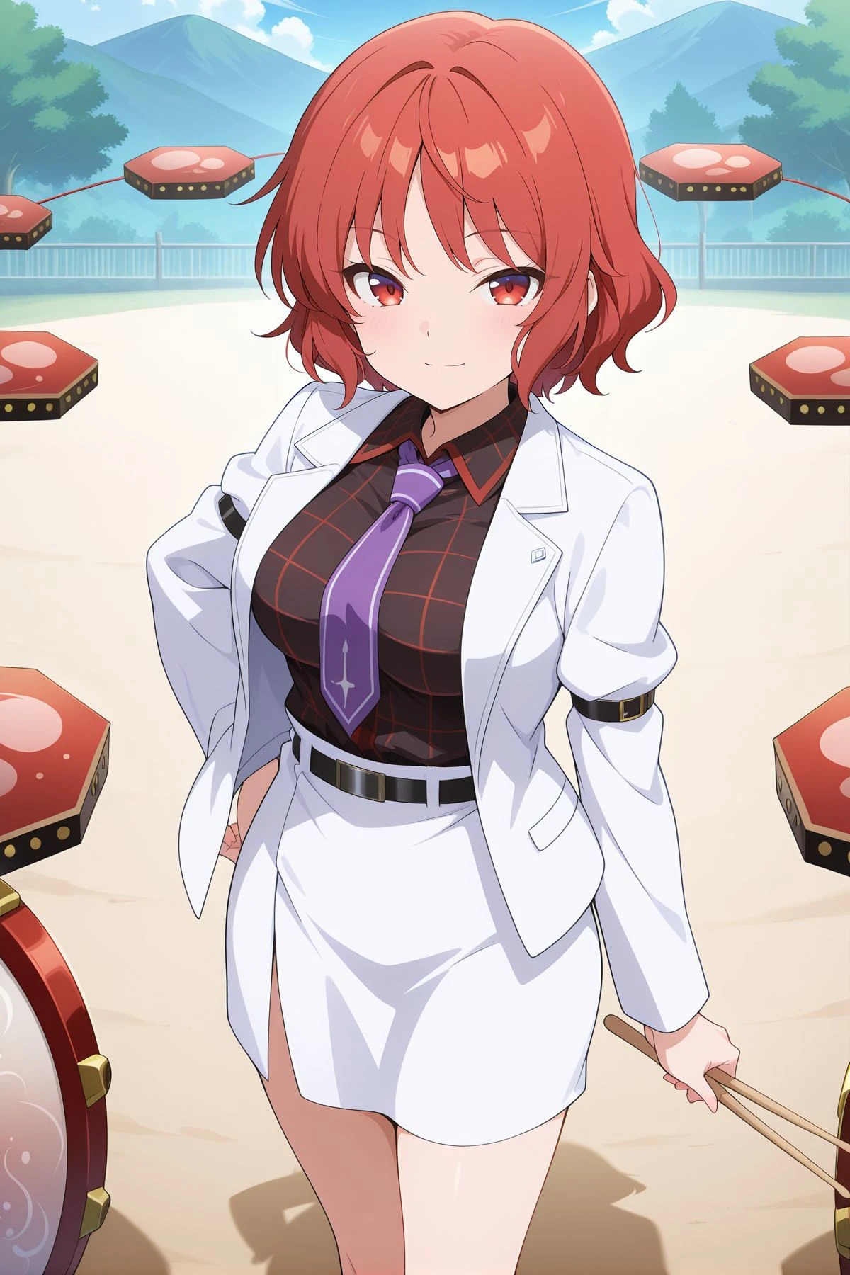 horikawa raiko, 1girl, solo, red eyes, red hair, short hair,white jacket, open jacket, black shirt, plaid shirt, purple necktie, white skirt, black belt, black boots,Alternative :