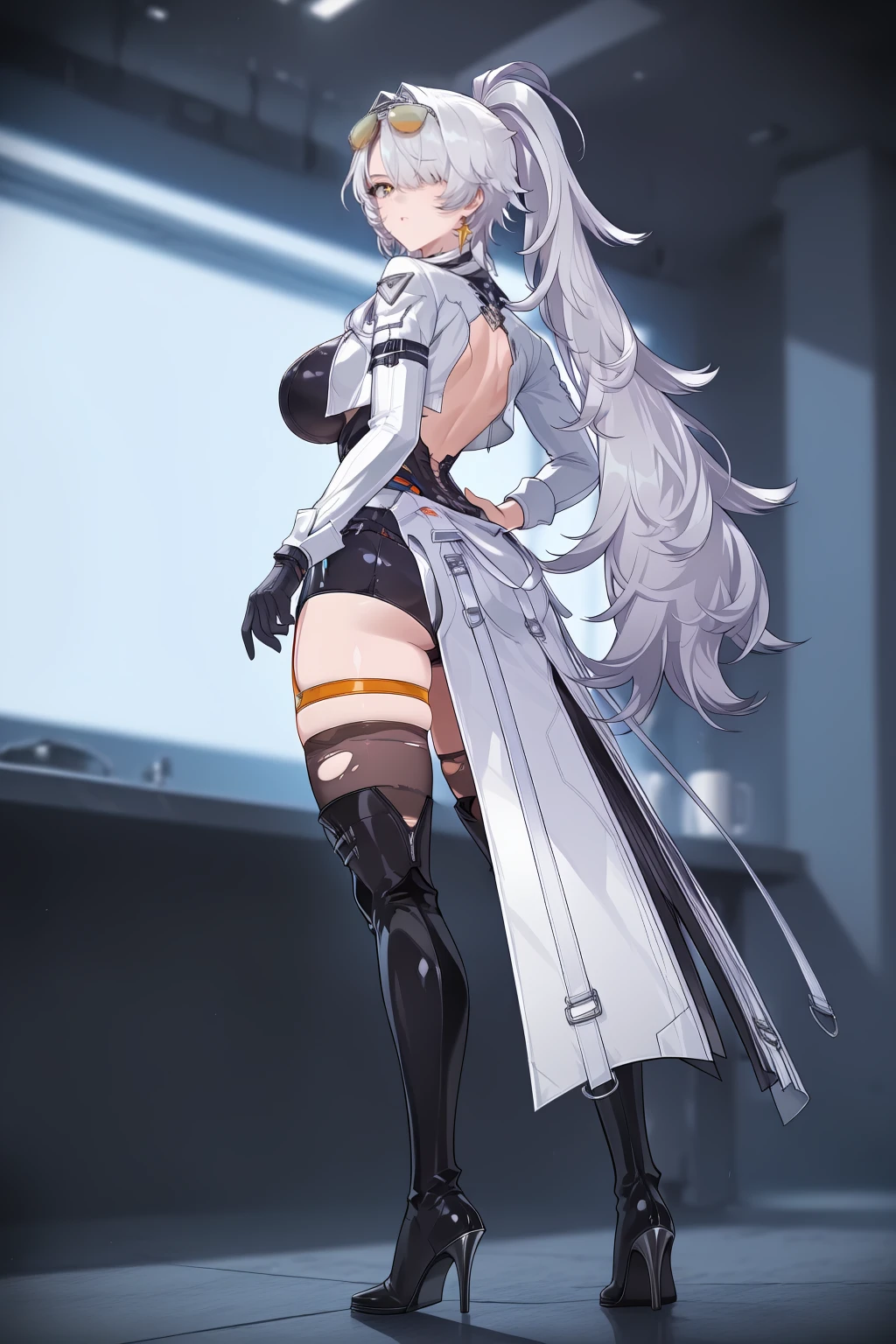 white jacket, cropped jacket, open jacket, long sleeves, black , cleavage, cleavage cutout, single glove, black glove, glove on right hand, waist cape, torn thighhighs, thigh strap, thigh boots, high heel boots, backless outfit