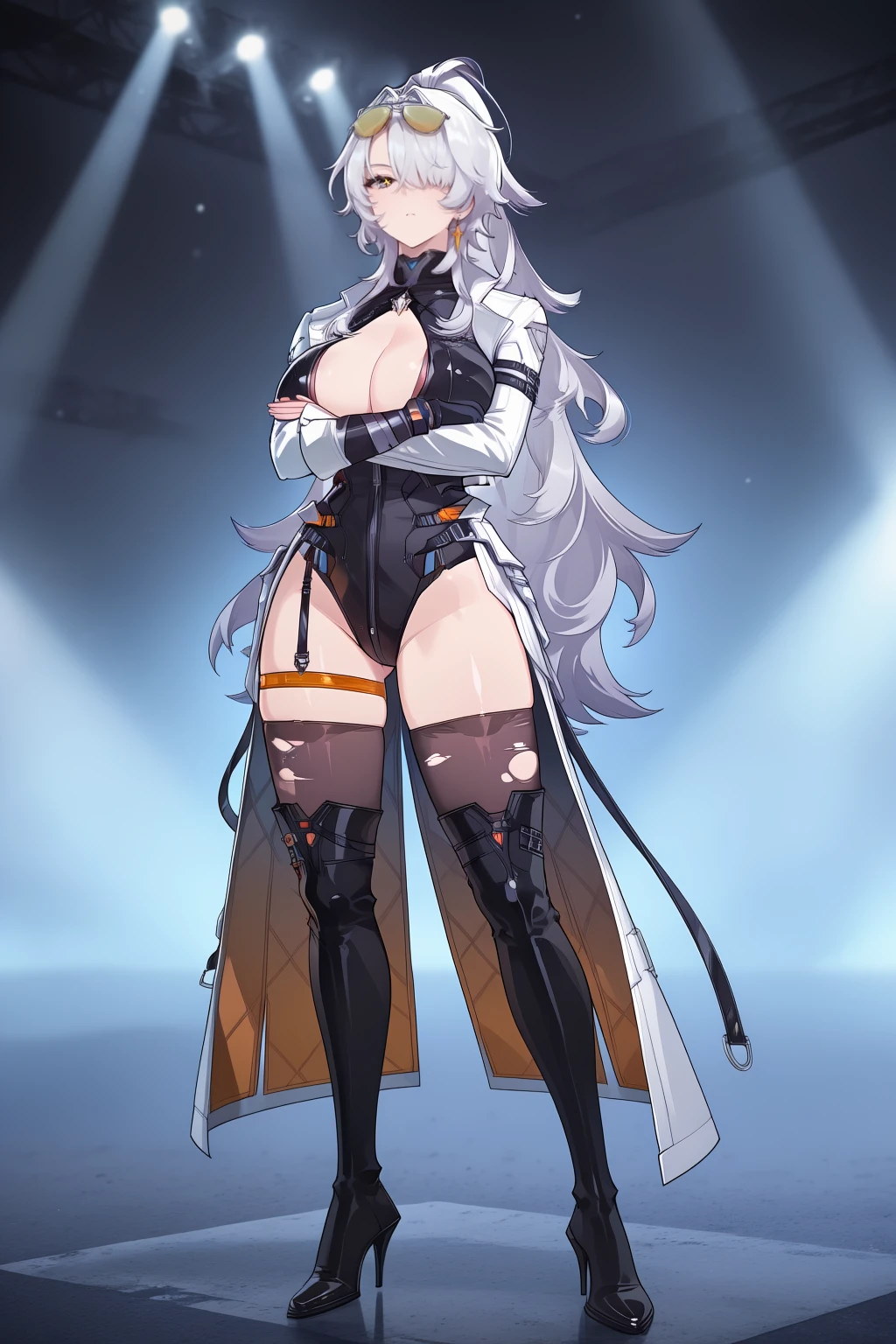 Default outfit: white jacket, cropped jacket, open jacket, long sleeves, black bodysuit, cleavage, cleavage cutout, single glove, black glove, glove on right hand, waist cape, torn thighhighs, thigh strap, thigh boots, high heel boots, backless outfit