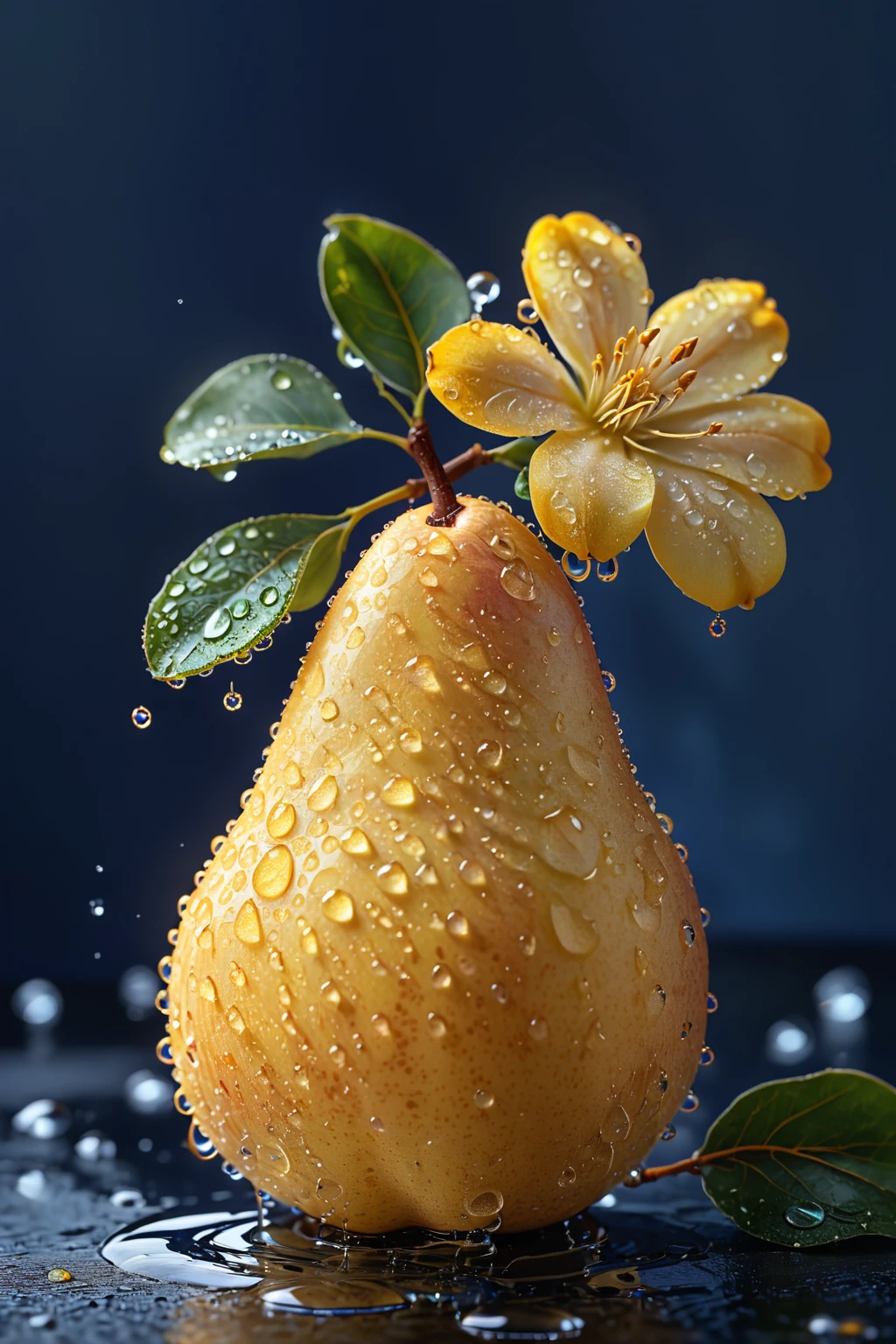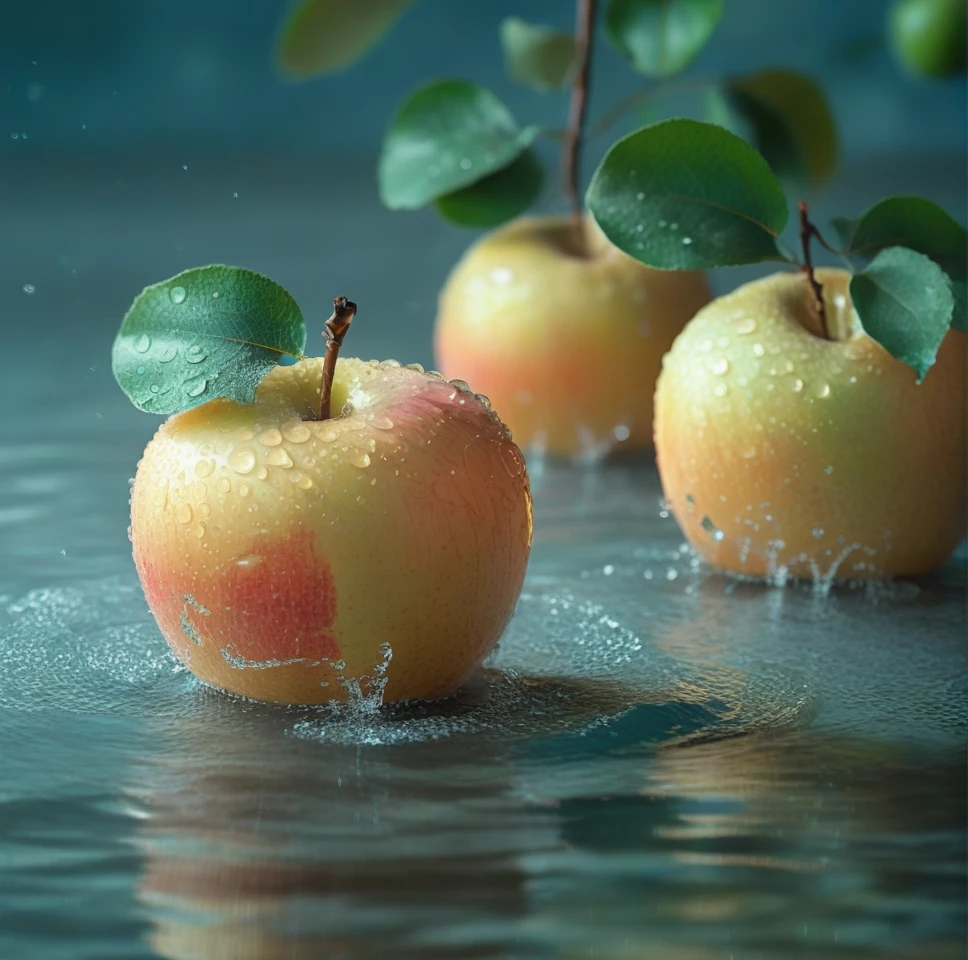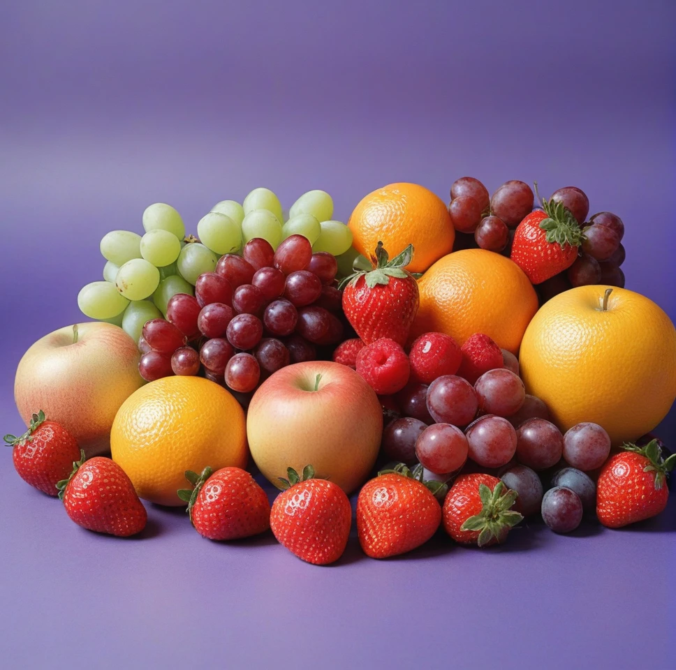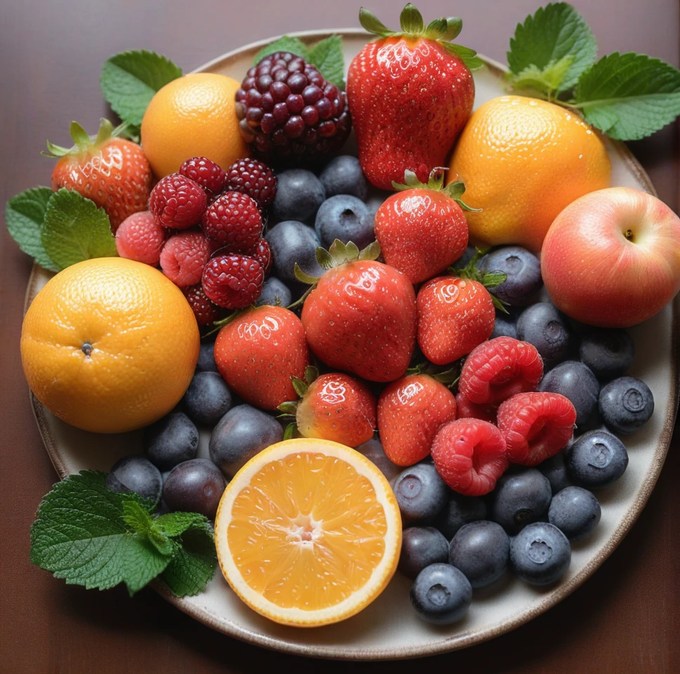 fruit photography, the image shows a tray filled with a variety of fresh fruits, apple, including strawberries, blueberries, raspberries, and other berries, as well as some leaves.