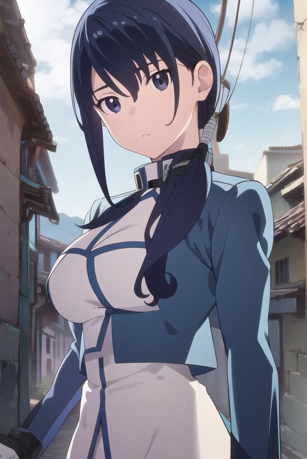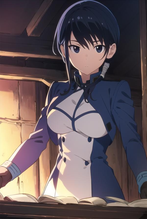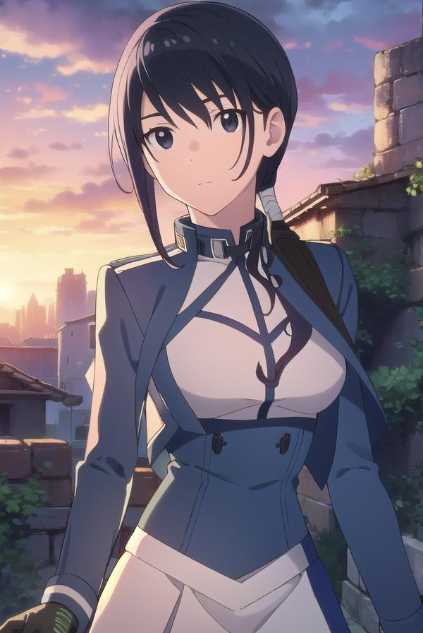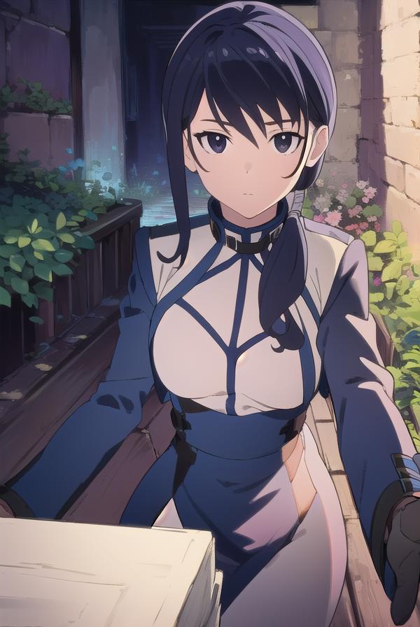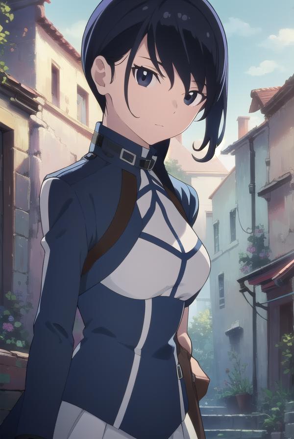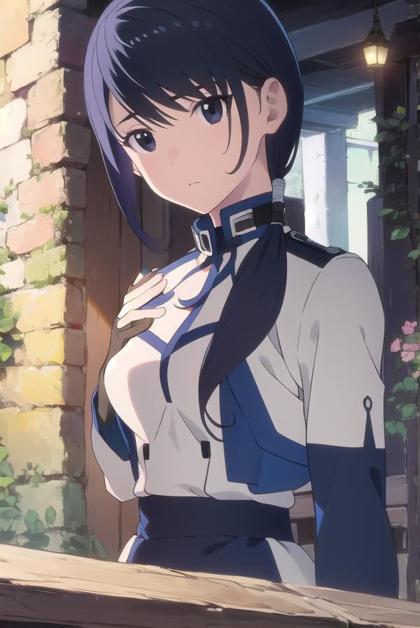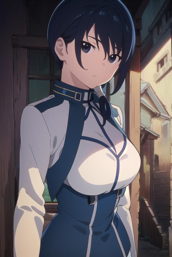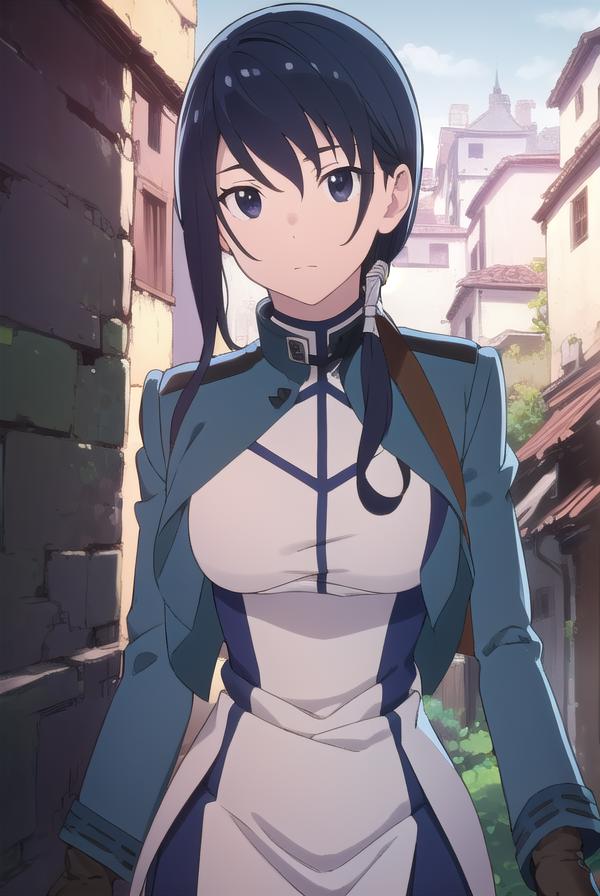 merry, short hair, blue hair, (black eyes:1.5), ponytail, low ponytail, side locks,