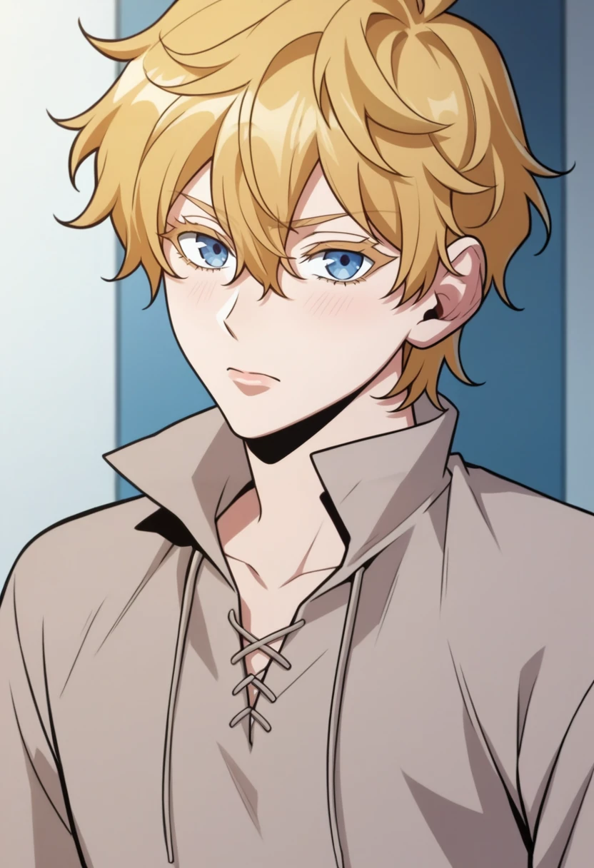 Hayoung, blue eyes, blonde hair, hair between eyes, brown shirt, long sleeves, waist belt, green pants,