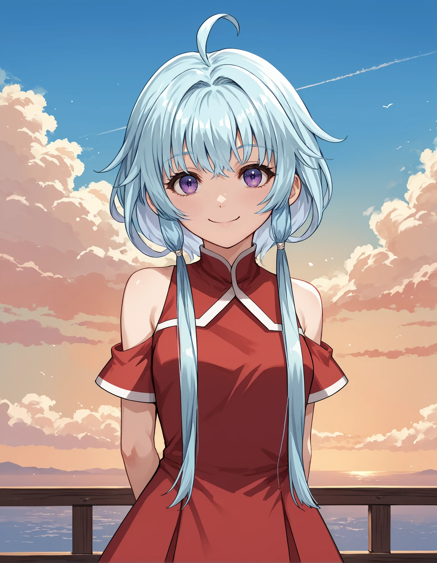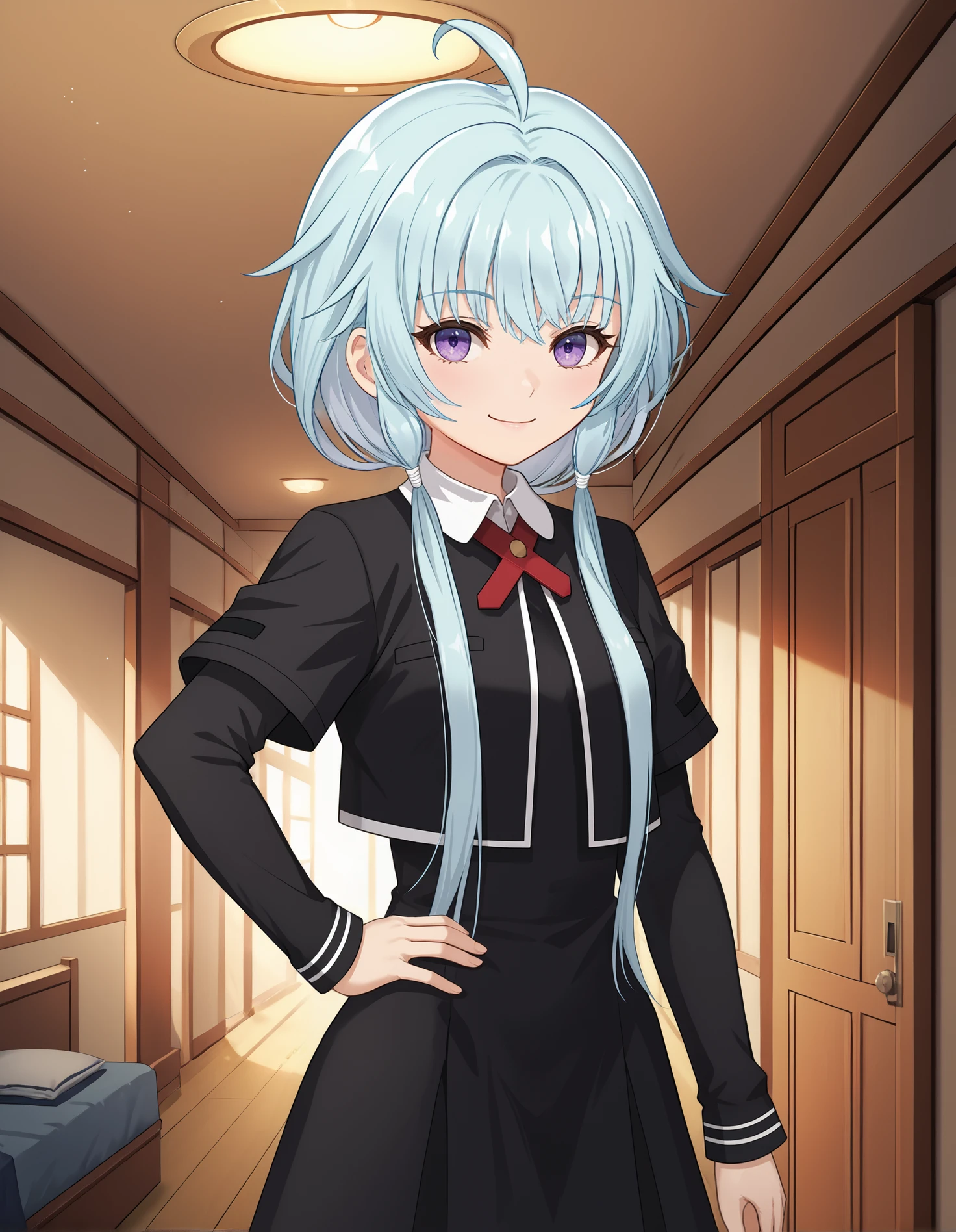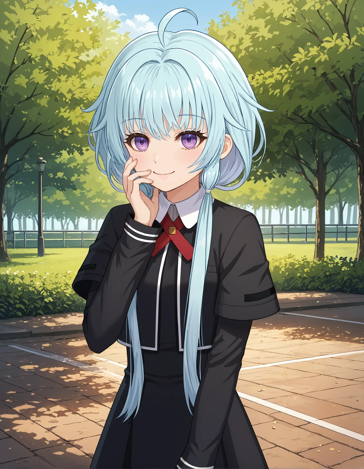 mgrcsenamikoto, smkcsl, ahoge, light blue hair, tri tails, purple eyes, white collar, red cross tie, black dress, black cropped jacket, short over long sleeves, black sleeves