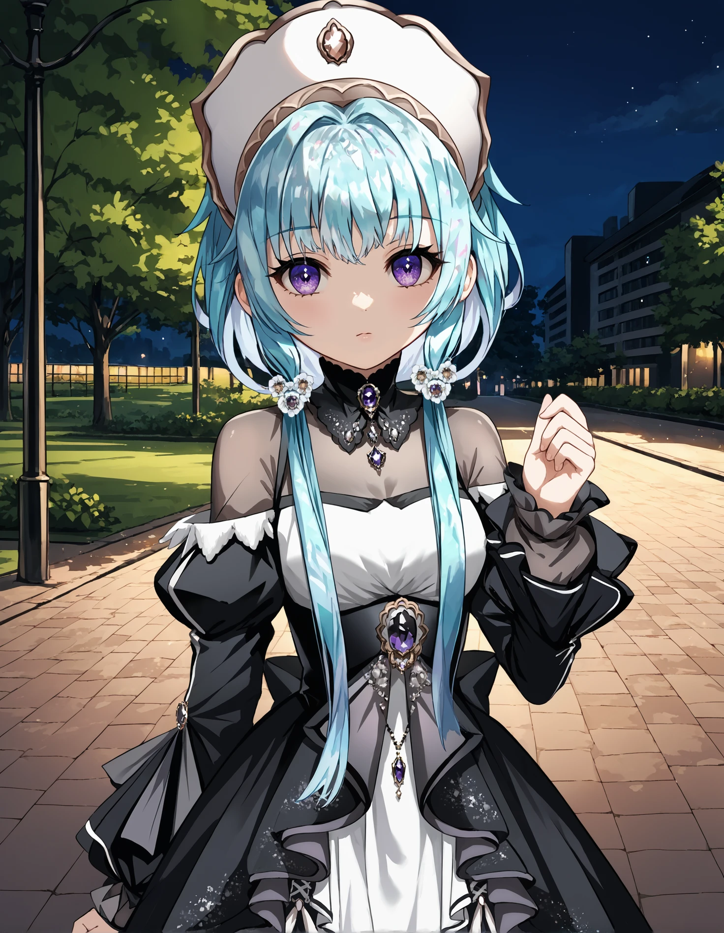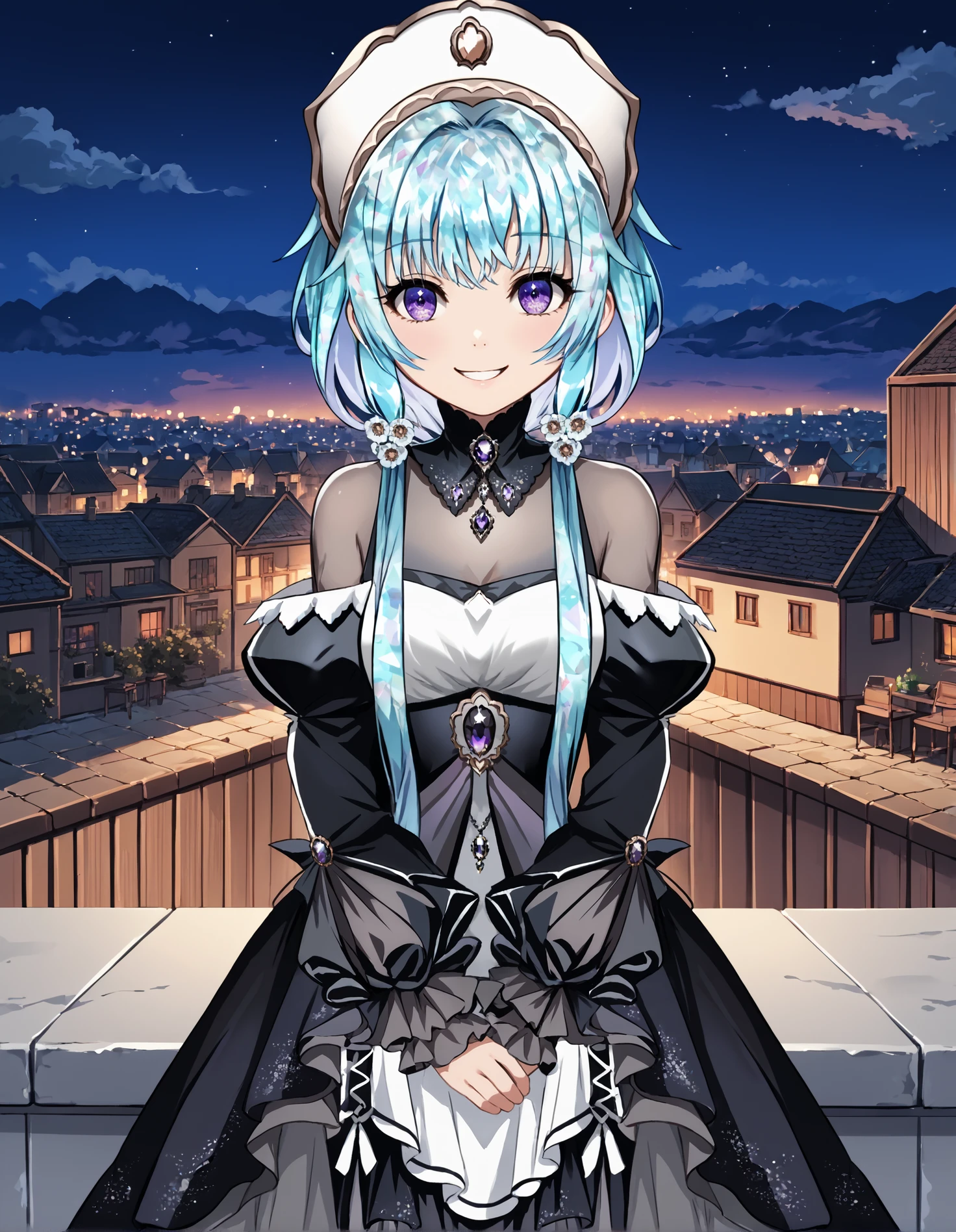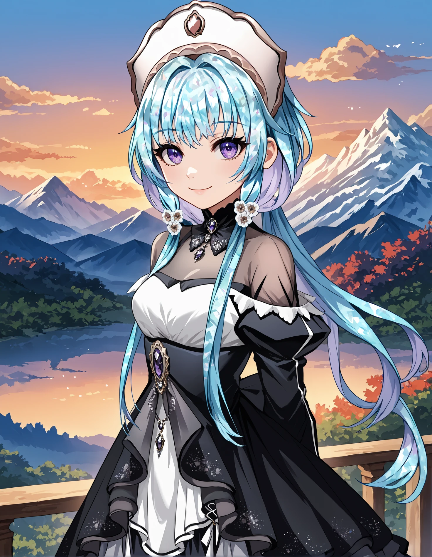 mgrcsenamikoto, smkmgc, (crystal hair:0.7), light blue hair, tri tails, purple eyes, white bonnet, white hairclips, black detached collar with gems, grey see-through compression shirt, white top, black off-shoulder frilled dress, layered juliet sleeves, black back bow, purple waist gem, grey frills, white frilled skirt