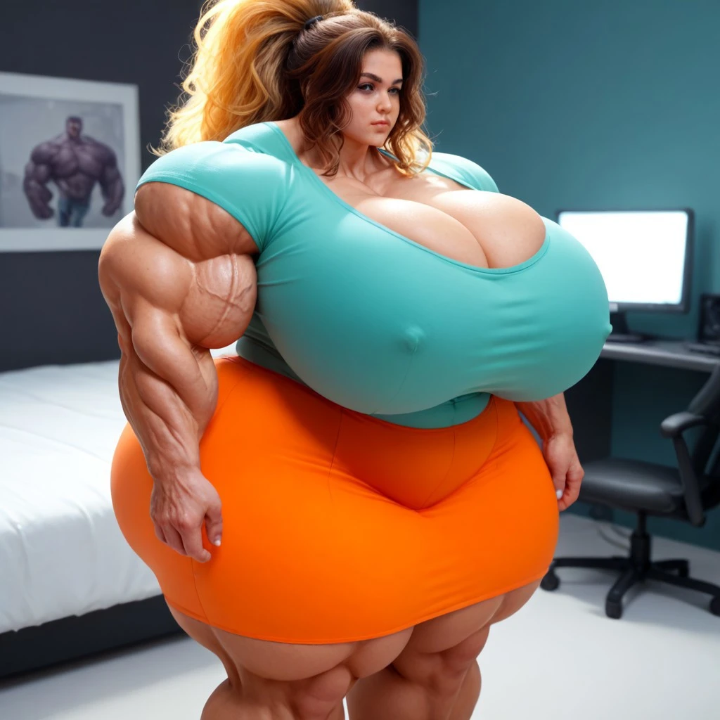 1girl, solo, petite, black eyes, brown skin, black eyebrows, dark brown hair, yellow hair band, hairstyle big fluffy ponytail, teal shirt, orange skirt with black polka dots, green short, purple shoes, big eyes, short stature