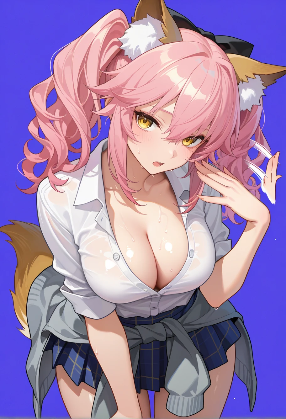 t4m4mojk, yellow eyes, pink hair, long hair, twintails, sidelocks, hair between eyes, black bow, hair bow, white shirt, sleeves rolled up, red bowtie, striped bowtie, grey cardigan, cardigan around waist, blue skirt, plaid skirt, knee socks, black socks, black loeafers
