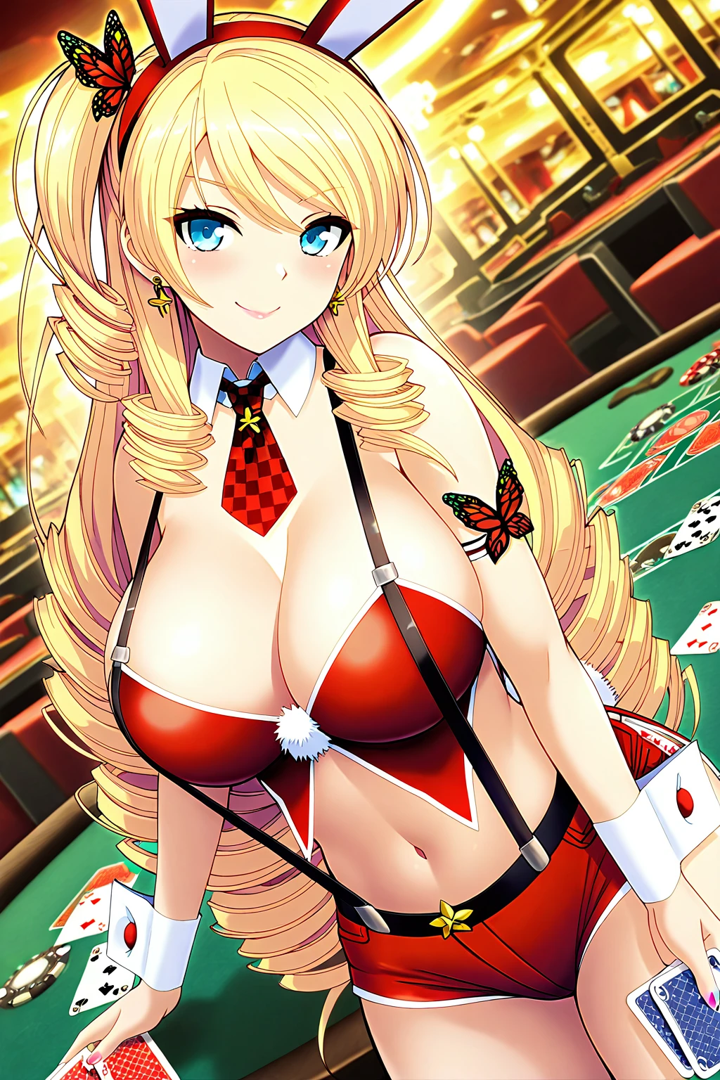 nm_bny, teg_nm, 1girl, solo, blue eyes, blonde hair, long hair, drill hair, large breasts, lips, one side up, red rabbit ears, butterfly hair ornament, earrings, detached collar, necktie, suspenders, bare shoulders, crop top, cleavage, navel, wrist cuffs, short shorts, rabbit tail,