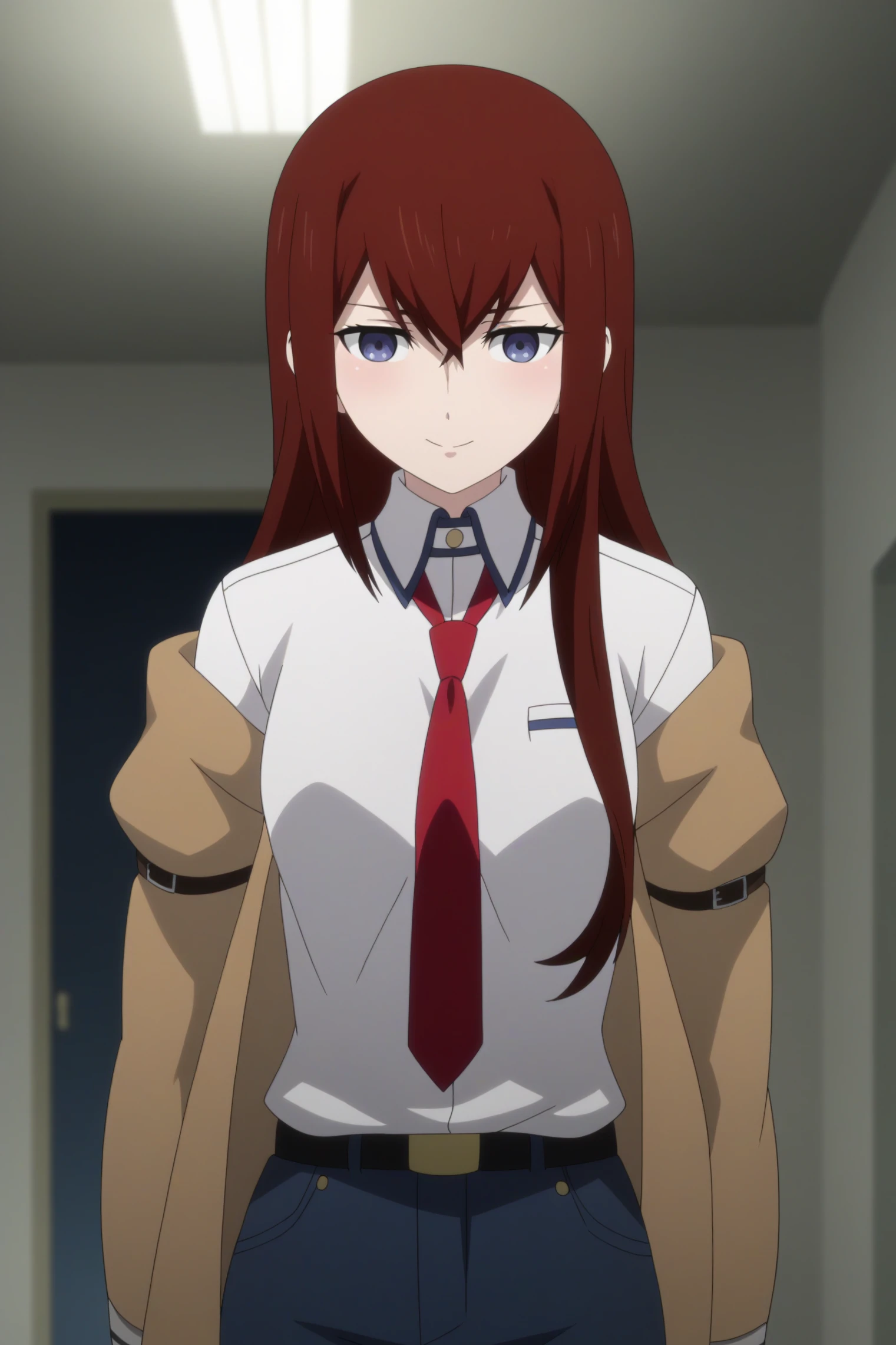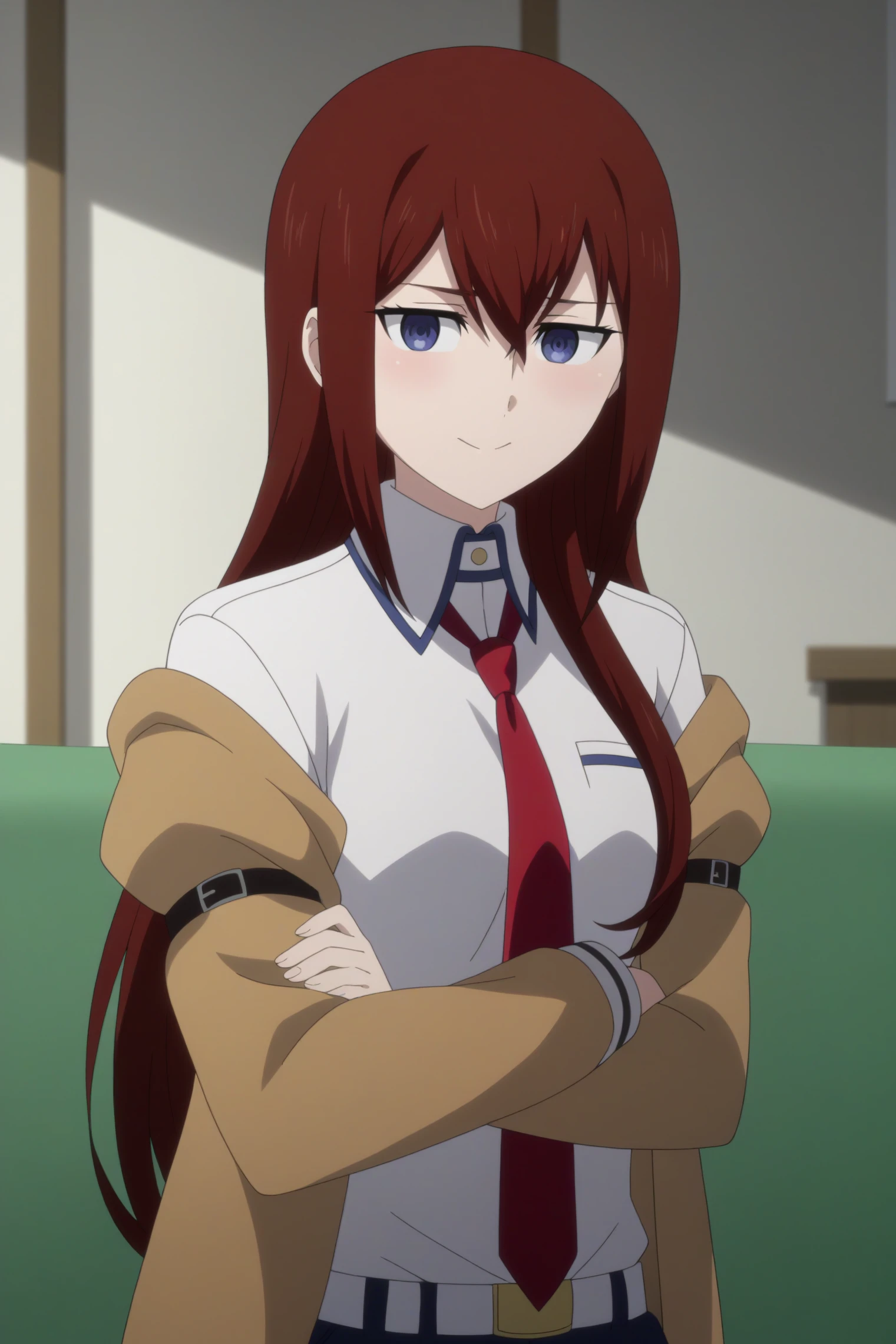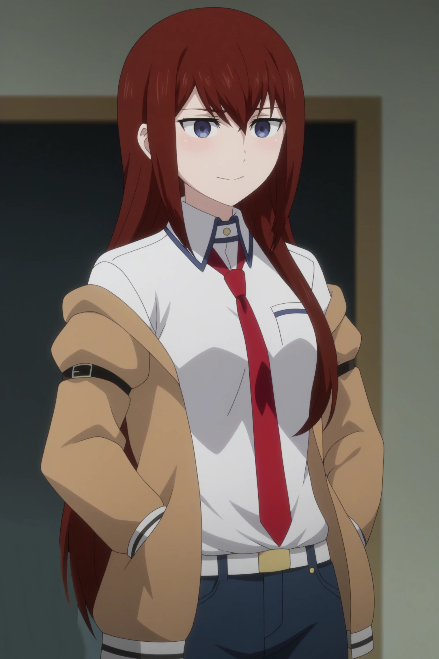 Triggers : 1girl,solo,kurisu makise,long hair,red necktie,jacket,brown hair,collared shirt