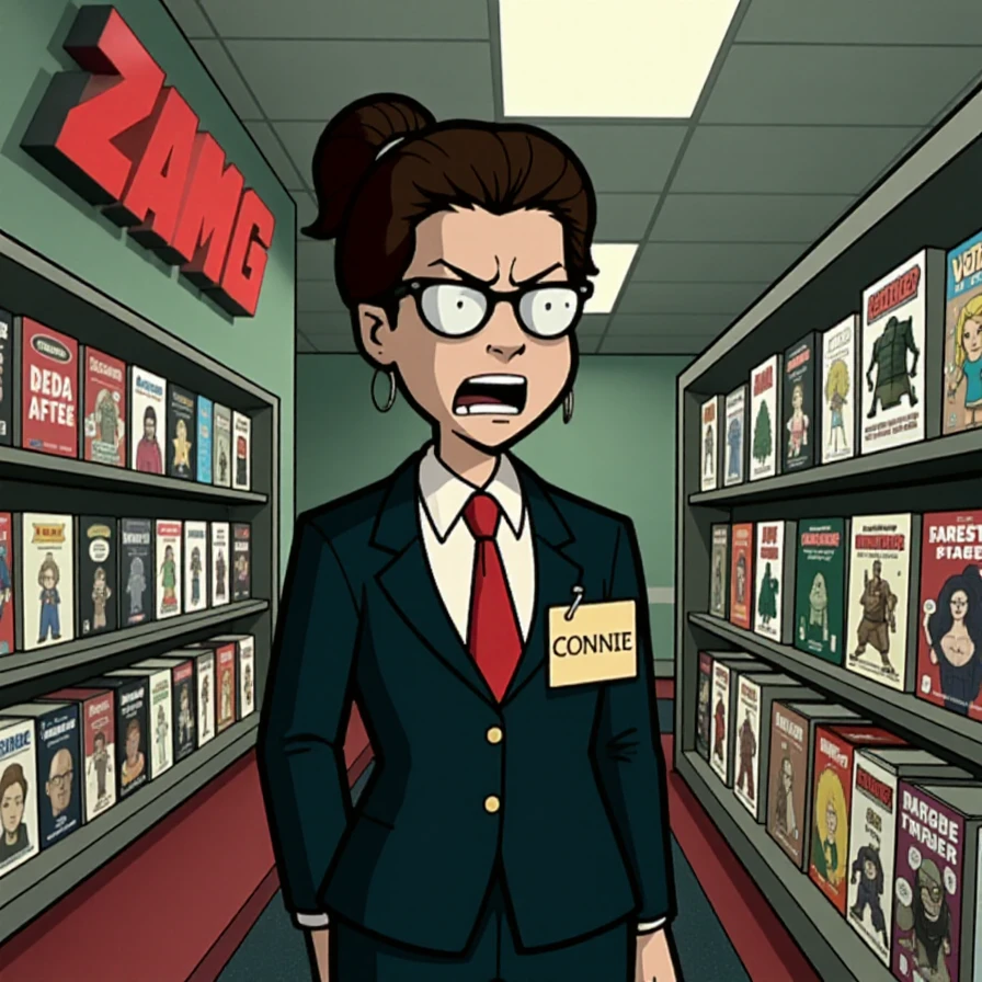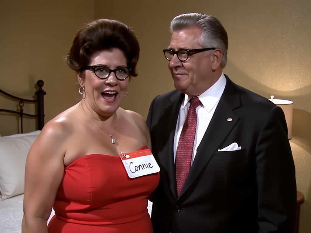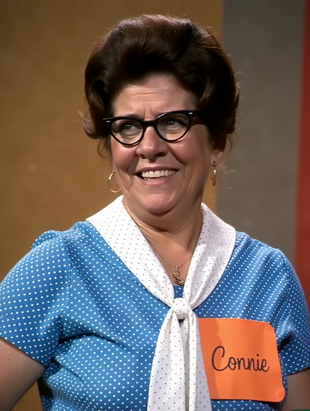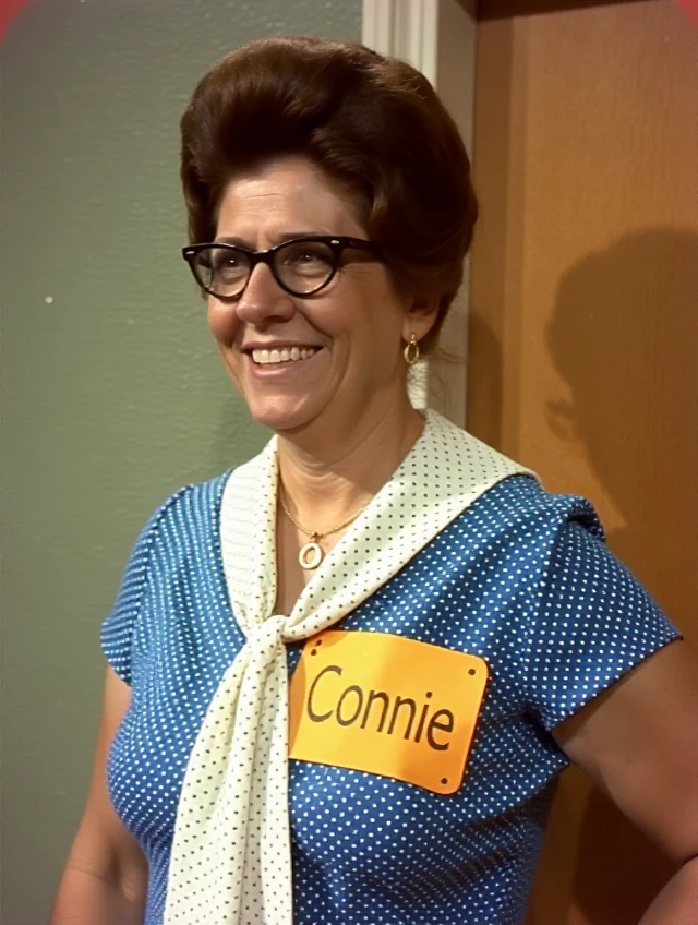 connie_tpir, woman, middle age, brown hair, hair in bun, black frame glasses, hoop_earrings, 1960s, jewelry, nametag on chest, white polkadot neckerchief, blue polkadot dress, name tag with the words "Connie", necklace, excited,
