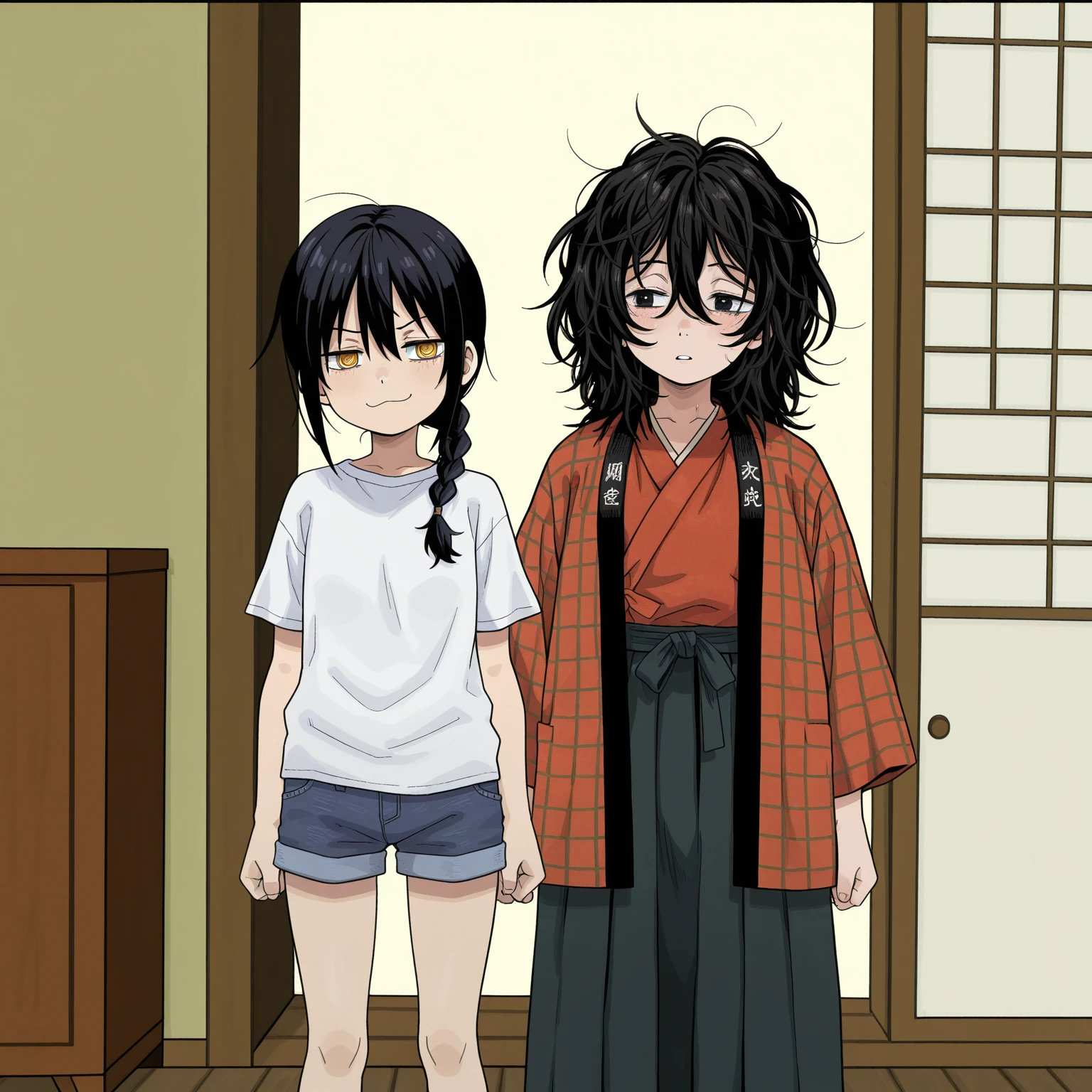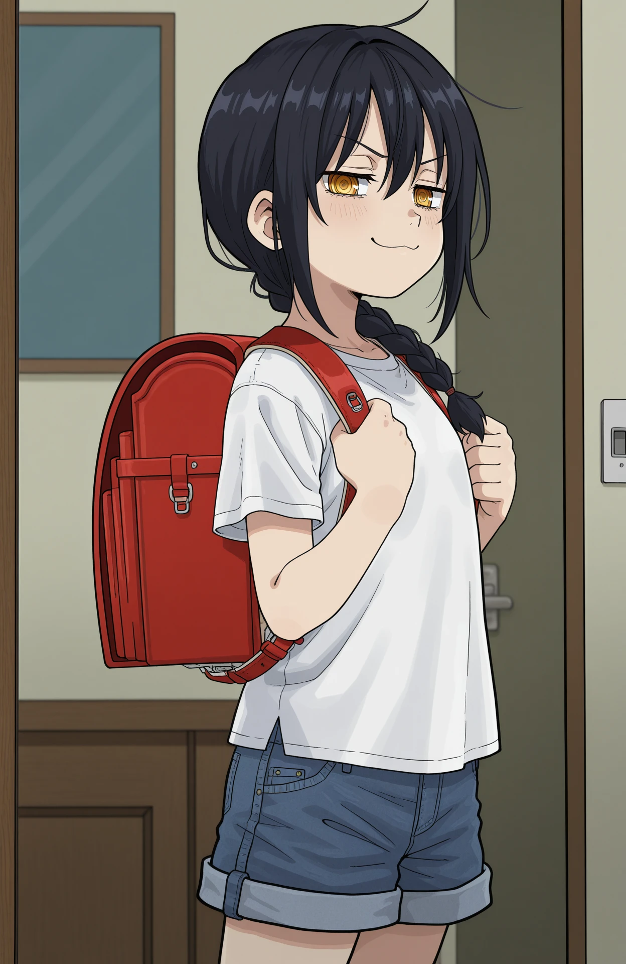 gnsisir, nayuta, yellow eyes, ringed eyes, black hair, single braid, randoseru, white shirt, short sleeves, denim shorts, wide shorts
