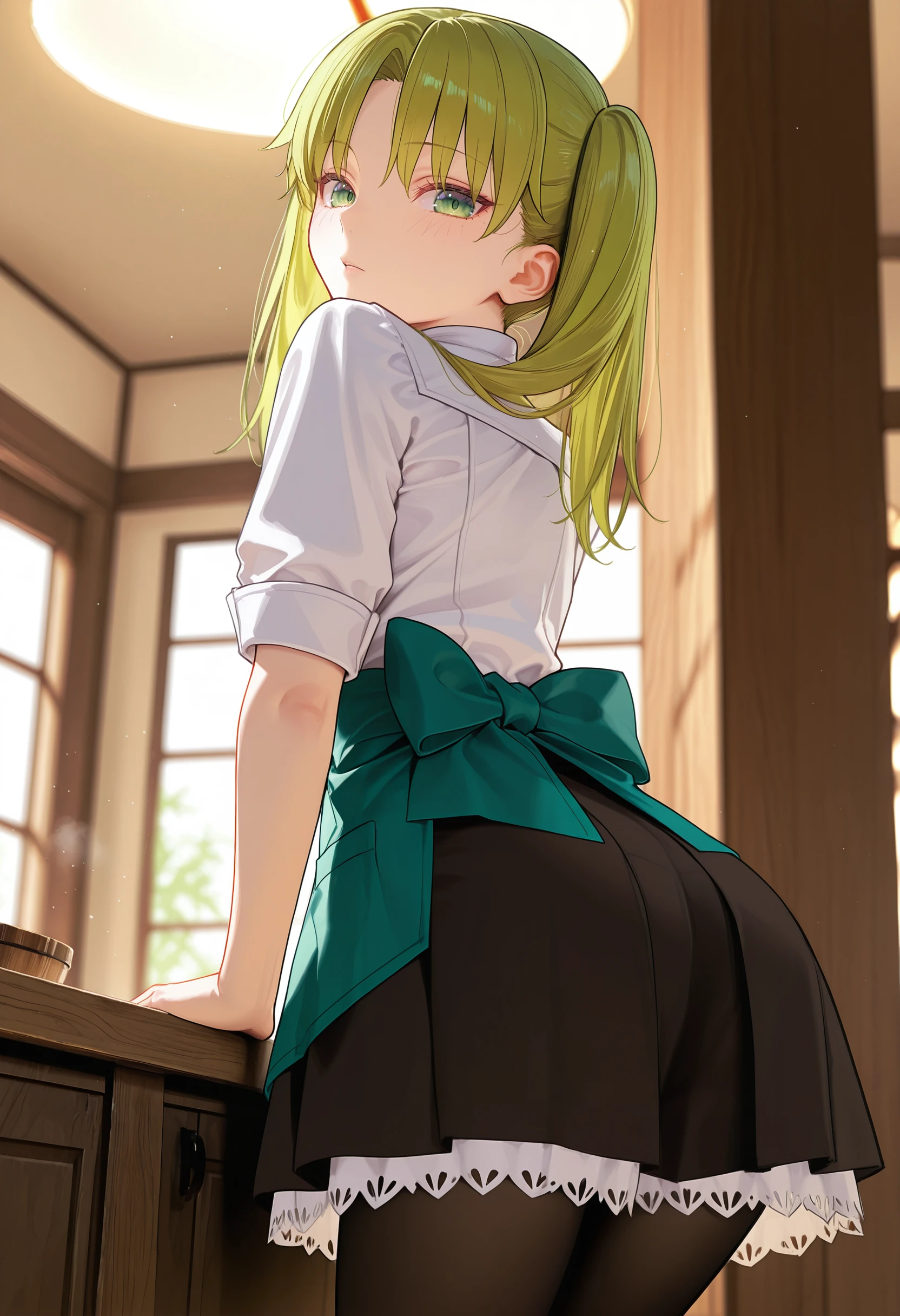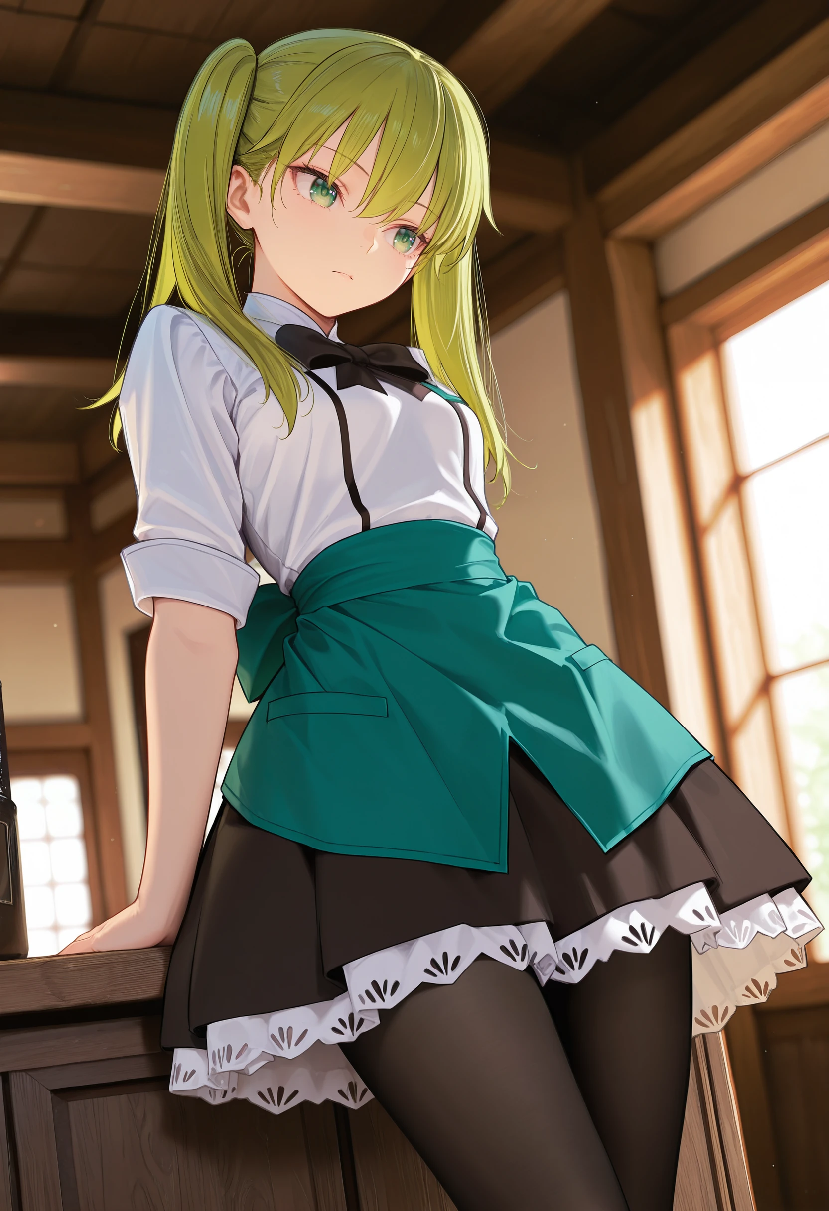 Waitress: black bow, waitress, short sleeves, black pantyhose, two-tone skirt, back bow, twintails, green back bow, loafers