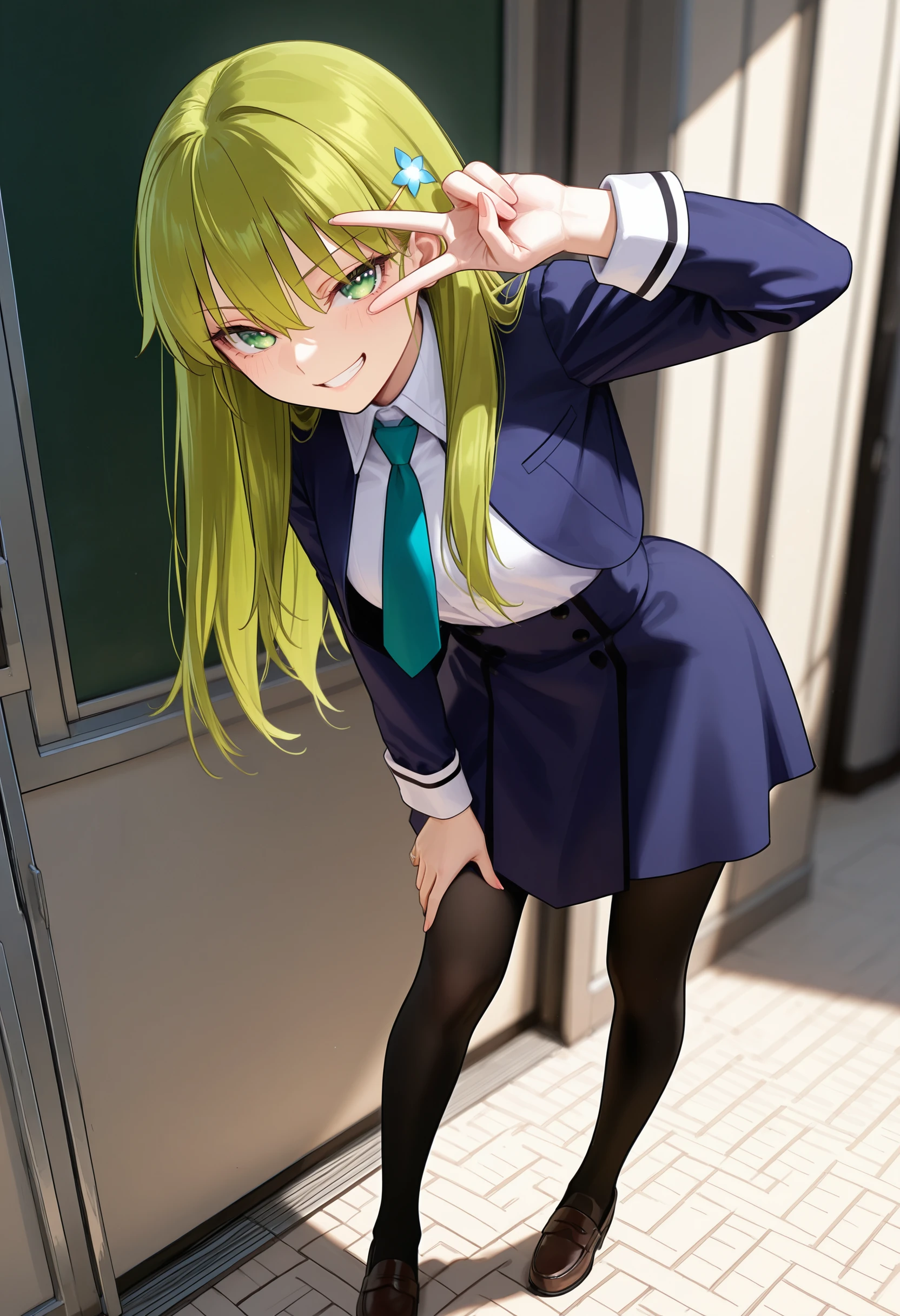 Default outfit: school uniform, pantyhose, necktie, loafers, blue skirt, blue jacket, collared shirt, high-waist skirt, hair ornament,