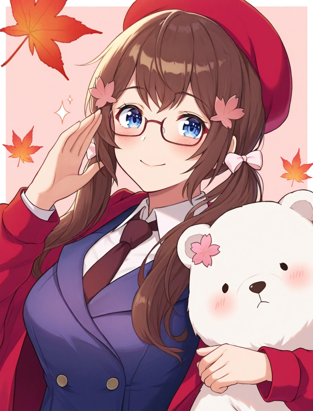 hat, hairclip, hair bow, glasses, red jacket, blue vest, white shirt, necktie, blue skirt