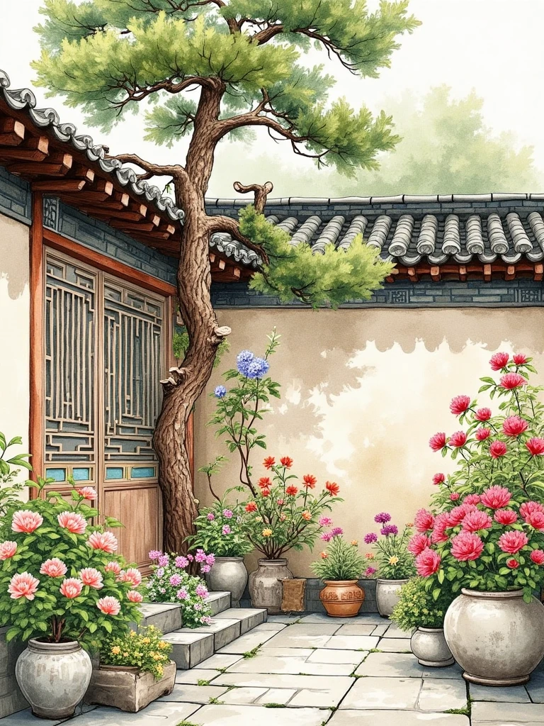Base Prompt:Traditional Chinese courtyard with lush plants