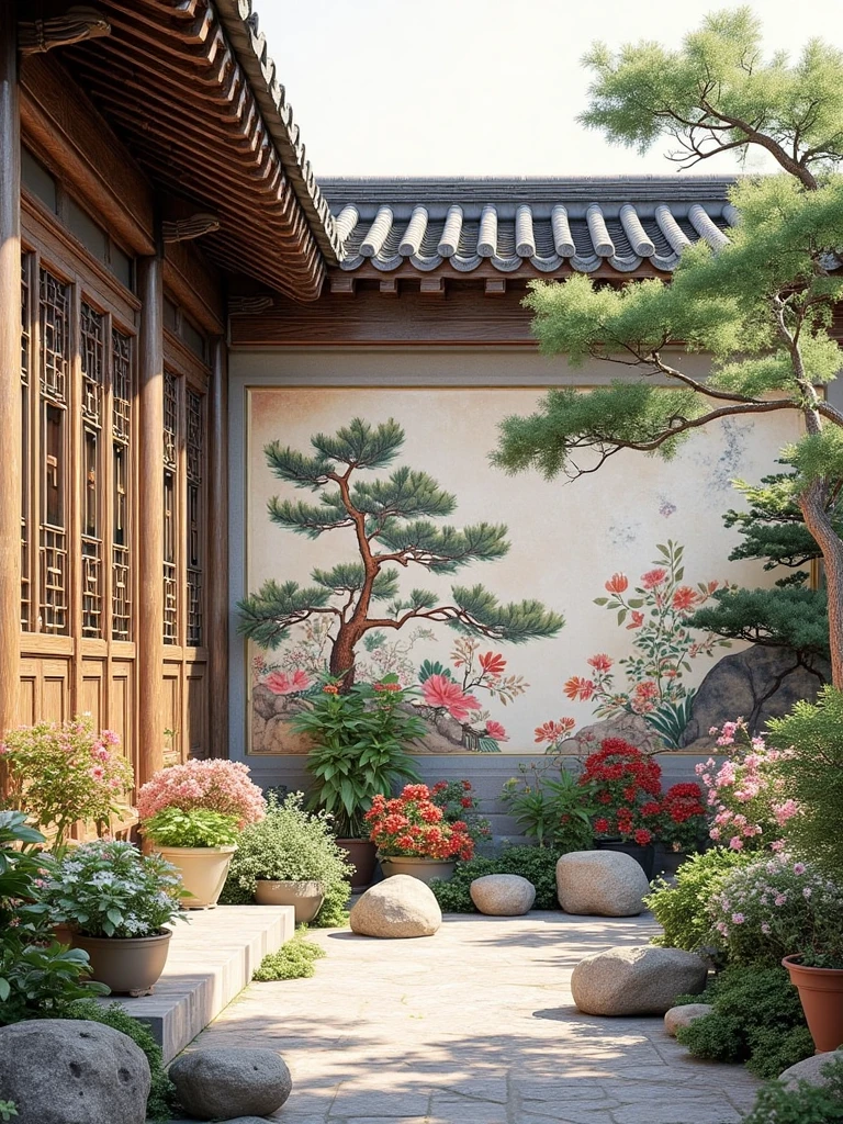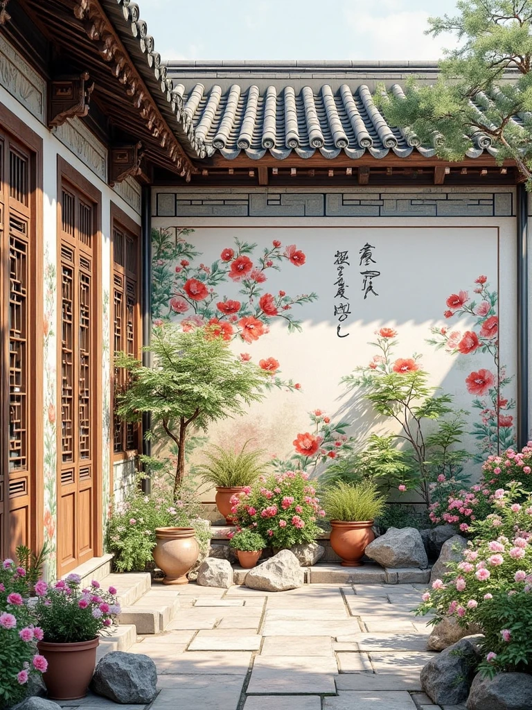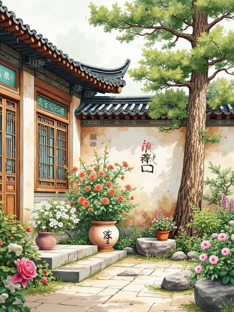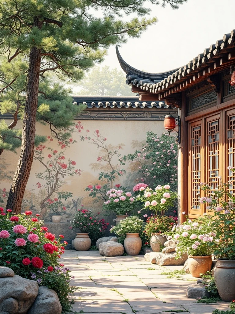 6. Traditional Chinese courtyard with lush plants, classic layout, blooming roses, pine trees, summer sunshine, presenting a lively and vibrant view.