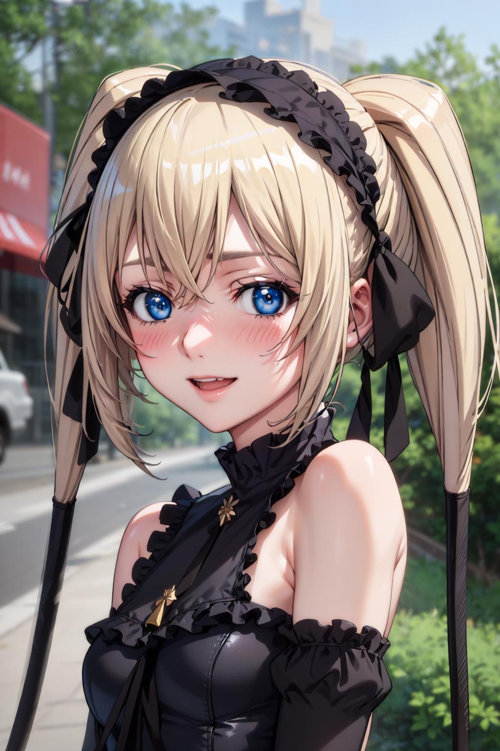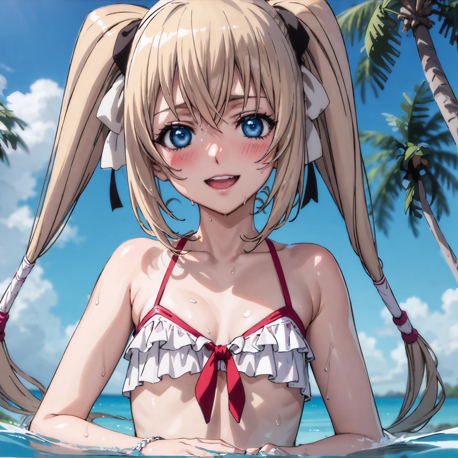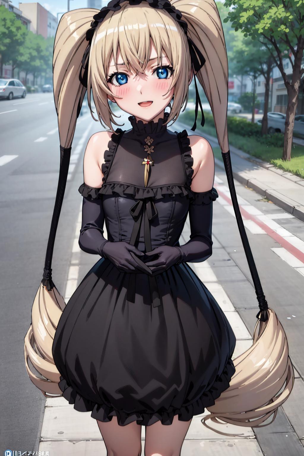 Character: katerina kurae, twintails, low-tied_long_hair, hair ends, very long hair, blonde hair, flat chest, blue eyes