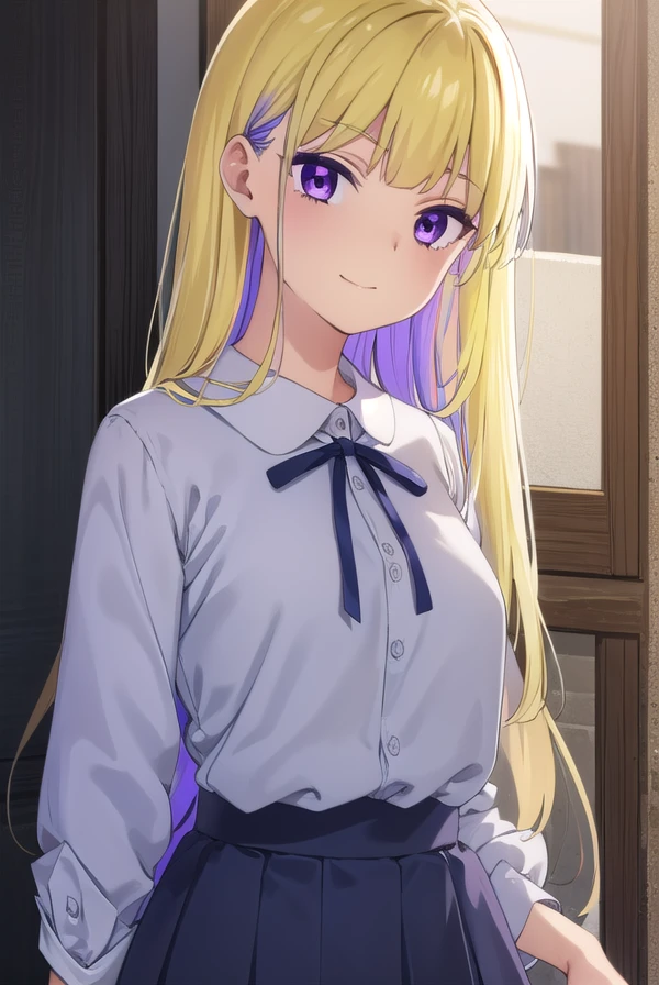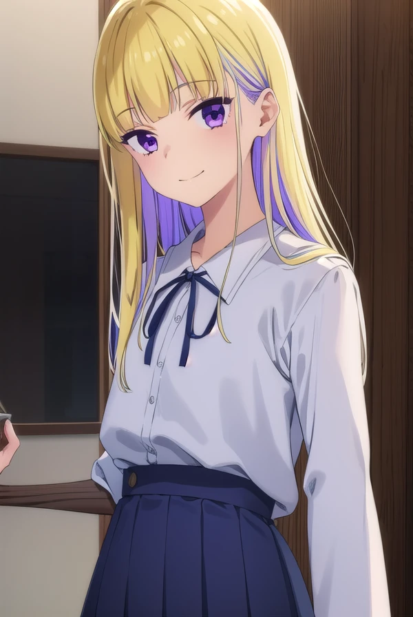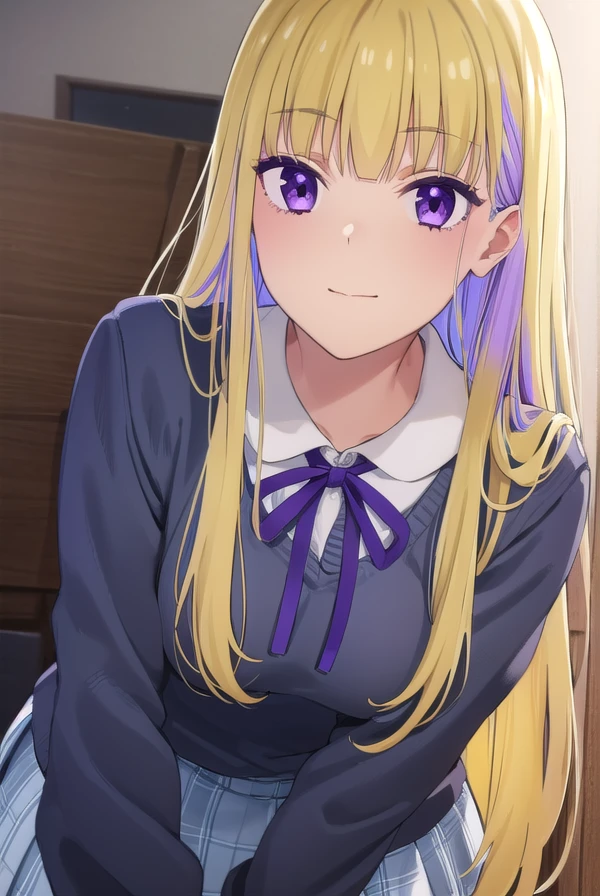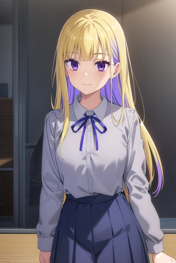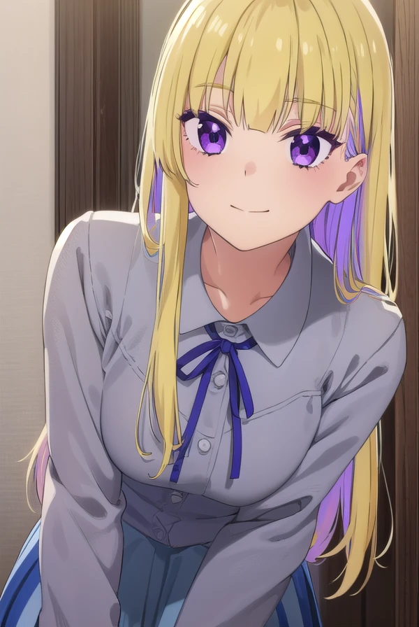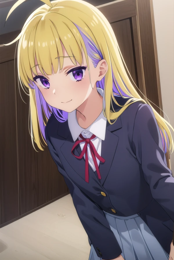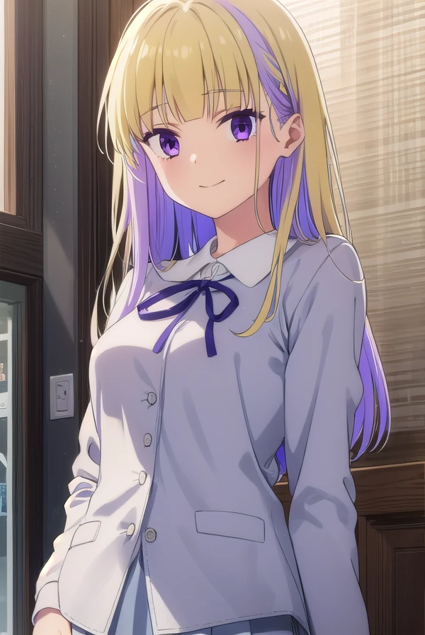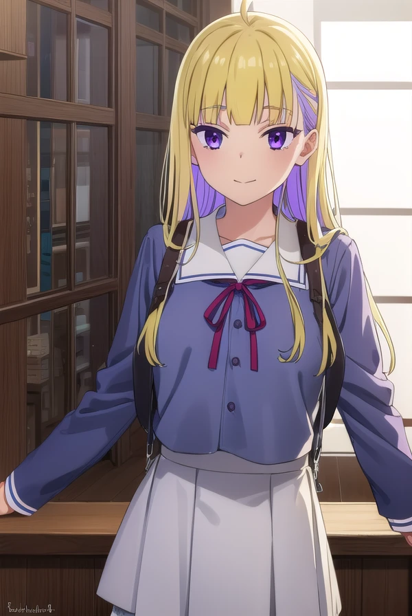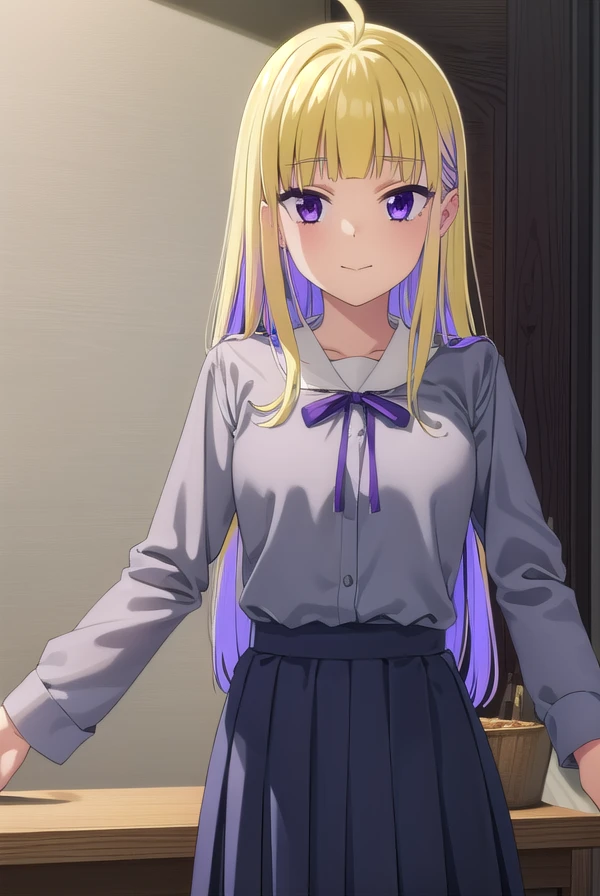 reimi itsushiro, long hair, bangs, blonde hair, (purple eyes:1.1), purple hair, ahoge, multicolored hair, blunt bangs, two-tone hair,