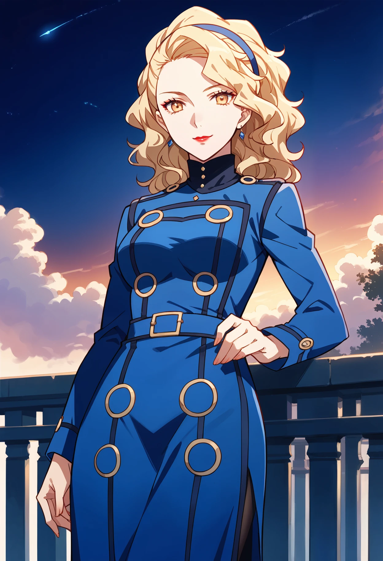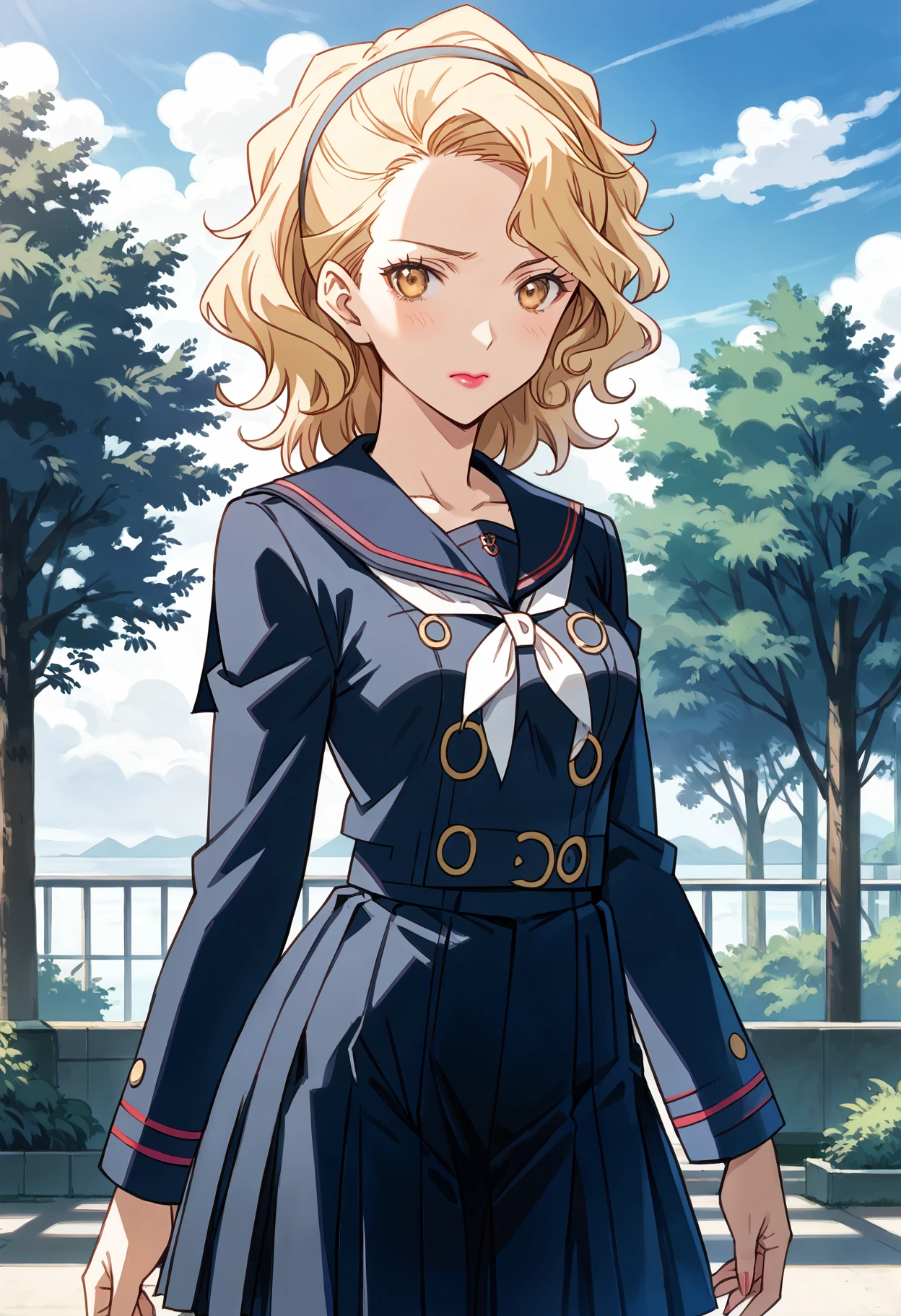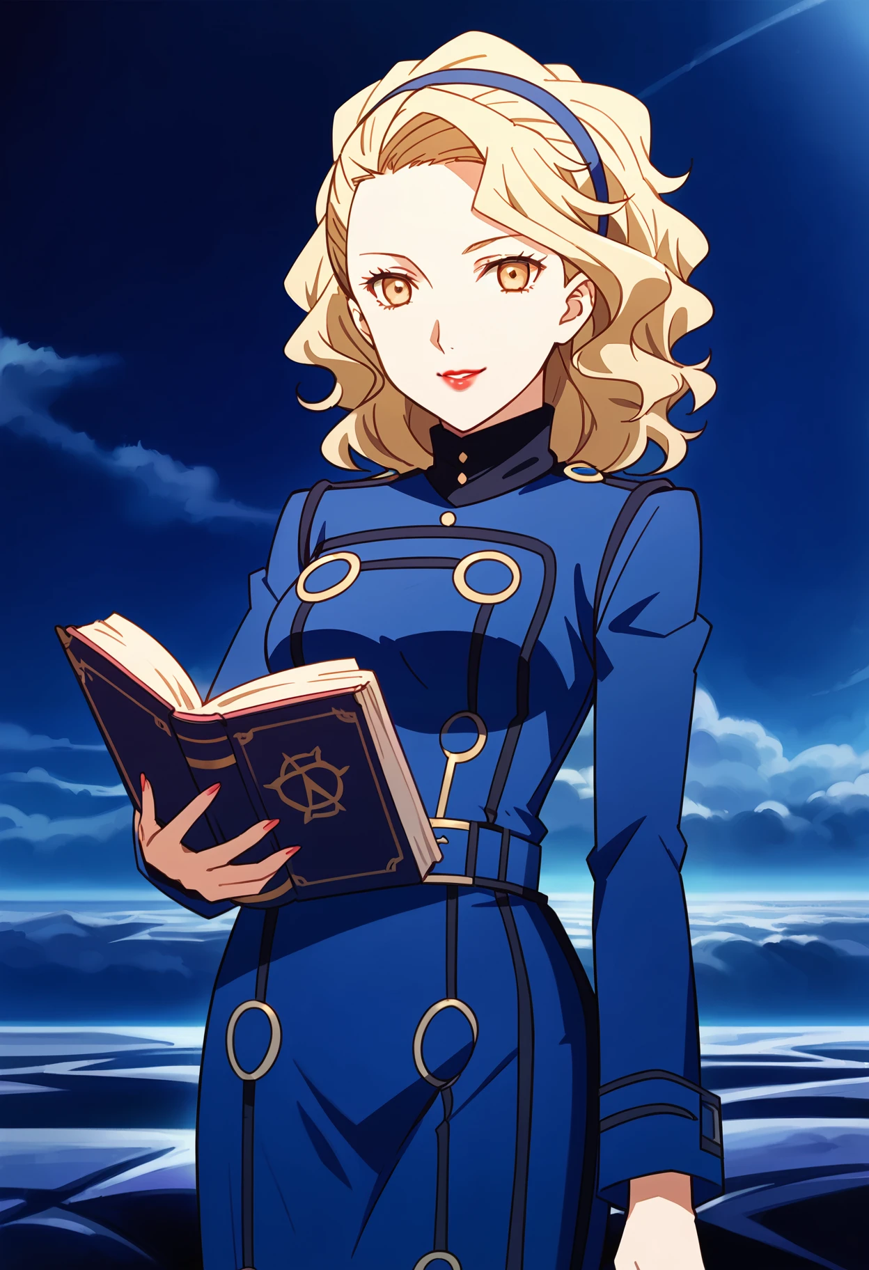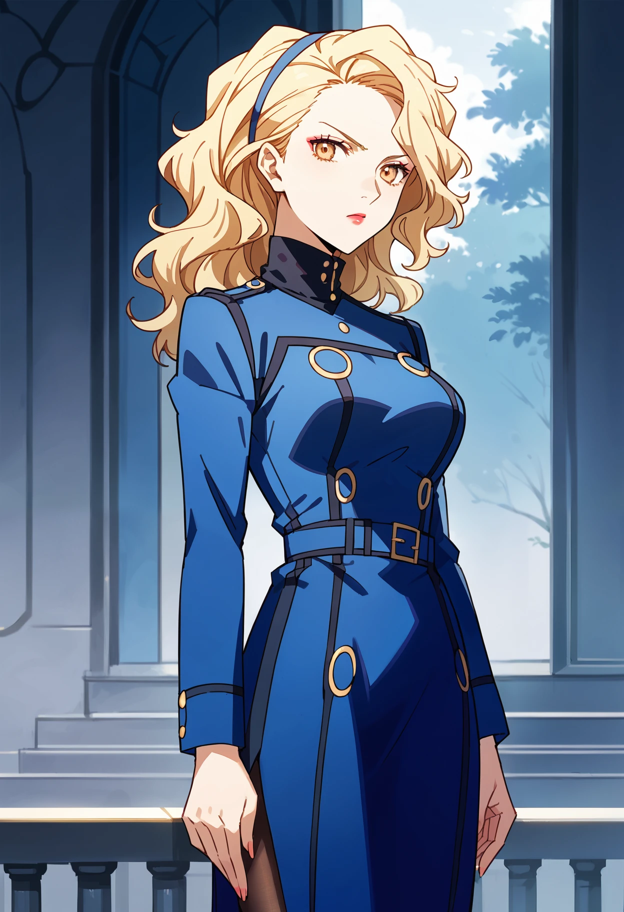 p4margaret, yellow eyes, blonde hair, wavy hair, headband, lipstick, makeup, Default outfit: