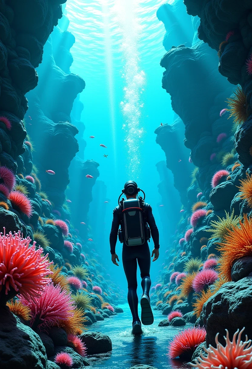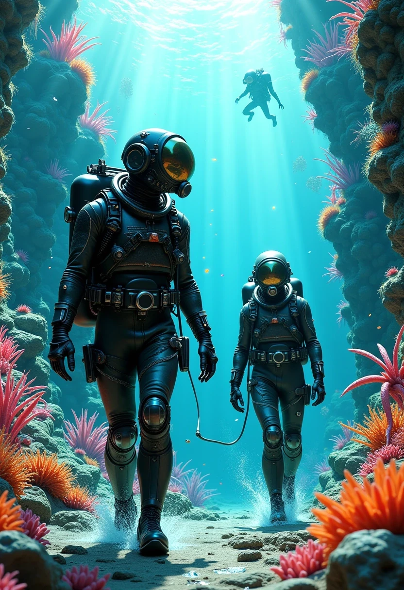 Clad in a sleek, biomechanical exosuit designed for extreme environments, this diver is built for one purpose: to go where no human has gone before.