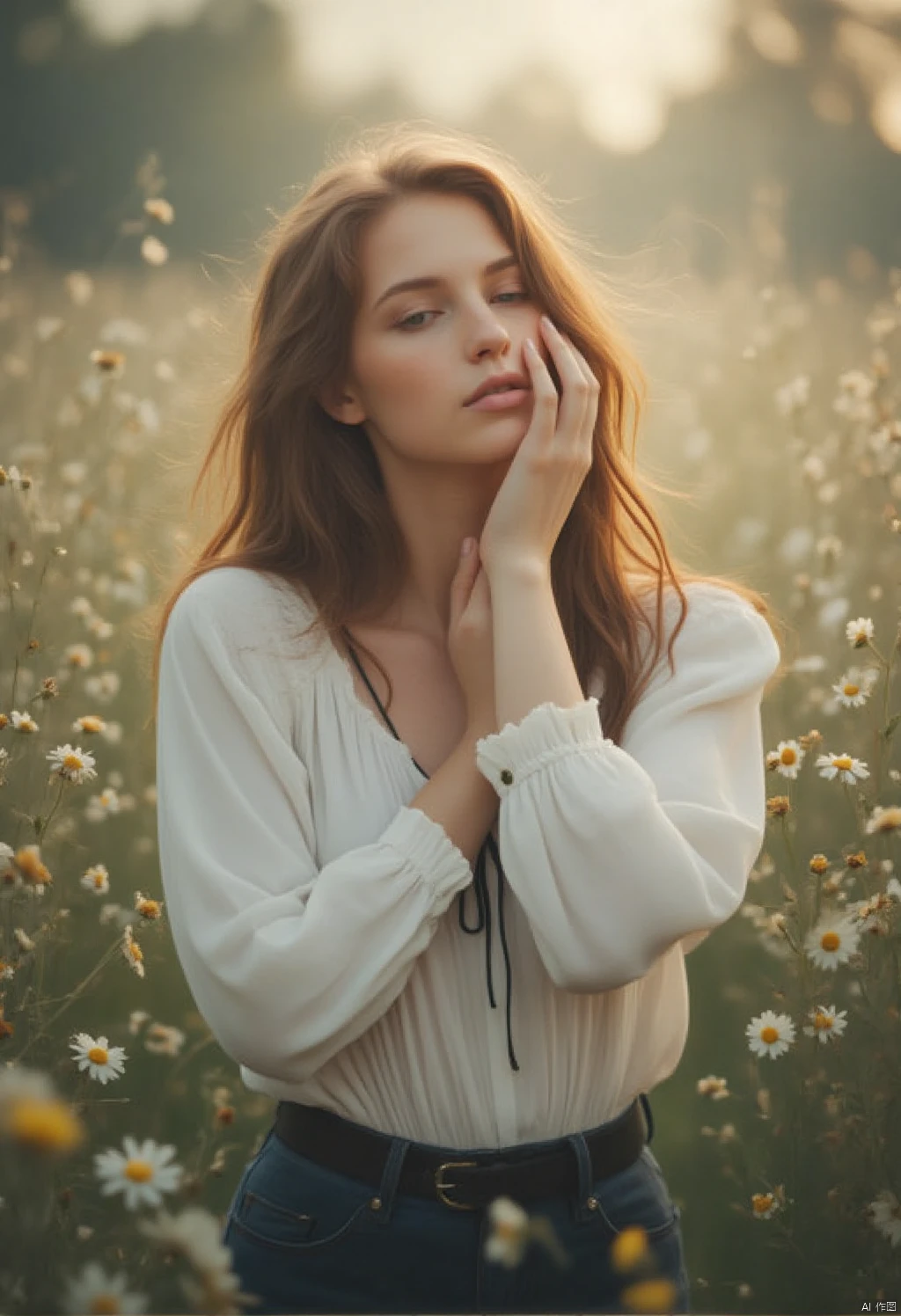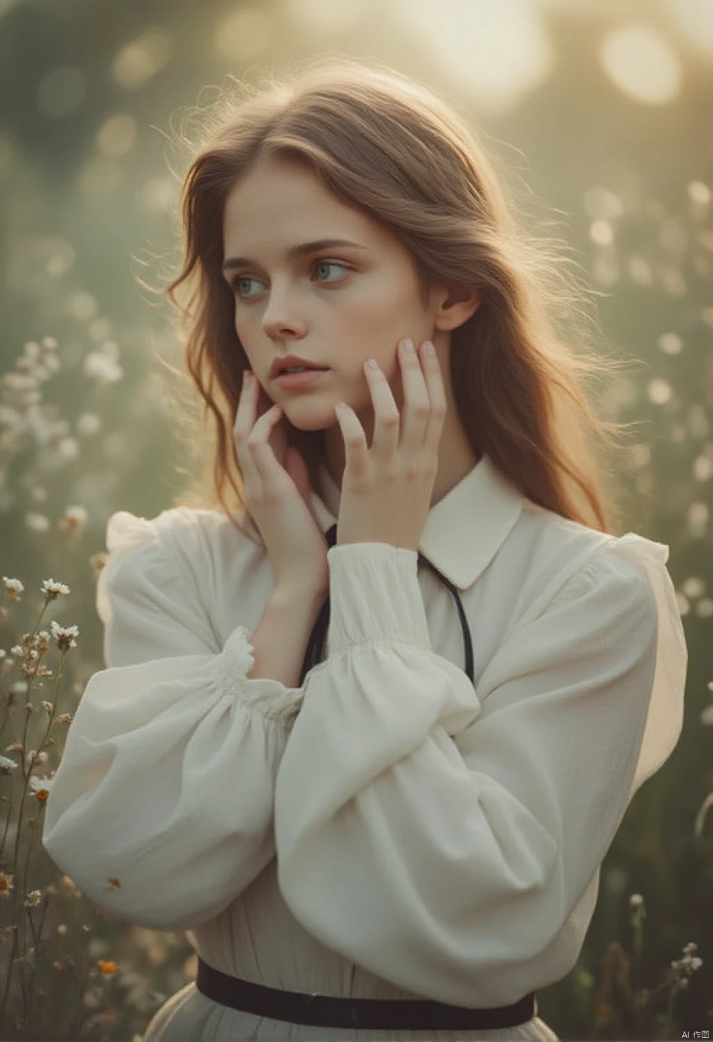 -Recommendation: Dreamy texture, a beautiful young woman with long brown hair stands in a field of wildflowers. She is dressed in a white blouse with a black belt tied around her waist. She is dressed in a white blouse with a black belt tied around her waist. Her hands are held up to her face