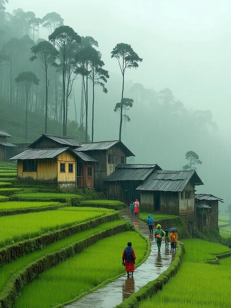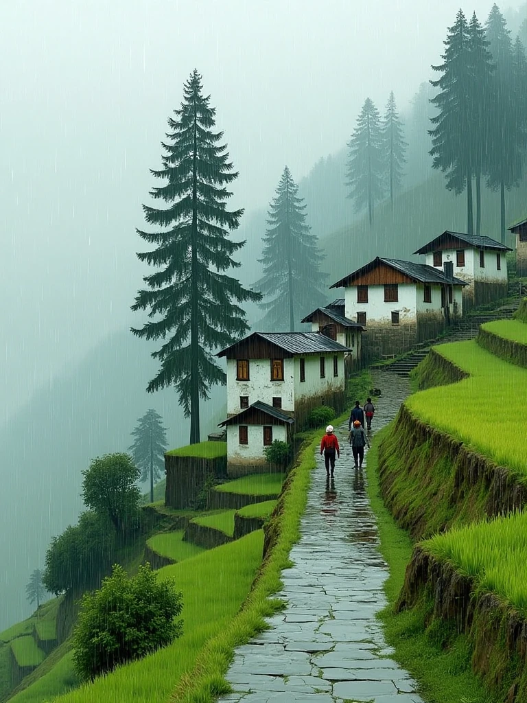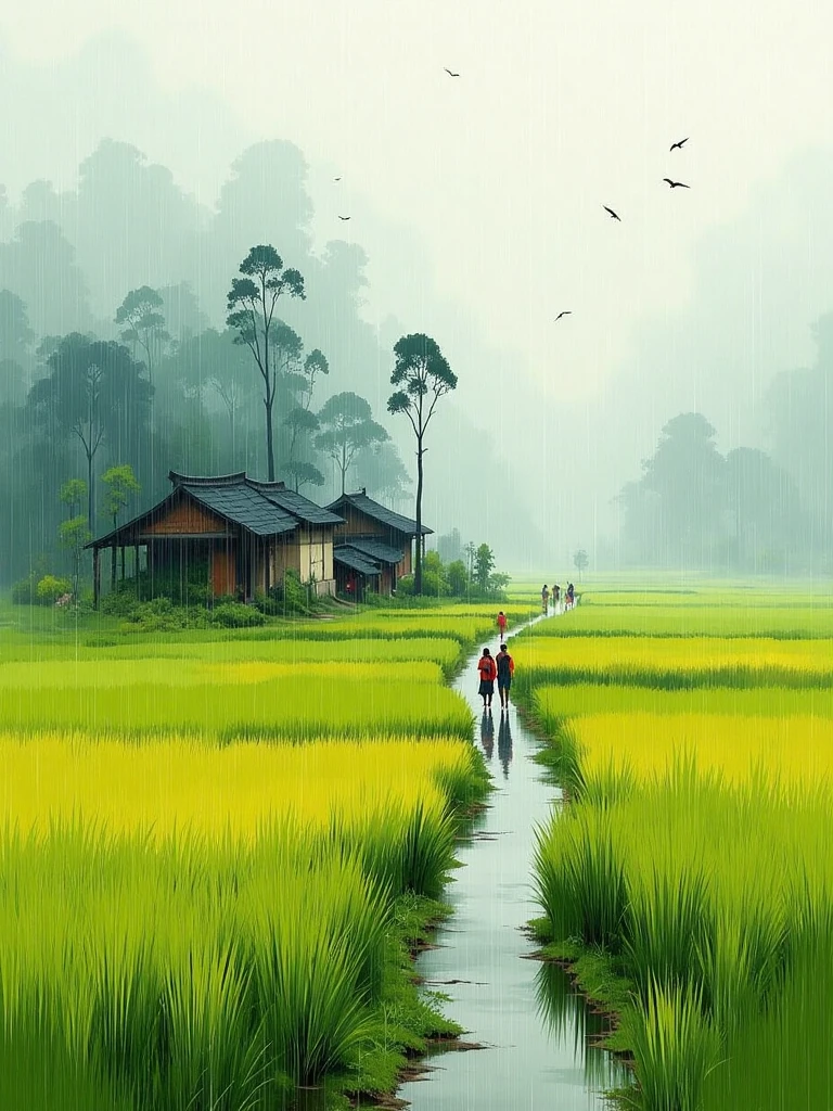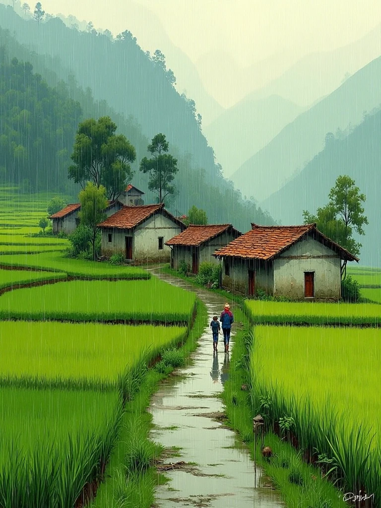Rural landscape with lush green fields and houses, soft rain adding mist, paths winding, figures strolling, oil painting texture, tranquil vibe.