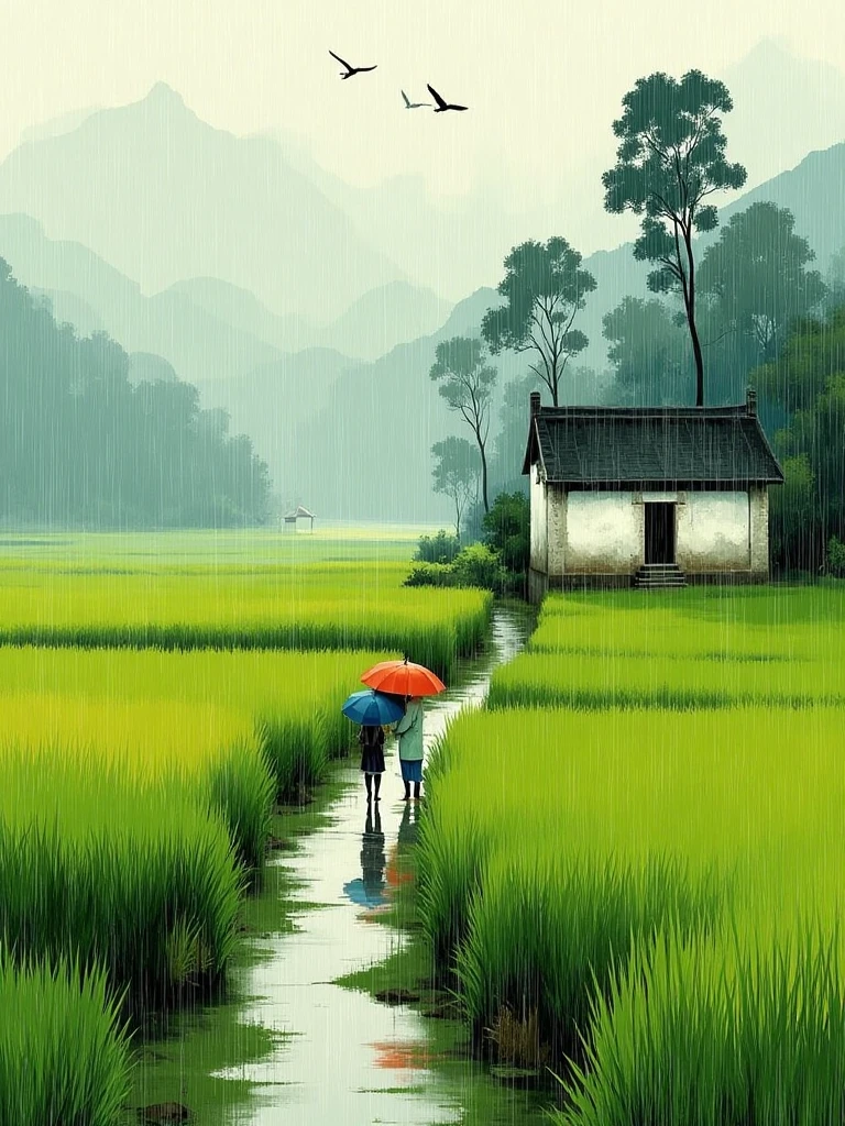 Rural landscape with lush green fields and houses, gentle breeze swaying crops, distant mountains hazy, simple folk walking, ink - wash art.