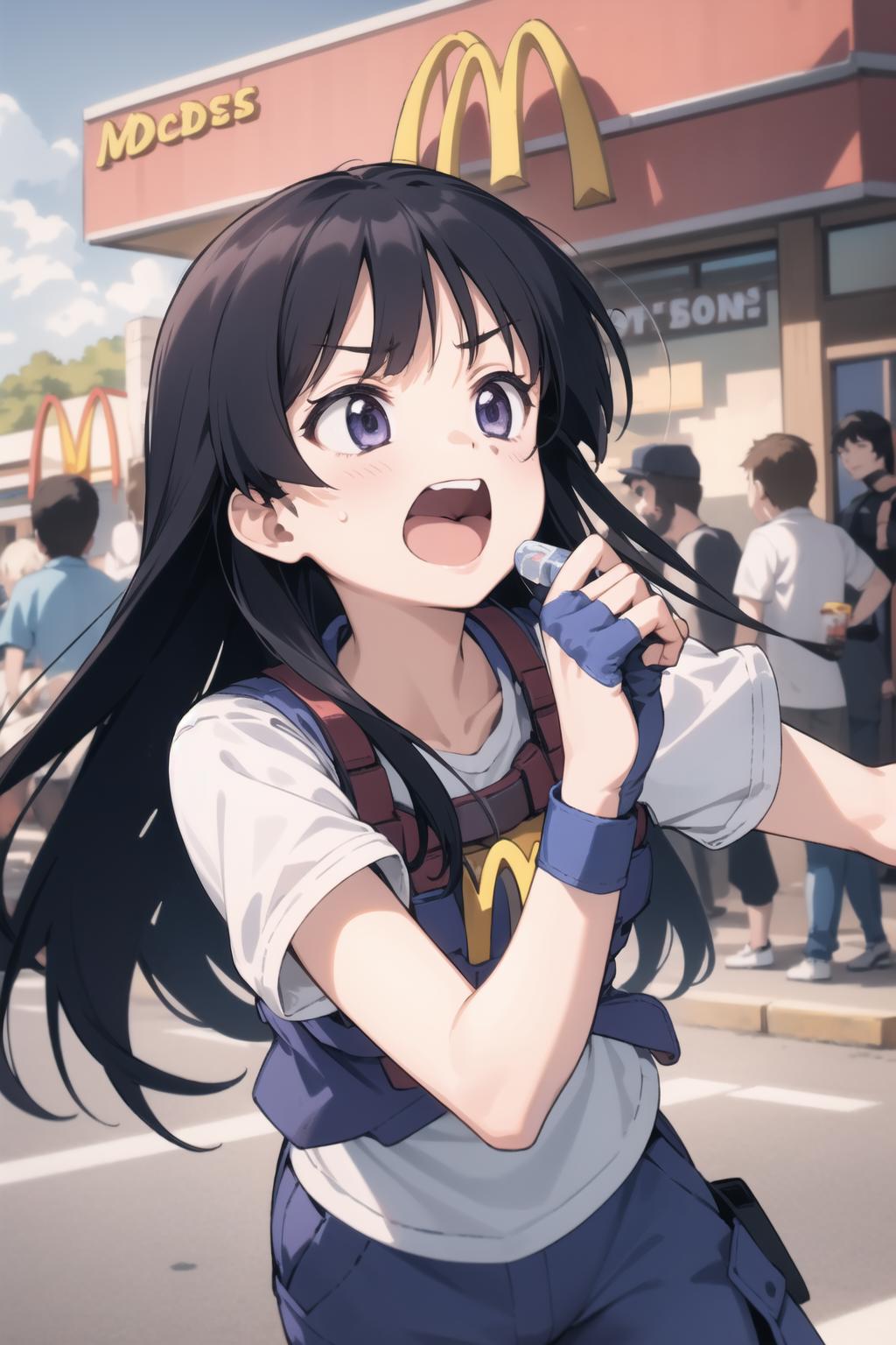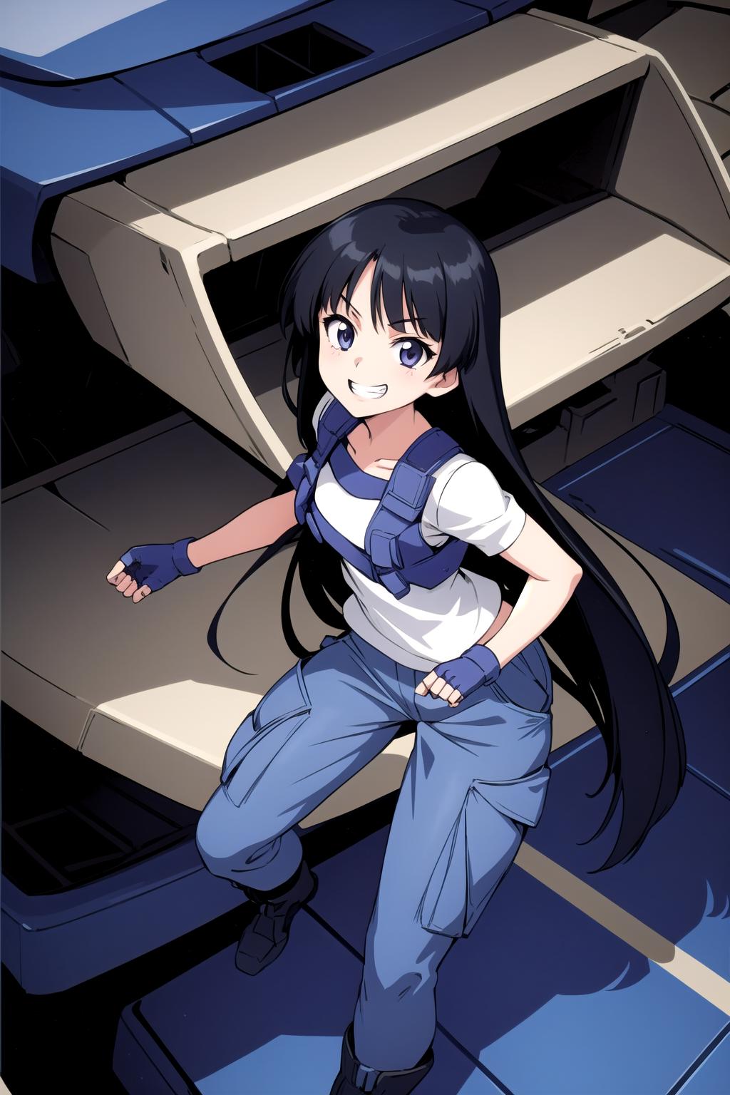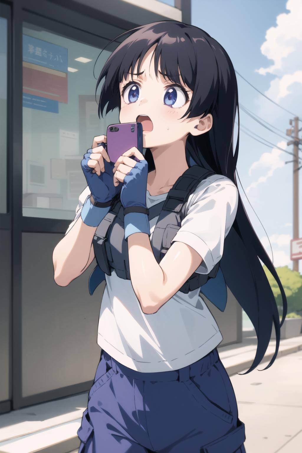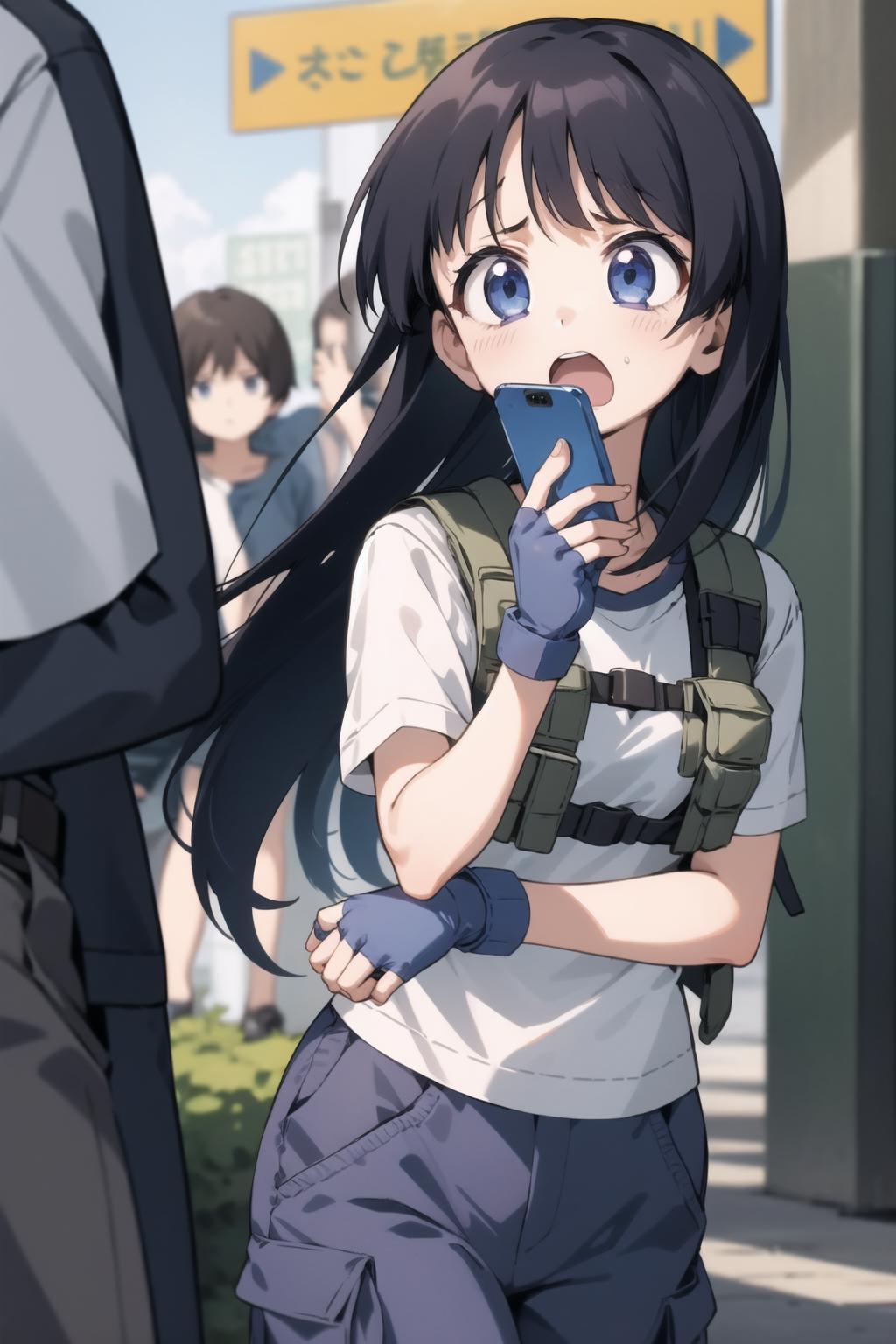 cropped vest, white shirt, short sleeves, cargo pants, fingerless gloves