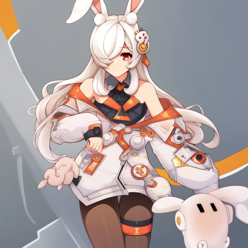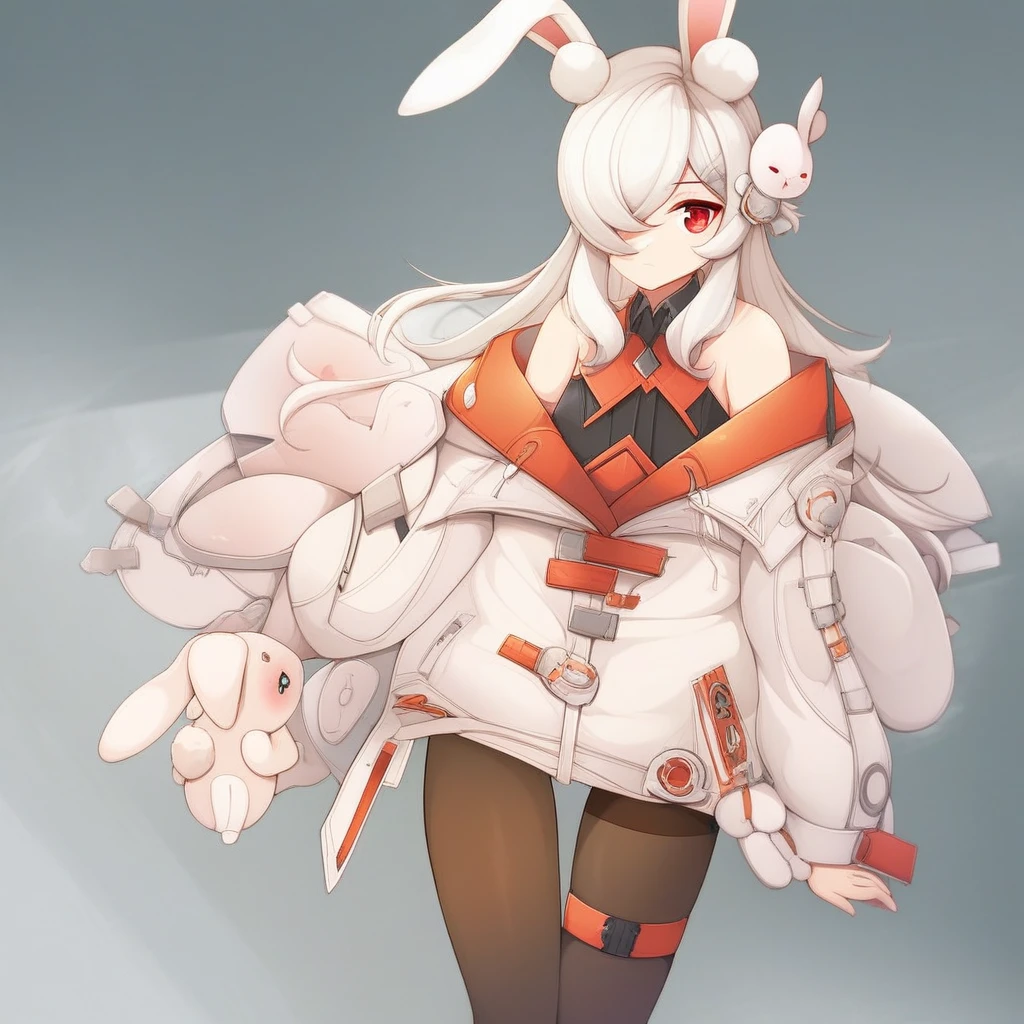k1ra-ft, 1girl, animal ears, rabbit ears, red eyes, hair over one eye, long hair, jacket, white hair, off shoulder, pantyhose, thigh strap, bangs, white jacket, hair ornament, rabbit girl, bare shoulders
