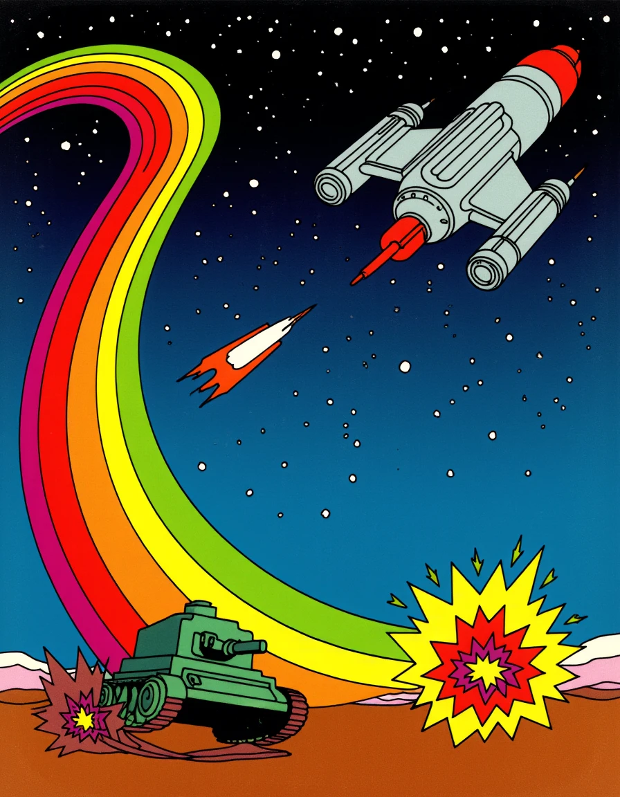 a game cover of a spaceship firing on other ship with colorful trail spiral next to orange asteroids in the style of vintage-activision