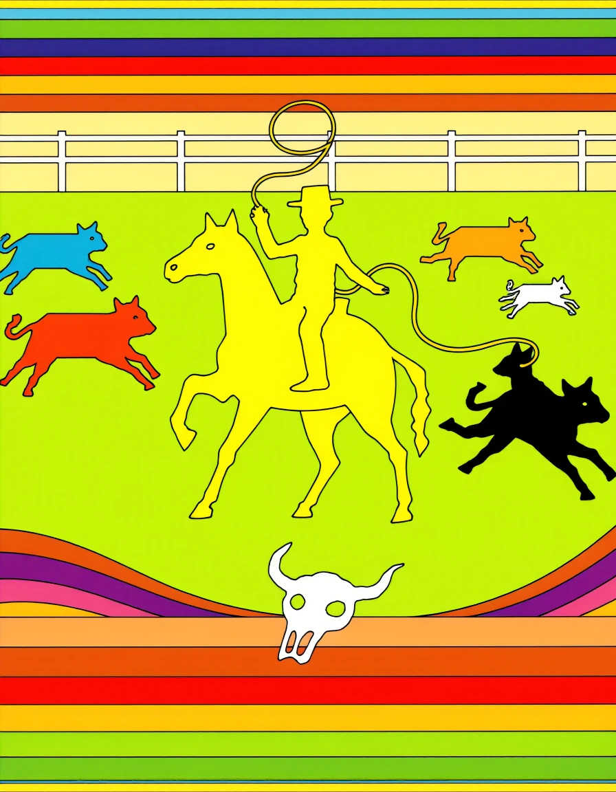 a game cover of a yellow silhouette man with a lasso on horse with cow and a skull and a fence with a colorful trail under the lasso in the style of vintage-activision